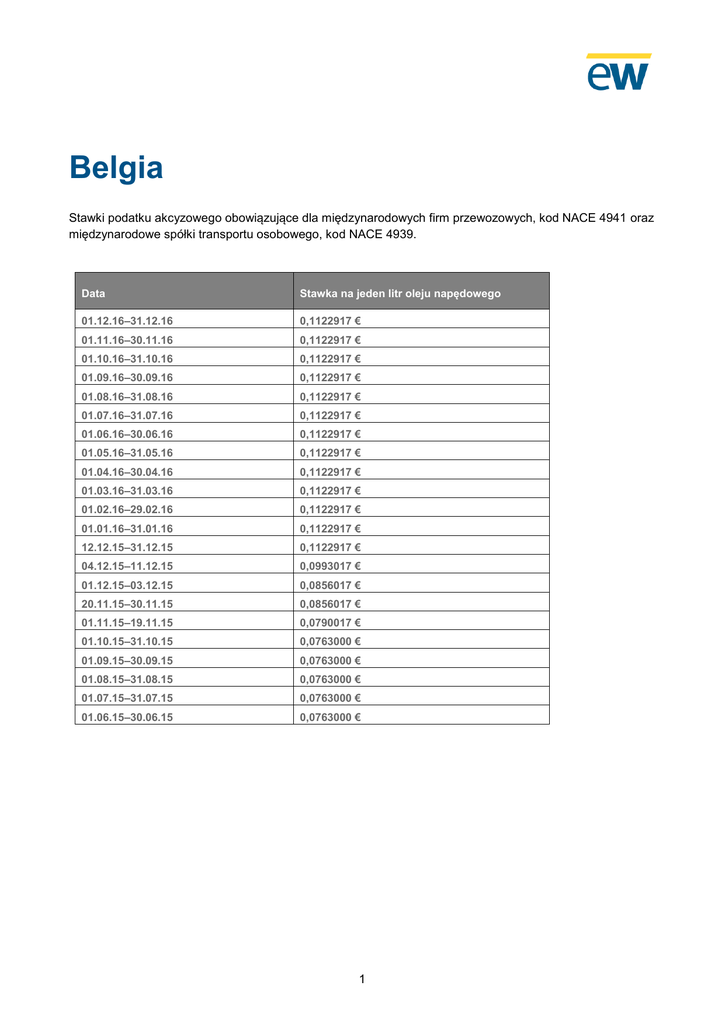 Belgia Stawki podatku akcyzowego obowiązujące dla międzynarodowych firm przewozowych, kod NACE 4941 oraz międzynarodowe spółki transportu osobowego, kod NACE 4939. Data Stawka na jeden litr oleju napędowego 01.12.16–31.12.16 0,1122917 € 01.11.16–30.11.16 0,1122917 € 01.10.16–31.10.16 0,1122917 € 01.09.16–30.09.16 0,1122917 € 01.08.16–31.08.16 0,1122917 € 01.07.16–31.07.16 0,1122917 € 01.06.16–30.06.16 0,1122917 € 01.05.16–31.05.16 0,1122917 € 01.04.16–30.04.16 0,1122917 € 01.03.16–31.03.16 0,1122917 € 01.02.16–29.02.16 0,1122917 € 01.01.16–31.01.16 0,1122917 € 12.12.15–31.12.15 0,1122917 € 04.12.15–11.12.15 0,0993017 € 01.12.15–03.12.15 0,0856017 € 20.11.15–30.11.15 0,0856017 € 01.11.15–19.11.15 0,0790017 € 01.10.15–31.10.15 0,0763000 € 01.09.15–30.09.15 0,0763000 € 01.08.15–31.08.15 0,0763000 € 01.07.15–31.07.15 0,0763000 € 01.06.15–30.06.15 0,0763000 € 1 Francja Stawki podatku akcyzowego obowiązujące dla międzynarodowych firm przewozowych, kod NACE 4941. Corse Regiony et Poitou– Charentes Stawka/100 l oleju napędowego Île–de–France Rhône–Alpes et PACA Stawka/100 l Pozostałe regiony *Stawka średnia Stawka/100 l oleju Stawka/100 l oleju Stawka/100 l oleju oleju napędowego napędowego napędowego napędowego 1. półrocze 2016 5,47 € 7,97 € 7,97 € 7,97 € 7,86 € 2. półrocze 2015 2,48 € 4,98 € 4,98 € 4,98 € 4,87 € 1. półrocze 2015 2,48 € 4,98 € 4,98 € 4,98 € 4,87 € 2. półrocze 2014 2,5 € 5€ 5€ 5€ 4,89 € 1. półrocze 2014 2,5 € 5€ 5€ 5€ 4,89 € 2. półrocze 2013 2,5 € 5€ 3,65 € 5€ 4,74 € * Stawkę średnią stosuje się, jeżeli wzrost występuje przynajmniej w trzech regionach. Stawki podatku akcyzowego obowiązujące dla międzynarodowych spółek transportu osobowego, kod NACE 4939. Corse Regiony ez Poitou– Charentes Stawka/100 l oleju napędowego Île–de–France Rhône–Alpes et PACA Stawka/100 l Pozostałe regiony *Stawka średnia Stawka/100 l oleju Stawka/100 l oleju Stawka/100 l oleju oleju napędowego napędowego napędowego napędowego 1. półrocze 2016 9,47 € 11,97 € 11,97 € 11,97 € 11,86 € 2. półrocze 2015 6,48 € 8,98 € 8,98 € 8,98 € 8,87 € 1. półrocze 2015 6,48 € 8,98 € 8,98 € 8,98 € 8,87 € 2. półrocze 2014 2,5 € 5€ 5€ 5€ 4,89 € 1. półrocze 2014 2,5 € 5€ 5€ 5€ 4,89 € 2. półrocze 2013 2,5 € 5€ 3,65 € 5€ 4,74 € * Stawkę średnią stosuje się, jeżeli wzrost występuje przynajmniej w trzech regionach. 2 Włochy Stawki podatku akcyzowego obowiązujące dla międzynarodowych firm przewozowych, kod NACE 4941. Data Stawka na jeden litr oleju napędowego 01.01.16–31.03.16 0,21418609 € 01.10.15–31.12.15 0,21418609 € 01.07.15–30.09.15 0,21418609 € 01.04.15–30.06.15 0,21418609 € 01.01.15–31.03.15 0,21418609 € 01.10.14–31.12.14 0,21658609 € 01.07.14–30.09.14 0,21658609 € 01.04.14–30.06.14 0,21658609 € Słowenia Stawki podatku akcyzowego obowiązujące dla międzynarodowych firm przewozowych, kod NACE 4941 oraz międzynarodowych spółek transportu osobowego, kod NACE 4939. Data Stawka na jeden litr oleju napędowego Kwiecień 2016 0,09605 € Marzec 2016 0,09605 € Luty 2016 0,09575 € Styczeń 2016 0,08746 € Grudzień 2015 0,08746 € Listopad 2015 0,08746 € Październik 2015 0,08746 € Wrzesień 2015 0,08746 € Sierpień 2015 0,08674 € Lipiec 2015 0,07998 € Czerwiec 2015 0,07998 € 3 Hiszpania Stawki podatku akcyzowego i podatków regionalnych dla międzynarodowych firm przewozowych, kod NACE 4941. Stawka akcyzy: Na dzień 1 stycznia 2012 r.: 0,001 € na jeden litr oleju napędowego Podatek regionalny Stawka na jeden litr oleju Region Ważny od Andalucia 01.01.2016 Aragón 01.01.2016 Asturias n/a Beleares n/a Castilla la Mancha n/a Castilla León 01.01.2015–31.12.2015 Cataluña 31.01.2014 Extremadura n/a Galicia 01.01.2015 Madrid 01.01.2014 Murcia n/a Navarra 01.01.2016 Valencia n/a napędowego 0,048 € 0,024 € 0,040 € 0,048 € 0,048 € 0,016 € 0,048 € 0,0384 € 0,048 € 0,017 € 0,048 € 0,024 € 0,048 € Węgry Stawki podatku akcyzowego obowiązujące dla międzynarodowych firm przewozowych, kod NACE 4941 oraz międzynarodowych spółek transportu osobowego, kod NACE 4939. Data Stawka za litr oleju napędowego 01.01.2016 7 HUF 01.01.2015–31.12.2015 11 HUF 4