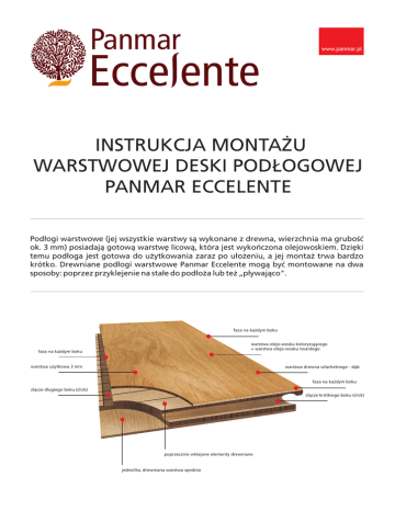 Panmar www.panmar.pl INSTRUKCJA MONTAŻU WARSTWOWEJ DESKI PODŁOGOWEJ PANMAR ECCELENTE Podłogi warstwowe (jej wszystkie warstwy są wykonane z drewna, wierzchnia ma grubość ok. 3 mm) posiadają gotową warstwę licową, która jest wykończona olejowoskiem. Dzięki temu podłoga jest gotowa do użytkowania zaraz po ułożeniu, a jej montaż trwa bardzo krótko. Drewniane podłogi warstwowe Panmar Eccelente mogą być montowane na dwa sposoby: poprzez przyklejenie na stałe do podłoża lub też „pływająco". faza na każdym boku warstwa olejo-wosku koloryzującego + warstwa olejo-wosku twardego faza na każdym boku warstwa użytkowa 3 mm warstwa drewna szlachetnego - dąb faza na każdym boku złącze długiego boku (click) złącze krótkiego boku (click) poprzecznie wklejone elementy drewniane jednolita, drewniana warstwa spodnia Panmar www.panmar.pl POMIESZCZENIE I PRACE PRZYGOTOWAWCZE W nowo budowanych czy też gruntownie remontowanych obiektach montaż podłogi warstwowej, podobnie jak parkietu powinien być ostatnią pracą wykończeniową. Tynkowanie, malowanie, montaż stolarki okiennej trzeba zakończyć wcześniej, tak aby w pomieszczeniu ustabilizowały się warunki temperaturowe i wilgotnościowe. Parkiet panelowy można układać na różnorodnych twardych podłożach, takich jak: beton, anhydryt, stara podłoga drewniana, płytki ceramiczne, PVC itp. Miękkie podłoże, takie jak wykładziny podłogowe wszelkiego typu, muszą zostać usunięte. Podłoże powinno mieć przede wszystkim odpowiednią wilgotność, być równe, czyste, pozbawione wszelkich antyadhezyjnych elementów. W przypadku przyklejania elementów bezpośrednio do podłoża, należy je zagruntować odpowiednim środkiem. Nie wolno też zapominać o pozostawieniu dylatacji przy ścianach, drzwiach i miejscach przejść rur, np. od instalacji grzewczych. Od momentu przywiezienia desek na miejsce instalacji do czasu rozpoczęcia prac monterskich musi upłynąć minimum 48 godzin. W tym czasie ich parametry cieplnowilgotnościowe stabilizują się i aklimatyzują do parametrów otoczenia, w którym mają być montowane. Podczas montażu całkowite wymiary kładzionej podłogi nie powinny przekroczyć 6 metrów szerokości i 20 metrów długości. W przeciwnym razie należy pomiędzy poszczególnymi powierzchniami pozostawić szczeliny dylatacyjne. Kładąc podłogę należy również oddzielić poszczególne pomieszczenia i/lub asymetryczne powierzchnie w jednym pomieszczeniu. Przed rozpoczęciem montażu należy otworzyć paczki i dokładnie obejrzeć deski. Zaleca się aby te czynności wykonywać w świetle dziennym. Przed i w trakcie układania należy kontrolować stan elementów. Bezpośrednio po rozpakowaniu należy dokonać pomiaru wilgotności deski. Jeżeli wilgotność nie będzie odpowiadała następującym normą 9 +/- 2% wilgotności względnej drewna nie należy rozpakowywać pozostałych opakowań. Tylko zabezpieczony oryginalnie produkt (zapakowany w folie) może być podstawą do rozpatrzenia reklamacji wilgotnościowej przez producenta. Układanie podłogi i jej eksploatacja powinna odbywać się przy wilgotności względnej powietrza w przedziale od 45 do 55% i temperaturze otoczenia od +18 do 24 oC. Niezależnie od sposobu montażu podłogi wilgotność podłoża powinna wynosić: dla podłoża cementowego do 1,8%, dla podłoża anhydrytowego (wylewki gipsowe) do 0,5%, dla podłoża drewnianego do 7-9%.wilgotności względnej drewna. W celu wykonania pomiarów wilgotności podłoża oraz oceny jego wytrzymałości zalecamy skorzystać z usług profesjonalnych firm parkieciarskich, dysponujących odpowiednimi narzędziami do ich wykonywania. Badanie podłoża powinno zostać potwierdzone odpowiednim protokołem. 45-55% o 18-24 C Panmar www.panmar.pl MONTAŻ PODŁOGI: SYSTEM PŁYWAJĄCY W przypadku montażu podłogi w systemie pływającym na folii polietylenowej musimy ułożyć warstwę podkładową. Do tego celu możemy użyć specjalnych płyt z włókna drzewnego, korka (mata korkowa) lub tektury falistej krawędziami na styk. Zadaniem warstwy podkładowej jest wyrównanie drobnych nierówności podłoża, poprawa parametrów cieplnych i akustycznych użytkowanej podłogi. W przypadku naturalnego korka lub płyt z włókna drzewnego należy zostawić pomiędzy nimi 2 mm odstępu oraz pomiędzy płytami a ścianą 10 mm. Należy pamiętać o zachowaniu przesunięcia pomiędzy końcami desek w sąsiadujących pasach podłogi min 200 mm. Przy montażu deski nie stosować pasów ściągających. Szerokość wymaganej szczeliny dylatacyjnej wynosi min 15 mm. Dodatkowo zaleca się, aby na wszystkie podłoża, na których montowana będzie drewniana podłoga pływająca położyć izolacje przeciwwilgociową z folii polietylenowej o grubości min. 0,2 mm. Złącza pasów folii powinny być łączone na zakładkę min. 20 cm i sklejone taśmą klejącą. MONTAŻ PODŁOGI: KLEJENIE DO PODŁOŻA Drugim sposobem montażu warstwowych desek podłogowych jest ich klejenie do podłoża. Przy klejeniu desek obowiązują te same zasady doboru kierunku montażu, klimatyzowania desek oraz wykonywania obliczeń jak przy montażu w systemie pływającym. Podłoże musi być suche, spójne i odkurzone. Musi też spełniać odpowiednie parametry wytrzymałościowe: wytrzymałość na odrywanie minimum 1 MPa, wytrzymałość na ściskanie minimum 25 MPa. Takiego pomiaru może dokonać specjalistyczna firma parkieciarska lub w przypadku kiedy wylewka wykonywana jest z workowanej sypkiej zaprawy, możemy na opakowaniu odczytać jej parametry wytrzymałościowe. Na wcześniej zagruntowane podłoże rozprowadzamy klej za pomocą pacy trapezowej. Klej musi pokrywać równomiernie minimum 80% powierzchni deski. Do klejenia dopuszcza się wyłącznie kleje jedno- lub dwuskładnikowe. Nie wolno stosować klejów dyspersyjnych gdzie rozpuszczalnikiem jest woda (pod wpływem wody drewno zmieni wymiary). Najlepiej 
