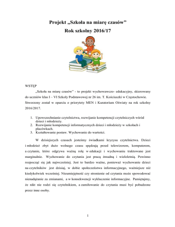 Projekt „Szkoła na miarę czasów” Rok szkolny 2016/17 WSTĘP „Szkoła na miarę czasów” - to projekt wychowawczo- edukacyjny, skierowany do uczniów klas I – VI Szkoły Podstawowej nr 26 im. T. Kościuszki w Częstochowie. Stworzony został w oparciu o priorytety MEN i Kuratorium Oświaty na rok szkolny 2016/2017. 1. Upowszechnianie czytelnictwa, rozwijanie kompetencji czytelniczych wśród dzieci i młodzieży. 2. Rozwijanie kompetencji informatycznych dzieci i młodzieży w szkołach i placówkach. 3. Kształtowanie postaw. Wychowanie do wartości. W dzisiejszych czasach jesteśmy świadkami kryzysu czytelnictwa. Dzieci i młodzież zbyt dużo wolnego czasu spędzają przed telewizorem, komputerem, a czytanie, które odgrywa ważną rolę w edukacji i wychowaniu traktowane jest marginalnie. Wychowanie do czytania jest pracą żmudną i wieloletnią. Powinno rozpocząć się jak najwcześniej. Jest to bardzo ważne, ponieważ wychowanie dzieci na czytelników jest dzisiaj, w dobie społeczeństwa informacyjnego, ważniejsze niż kiedykolwiek wcześniej. Nieumiejętność czy stronienie od czytania może spowodować nienadążanie za zmianami, a w konsekwencji wykluczenie informacyjne. Pamiętajmy, że nikt nie rodzi się czytelnikiem, a zamiłowanie do czytania musi być pobudzone przez inne osoby. 1 CELE PROJEKTU CELE GŁÓWNE: 1. PROMOCJA LITERATURY I CZYTELNICTWA WŚRÓD UCZNIÓW Założeniem projektu jest kształcenie nawyków czytelniczych uczniów, rozwijanie i poszerzanie wiedzy o świecie, wspomaganie rozwoju emocjonalnego i moralnego dzieci oraz kształtowanie postaw dziecka. CELE SZCZEGÓŁOWE: zachęcanie uczniów do sięgania po literaturę piękną i książki popularnonaukowe, poprawa stanu czytelnictwa w szkole, rozwijanie wyobraźni dziecięcej, odwoływanie się do dziecięcych uczuć i wrażliwości, przygotowanie do poszukiwania potrzebnych informacji i materiałów, doskonalenie umiejętności językowych, wyrabianie nawyków pożytecznego spędzania wolnego czasu, wspomaganie rozwoju emocjonalnego, dostarczanie pozytywnych przeżyć, budowanie poczucia własnej wartości, uczenie wartości moralnych, zapobieganie uzależnieniom od telewizji i komputerów, rozwijanie zainteresowań – literackich, przyrodniczych, geograficznych itp., poznanie historii pisma, materiałów pisarskich, form książki, urządzeń służących komunikacji i ich roli w rozwoju cywilizacji, uświadomienie rodzicom roli książki i nawyku czytania w procesie edukacji i życiu dziecka. 2. INTEGROWANIE TECHNOLOGII Z KSZTAŁCENIEM I WŁASNYM ROZWOJEM. CELE SZCZEGÓŁOWE: - zachęcanie uczniów do poszukiwania potrzebnych informacji i wiadomości w Internecie, 2 - motywowanie uczniów do opracowania tematów na komputerze, z wykorzystaniem znanych im programów, - umiejętność rozwiązywania problemów i podejmowania decyzji - rozwijanie twórczego i krytycznego myślenia, - doskonalenie umiejętności komunikacyjnych oraz współpracy w grupie, - rozbudzanie intelektualnej ciekawości, - doskonalenie umiejętności wyszukiwania, selekcji, porządkowania i oceniania informacji, - wykorzystywanie wiedzy w nowych sytuacjach, - rozwijanie pozytywnych cech osobowych ucznia ( kultura, dobroć, szacunek dla człowieka), - przygotowanie ucznia do podejmowania świadomych decyzji, - przygotowanie ucznia do sumiennego i odpowiedzialnego wykonywania powierzonej mu pracy, - przygotowanie ucznia do świadomego i czynnego udziału w życiu społecznym i obywatelskim 3 ZADANIA DO REALIZACJI DLA WYCHOWAWCÓW KLAS: Wrzesień 2016r. Wystawa miniatur książkowych Klasy II- VI 1. Tworzymy dekalog książek ( 10 zasad korzystania i szanowania książek i podręczników, opracowanie komputerowe) Klasy IV- VI 1. Biblioteka zaprasza- tworzenie zaproszenia do szkolnej biblioteki, konkurs międzyklasowy (do 28 IX) Październik 2016r. Tworzymy giełdę wymiany książek Klasy II- III 1. Tworzymy klasowe „ Ogródki Czytelnicze”- konkurs międzyklasowy na najładniej i najciekawiej urządzony klasowy kącik czytelniczy ( na 14 X) Klasy IV- VI 1. Dekorujemy klasy w„Wiszące książki”- konkurs międzyklasowy ( na 14 X) Klasy II- VI 2. Flash mob z książką. ( 20 X cała szkoła w tym samym czasie czyta ulubione ksiązki) Listopad 2016 r. Listopadowy maraton czytelniczy książek o treści patriotycznej( 14 XI, uczniowie kl. IVVI czytają klasom I- III, a nauczyciele czytają uczniom klas IV- VI) Klasy II- III 1. Dzień Niepodległości w oczach dziecka-( konkurs plastyczny, technika dowolna, do 11 XI) Klasy IV- VI 1. W poszukiwaniu autorytetów i wartości ( lekcja wych. w oparciu o podany scenariusz) 2. Konkurs na Exlibris Biblioteki Szkolnej SP 26 ( opracowania komputerowe, odpowiedzialni wychowawcy, do końca listopada). Grudzień 2016 r. Klasy II- VI 1. Urodziłem się z miłości do miłości ( lekcja wychowawcze w oparciu o podany scenariusz, wszyscy prowadzą 8 XII ). Luty 2017 r. Warsztaty introligatorskie, 21 II Dzień Języka Ojczystego Klasy II- VI 1. W pewnej współczesnej rodzinie- bajka metaforyczna. ( wychowawcy sami opracują scenariusz w oparciu o dostarczony tekst bajki). 1. Konkurs kaligraficzny o Złotą Stalówkę dyrektora szkoły ( konkurs dla chętnych uczniów, odpowiedzialni wychowawcy, w oparciu o przygotowany regulamin). Do 17 II, finał 21II 4 Marzec 2017 r. Wycieczka do drukarni. Urodziny SP 26 ( profilaktyka uzależnień) Klasy II- VI 1. Międzyklasowy konkurs na ilustrację do książki ( malowanie na rolce papieru) Klasy IV- VI 1. Zajęcia prowadzone przez pedagoga, dotyczące problematyki uzależnień wśród dzieci i młodzieży. (po wcześniejszym ustaleniu terminu z wychowawcami) Kwiecień 2017 r. Wystawa książek z autografami, na 23 IV Klasy II - III 1. Zajęcia prowadzone przez pedagoga na temat: „ Każdy z nas jest wartościowy, czyli poznajemy nasze zalety” (po wcześniejszym ustaleniu terminu z wychowawcą). Klasy IV-VI 1. Tolerancyjny nie znaczy obo