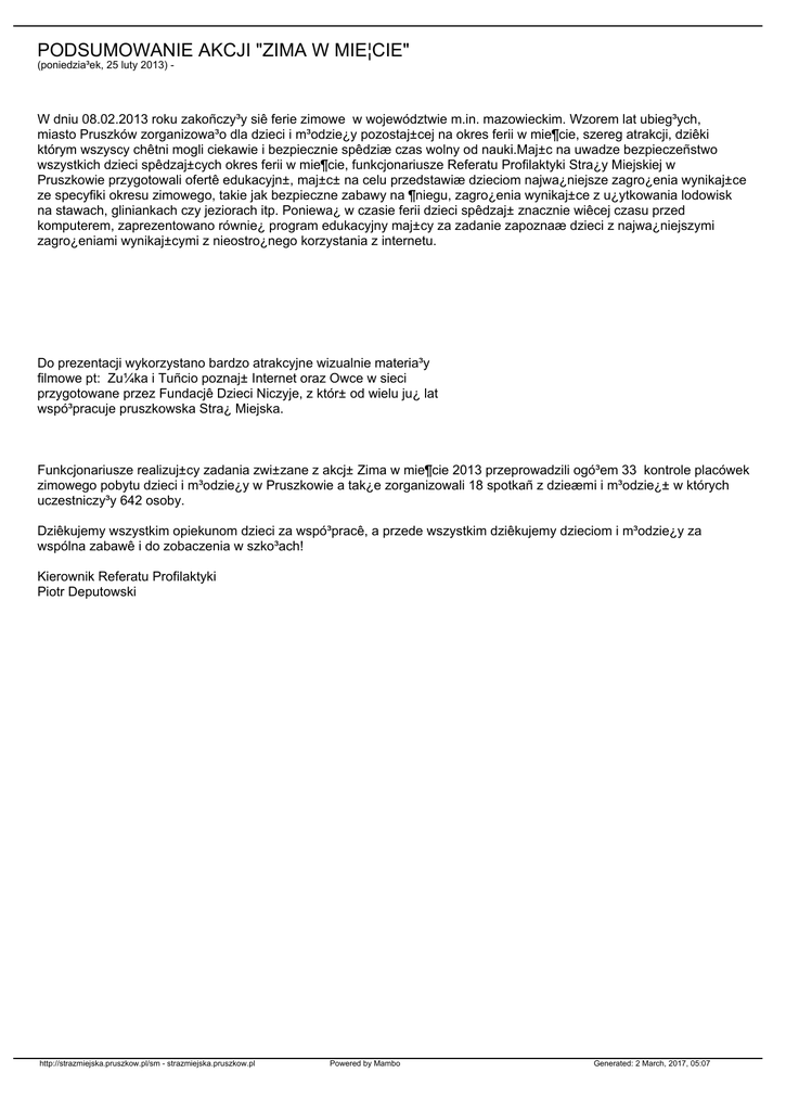 PODSUMOWANIE AKCJI "ZIMA W MIE¦CIE" (poniedzia³ek, 25 luty 2013) - W dniu 08.02.2013 roku zakoñczy³y siê ferie zimowe w województwie m.in. mazowieckim. Wzorem lat ubieg³ych, miasto Pruszków zorganizowa³o dla dzieci i m³odzie¿y pozostaj±cej na okres ferii w mie¶cie, szereg atrakcji, dziêki którym wszyscy chêtni mogli ciekawie i bezpiecznie spêdziæ czas wolny od nauki.Maj±c na uwadze bezpieczeñstwo wszystkich dzieci spêdzaj±cych okres ferii w mie¶cie, funkcjonariusze Referatu Profilaktyki Stra¿y Miejskiej w Pruszkowie przygotowali ofertê edukacyjn±, maj±c± na celu przedstawiæ dzieciom najwa¿niejsze zagro¿enia wynikaj±ce ze specyfiki okresu zimowego, takie jak bezpieczne zabawy na ¶niegu, zagro¿enia wynikaj±ce z u¿ytkowania lodowisk na stawach, gliniankach czy jeziorach itp. Poniewa¿ w czasie ferii dzieci spêdzaj± znacznie wiêcej czasu przed komputerem, zaprezentowano równie¿ program edukacyjny maj±cy za zadanie zapoznaæ dzieci z najwa¿niejszymi zagro¿eniami wynikaj±cymi z nieostro¿nego korzystania z internetu. Do prezentacji wykorzystano bardzo atrakcyjne wizualnie materia³y filmowe pt: Zu¼ka i Tuñcio poznaj± Internet oraz Owce w sieci przygotowane przez Fundacjê Dzieci Niczyje, z któr± od wielu ju¿ lat wspó³pracuje pruszkowska Stra¿ Miejska. Funkcjonariusze realizuj±cy zadania zwi±zane z akcj± Zima w mie¶cie 2013 przeprowadzili ogó³em 33 kontrole placówek zimowego pobytu dzieci i m³odzie¿y w Pruszkowie a tak¿e zorganizowali 18 spotkañ z dzieæmi i m³odzie¿± w których uczestniczy³y 642 osoby. Dziêkujemy wszystkim opiekunom dzieci za wspó³pracê, a przede wszystkim dziêkujemy dzieciom i m³odzie¿y za wspólna zabawê i do zobaczenia w szko³ach! Kierownik Referatu Profilaktyki Piotr Deputowski http://strazmiejska.pruszkow.pl/sm - strazmiejska.pruszkow.pl Powered by Mambo Generated: 2 March, 2017, 05:07