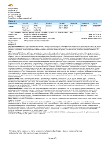 Butryn Travel Kosciuszki 5E 82-200 Malbork Tel: 55 272 08 08 Fax: 55 272 08 09 E-mail: [email protected] Oferta 1 Organizator Kierunek Hotel Wyjazd Termin Kategoria Chorwacja Wille Gdańsk 30.05.2014 Dalmacja Prywatne 09.06.2014 Południowa Makarska * Cena całkowita: Dorosły: 891.00 PLN (04.03.1984) Dorosły: 891.00 PLN (04.03.1984) Podróż tam: Wyjazd z: Gdańsk do Makarska Powrót: Wyjazd z: Makarska do Gdańsk Zakwaterowanie: Pokój 2 osobowy z możliwością dostawki. Wyżywienie: Wyżywienie we własnym zakresie Cena za os. 891 PLN Suma 1782 PLN* dnia: 30.05.2014 dnia: 10.06.2014 Hotel w mieście: Makarska Hotel: Pokój Kategoria: 2 Opis zakwaterowania: Położenie Znajdują się w prywatnych willach zlokalizowanych w dzielnicy Zelenka, oddalonych od 600 do 800 m do plaży. W pobliżu budynków znajduje się market, kawiarnie i stragany z owocami. Zakwaterowanie Pokoje dwu-, trzy-, czteroosobowe z węzłem sanitarnym oraz dostępem do aneksu kuchennego, znajdującego się w budynku (kuchenka gazowa lub elektryczna, garnki, naczynia, sztućce). Większość pokoi posiada balkon lub taras. Opis miejscowości: Makarska - gdzie góry spotykają się z morzem... Chorwacja zadowoli nawet najwybredniejszych turystów, którzy spragnieni słońca i kąpieli morskich, chcieliby również podziwiać górskie krajobrazy. Jedną z miejscowości, która gwarantuje takie atrakcje, jest leżąca w Dalmacji Środkowej Makarska. Położona między pasmem górskim Biokovo a Adriatykiem ujmuje gościnnością, a jej bogata historia wypełnia niemal każdy zakątek miasta, zachęcając do czynnego wypoczynku i długich spacerów. Możliwość łączenia różnych form aktywności to bardzo istotny atut tej nadmorskiej miejscowości. Plaże Piękna, nieco kamienista plaża o nazwie Donja Luka, na skraju lasu piniowego rozciąga się na szerokości 1500 metrów z malowniczymi zatoczkami. Niewątpliwe wrażenie robią dwie nadmorskie promenady palmowe, otoczone sklepikami, barami i kawiarniami. Kuchnia Na wybrzeżu kraju króluje kuchnia śródziemnomorska - pełna ryb, owoców morza, winogron, ziół, przypraw oraz oliwy z oliwek. Chociaż podstawową zupą jest rosół z kury i wołowiny, podawany z makaronem własnej roboty, to Chorwaci chętnie zjadają latem lekką zupę ogórkową, z kapusty włoskiej lub fasoli szparagowej. Z mięs najwięcej zjada się baraniny i jagnięciny, choć grzechem byłoby nie spróbować wędzonej wieprzowiny konserwowanej w smalcu czy polędwicy wieprzowej z suszonymi śliwkami w sosie śmietanowym. Nocne życie Wychodząc wieczorami na ulice centrum miasta ciężko liczyć na chwile spokoju, a tym bardziej nudy. życie nocne wciąga wszystkich śmiałków. Znajduje się tu kilka dyskotek sławna Deep (także Grotta), ulokowana w prawdziwej jaskini na skalistym wybrzeżu półwyspu Sv. Peta w centrum miasta, stara Opera, którą zmieniono w “Peter Pan Club" oraz Disco Plaža - to zaledwie te najbardziej znane. Sport i rekreacja Znajdują się tu boiska do piłki nożnej, koszykowej, rugby, piłki ręcznej, atletyki oraz korty tenisowe. W ostatnich latach zwiększa się zainteresowanie dla sportów ekstremalnych paragliding, wspinaczki sportowe, wspinaczki górskie, kolarstwo górskie, windsurfing, nurkowanie, parasailing, trekking i speleologia. Program ramowy: Dzień 1 - Wyjazd z Polski zgodnie z rozkładem jazdy autokarów. Przejazd przez Czechy, Austrię, Słowenię. Dzień 2 - Przyjazd do Makarskiej w godzinach porannych. Czas wolny. Zakwaterowanie. Dzień 3-11 - Pobyt na miejscu. Możliwość korzystania z dodatkowych wycieczek fakultatywnych, np. Dubrownik, Split i Trogir, Park Narodowy Krka, Jeziora Plitvickie, Medugorije + Mostar, Rejs statkiem na Hvar (Vrboska) i Brac (Bol) Fish Picnic, Park Przyrody Biokovo. Dzień 11 - Wykwaterowanie do godziny 9.00. Czas wolny. Wyjazd do Polski w godzinach wieczornych. Przejazd przez Słowenię, Austrię, Czechy. Dzień 12 - Przyjazd do Polski - przekroczenie granicy na południu Polski w godzinach popołudniowych. Przyjazd do centralnej części kraju w godzinach wieczornych. Informacje dodatkowe: - dziecko 0-2 lat (bez świadczeń hotelowych) płaci 400 zł - dojazd własny -150 zł - daty pobytu przy dojeździe własnym to 1 dzień po katalogowej dacie rozpoczęcia imprezy i 1 dzień przed katalogowym dniem zakończenia imprezy, np. (CH1) 17.06 - 28.06, pobyt na miejscu 18.06 27.06 - dokumenty - paszport lub dowód osobisty (zgodnie z obowiązującymi przepisami) - ubezpieczenie - oznaczenia (KL) koszty leczenia, (NNW) następstw nieszczęśliwych wypadków, (BP) bagaż podróżny (utrata) - aneks kuchenny o podstawowym wyposażeniu (lodówka, kuchenka gazowa lub elektryczna, garnki, naczynia, sztućce) - należy posiadać własne ręczniki i środki czystości - oferta obejmuje sprzątanie początkowe i końcowe; w czasie pobytu sprzątanie we własnym zakresie Oferta zawiera: - przejazd autokarem klasy LUX (klimatyzacja, cafe - bar, DVD, WC) - zakwaterowanie - 9 noclegów - opiekę pilota w czasie podróży - opieka rezydenta na miejscu Oferta nie zawiera: - wyżywienie HB (9 śniadań, 9 obiadokolacji) 500 zł - wyżywienie BB (9 śniadań) 230 zł - wyżywienie - same obiadokolacje (9 obiadokolacji) 290 zł - dopłata do pokoju jednoosobowego 450 zł - dokwaterowanie - osoby wybierając się pojedynczo, które w momencie rezerwacji nie dokonują dopłaty do pokoju jednoosobowego, mogą zostać zakwaterowanie z jedną lub kilkoma osobami tej samej płci w tzw. opcji dokwaterowania; jednakże w przypadku braku innej rezerwacji w opcji dokwaterowania w terminie do 7 dni przed rozpoczęciem imprezy wymagana jest dopłata do pokoju jednoosobowego - możliwość wykupienia wyżywienia HB na miejscu u rezydenta (ok. 14 euro/dzień) - ubezpieczenie od chorób przewlekłych SIGNAL IDUNA (KL 20000 euro, NNW 10000 zł, BP 500 zł) - dopłata 160 zł Składniki wymagane: - ubezpieczenie SIGNAL IDUNA (KL 10000 euro, NNW 10000