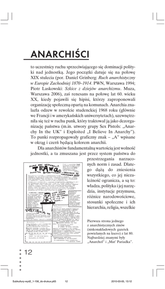 ANARCHIŒCI to uczestnicy ruchu sprzeciwiającego się dominacji polityki nad jednostką. Jego początki datuje się na połowę XIX stulecia (por. Daniel Grinberg: Ruch anarchistyczny w Europie Zachodniej 1870–1914. PWN, Warszawa 1994; Piotr Laskowski: Szkice z dziejów anarchizmu. Muza, Warszawa 2006), zaś renesans na połowę lat 60. wieku XX, kiedy pojawili się hipisi, którzy zaproponowali organizację społeczną opartą na komunach. Anarchia znalazła odzew w rewolcie studenckiej 1968 roku (głównie we Francji i w amerykańskich uniwersytetach), uzewnętrzniła się też w ruchu punk, który traktował ją jako dezorganizację państwa (m.in. utwory grupy Sex Pistols: „Anarchy In the UK” i Exploited „I Believe In Anarchy”). To punki rozpropagowały graficzny znak – „A” wpisane w okrąg i czerń będącą kolorem anarchii. Dla anarchistów fundamentalną wartością jest wolność jednostki, a ta zmuszana jest przez system państwa do przestrzegania narzuconych norm i zasad. Dlatego dążą do zniesienia wszystkiego, co jej niezależność ogranicza, a są to: władza, polityka i jej narzędzia, instytucje przymusu, różnice narodowościowe, stosunki społeczne i ich hierarchia, religia, wszelkie ○ ○ ○ ○ ○ ○ Pierwsza strona jednego z anarchistycznych zinów (niskonakładowych gazetek powielanych na ksero) z lat 80. Najbardziej znanymi były „Anarchol” i „Mat’ Pariadka”. 12 Subkultury-wyd2_1-156_do-drukux.p65 12 2010-03-05, 13:12 przepisy itp. Uważają, że każdy powinien mieć prawo robienia tego, na co ma ochotę, pod warunkiem, że nie szkodzi innym. Filozofia ta od początku uznana została za utopijną, czyli niemożliwą do zrealizowania, a termin „anarchia” stał się synonimem chaosu. W Polsce grupy o tej orientacji pojawiły się pod koniec lat 70. Dziś anarchia stanowi głównie element niektórych subkultur (antyglobalistów, punków, ekologów), które poza głoszeniem wolności jednostki działają przeciw wszelkim przejawom przemocy, rasizmu, faszyzmu i nacjonalizmu. Początki ruchu w Polsce: Ruch Społeczeństwa Alternatywnego – połowa lat 80. Międzymiastówka Anarchistyczna – rok 1988 Federacja Anarchistyczna – rok 1989 Zdeklarowani anarchiści na wzór hipisowskich komun tworzą własne zamknięte społeczności, czyli tzw. squaty. Najbardziej znanym stał się poznański „Rozbrat”. Inny, o nazwie „Krzyk”, powstał z inicjatywy kilku punków w 1998 roku w opuszczonym budynku w Gliwicach. Na prowadzącej do niego bramie pojawiła się replika obrazu „Krzyk” Edwarda Muncha i znak pacyfy. Dobrze powiedziane „Władza to mniej lub bardziej dotkliwa forma gwałtu na ludziach. Ludzie idą do polityki po to, by rządzić innymi, więc na dzień dobry mają u mnie przechlapane”. Krzysztof Grabowski, perkusista grupy Dezerter, w wywiadzie dla Mikołaja Lizuta: Punk Rock Later. Sic!, Warszawa 2003. ○ ○ ○ ○ ○ ○ 13 Subkultury-wyd2_1-156_do-drukux.p65 13 2010-03-05, 13:12 ANTYFASZYŒCI szerzą hasła tolerancji i równości bez względu na przynależność rasową i narodową. Przez wielu odbierani są jako grupy lewackie i komunizujące. Bywają inspiratorami marszów przeciw przemocy. Często są członkami innych subkultur o anarchistycznej bądź pacyfistycznej orientacji. Nie mają określonego image’u. Ich symbolem jest przekreślona swastyka. Pierwsze grupy antyfaszystowskie na zachodzie Europy zaczęły powstawać po uaktywnieniu się organizacji neonazistowskich, w Polsce – na początku lat 90. jako reakcja na pojawiające się hasła nazistowskie, szowinistyczne i rasistowskie. Do najbardziej znanych należały (bądź nadal należą) m.in. Antyfaszystowskie Porozumienie Regionalne w Katowicach, Grupa Anty Nazistowska w Bydgoszczy, Anty Nazi Front we Wrocławiu i Stowarzyszenie Nigdy Więcej. ○ ○ ○ ○ ○ ○ Antyfaszystowskie graffiti. Piosenkę „Nazi Punks Fuck Off” zamieścił na jednej ze swych płyt punkowy zespół Dead Kennedys. 14 Subkultury-wyd2_1-156_do-drukux.p65 14 2010-03-05, 13:12 Stowarzyszenie Nigdy Więcej wydające pismo pod takim samym tytułem zapoczątkowało m.in. kampanie „Muzyka przeciw rasizmowi” oraz „Wykopmy rasizm ze stadionów”. Stało się też wydawcą skierowanego do kibiców magazynu „Stadion” oraz było współzałożycielem organizacji Football Against Racism in Europe skupiającej 40 stowarzyszeń z 15 krajów Europy. Brunatna księga W 2009 roku ukazała się nakładem Stowarzyszenia Nigdy Więcej Brunatna księga Marcina Kornaka, w której autor opisuje ponad dwa tysiące przypadków zdarzeń i przestępstw na tle nacjonalistycznym, antysemickim, faszystowskim i rasistowskim. ANTYGLOBALIŒCI sprzeciwiają się, jak to określają, paktowi bogatych państw przeciw krajom biednym i rozwijającym się, ponieważ jego rezultatem jest rosnąca zamożność tych pierwszych, budowana kosztem drugich. Twierdzą, że globalizm jest kolejną wersją kapitalizmu, w której rządzące rynkiem wielkie korporacje doprowadzają do bankructwa niewielkie firmy, gdyż w pozbawionym granic świecie przemysłowi potentaci wypierają małe przedsiębiorstwa. Antyglobaliści są krytykami neoliberalizmu oraz międzynarodowych organizacji walutowych i handlowych, które określają mianem „korporacyjnego systemu handlu” (por. Artur ○ ○ ○ ○ ○ ○ 15 Subkultury-wyd2_1-156_do-drukux.p65 15 2010-03-05, 13:12 Domosławski: Świat nie na sprzedaż. Rozmowy o globalizacji i kontestacji. Sic!, Warszawa 2002). Za symboliczny początek ruchu antyglobalistycznego uważa się powstanie meksykańskich zapatystów (organizacja partyzancka) w 1994 roku przeciw wolnemu handlowi USA, Meksyku i Kanady, którego efektem stałby się upadek niewielkich firm w biednym Meksyku. Rozpoczęcie ich zorganizowanej działalności datuje się na rok 1999, kiedy na wezwanie Amerykanki Laurie Wallach po raz pierwszy masowo zamanifestowali swój sprzeciw podczas 