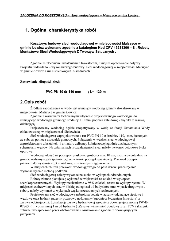 ZAŁOŻENIA DO KOSZTORYSU – Sieć wodociągowa – Małszyce gmina Łowicz 1. Ogólna charakterystyka robót Kosztorys budowy sieci wodociągowej w miejscowości Małszyce w gminie Łowicz wykonano zgodnie z katalogiem Kod CPV 45231300 – 8 , Roboty Montażowe Sieci Wodociągowych Z Tworzyw Sztucznych . Zgodnie ze zleceniem i ustaleniami z Inwestorem, niniejsze opracowanie dotyczy Projektu budowlano – wykonawczego budowy sieci wodociągowej w miejscowości Małszyce w gminie Łowicz z rur ciśnieniowych o średnicach : Zestawienie długości sieci: PVC PN 10 śr 110 mm ; L= 130 m 2. Opis robót Źródłem zaopatrzenia w wodę jest istniejący wodociąg gminny zlokalizowany w miejscowości Małszyce w gminie Łowicz. Zgodnie z warunkami technicznymi włączenie projektowanego wodociągu do istniejącego wodociągu gminnego średnicy 110 mm poprzez zabudowę - trójnika z zasuwą odcinającą . Projektowany wodociąg będzie zaopatrywany w wodę ze Stacji Uzdatniania Wody zlokalizowanej w miejscowości Niedźwiada . Sieć wodociągową zaprojektowano z rur PVC PN 10 o średnicy 110, mm, łączonych ze sobą za pomocą uszczelek gumowych. Połączenia w węzłach sieci wodociągowej zaprojektowano z kształtek i armatury żeliwnej, kołnierzowej zgodnie z załączonymi schematami węzłów. Na załamaniach i rozgałęzieniach sieci należy wykonać betonowe bloki oporowe. Wodociąg ułożyć na podsypce piaskowej grubości min. 10 cm, można ewentualnie na gruncie rodzimym jeśli spełniać będzie warunki podsypki piaskowej. Przewód obsypać piaskiem do wysokości 0,3 m nad rurą ze starannym zagęszczeniem. W miejscach zbliżeń przewodu wodociągowego do pasa drzew prace ręcznie wykonać ręcznie metodą podkopu. Sieć wodociągową należy wykonać na sucho w wykopach odwodnionych. Roboty ziemne planuje się wykonać w większości na odkład w wykopach szerokoprzestrzennych . Wykopy mechaniczne w 95% całości , reszta to wykopy ręczne. W miejscach zadrzewionych oraz w bliskiej odległości od budynków oraz w pasie drogowym , roboty należy wykonać w wykopach wąskoprzestrzennych szalowanych. Projektowana sieć wodociągowa uzbrojona będzie w zasuwy odcinające sieciowe i węzłowe oraz hydrant przeciw pożarowy nadziemny (zgodnie z życzeniem Inwestora) z zasuwą odcinającymi. Lokalizacja zasuwy hydrantowej zgodnie z obowiązującą normą PW-B02863 ( tj. co najmniej 1 m od hydrantu ) .Zasuwy winny mieć obudowy z rur PCV i skrzynki żeliwne zabezpieczone przez obetonowanie i oznakowanie zgodnie z obowiązującymi przepisami. ZAŁOŻENIA DO KOSZTORYSU – Sieć wodociągowa – Małszyce gmina Łowicz Zasuwy hydrantowe montować w odległości co najmniej 1 m od hydrantu i pozostawić w położeniu otwartym. Hydrant montować na wysięgnikach długości ok. 1 m. ŻEL.śr. 80 mm - L = 1,0 m Sieć wodociągową należy ułożyć zgodnie z przebiegiem pokazanym na mapach sytuacyjno-wysokościowych. Sieć wodociągową zaprojektowano w pasie drogowym drogi wojewódzkiej oraz wzdłuż pasa drogi wojewódzkiej , po działkach prywatnych . Wytyczenie trasy wodociągowej należy wykonać zgodnie z projektem zachowując jednocześnie minimalne odległości : – od budynków nie podpiwniczonych - 3,5 m – od budynków podpiwniczonych - 2,0 m – od słupów energetycznych - 1,0 m – od słupów telekomunikacyjnych - 1,0 m – od pasa drzew - 2,5 m – od pojedyńczych drzew - 1,5 m – od kabli energetycznych i telekomunikacyjnych - 0,8 m (w pionie 0,7-0,9 m) – od przewodów kanalizacyjnych - 2,0 m – od przewodów gazowych - 1,5 m – od punktów geodezyjnych - 1,5 m – od transformatorów - 5,0 m Dopuszcza się usytuowanie przewodów wodociągowych w odległościach mniejszych od podanych, pod warunkiem przejścia obok metodą przewiertu lub przecisku w rurze stalowej osłonowej. Roboty ziemne przy wykonywaniu sieci należy wykonać zgodnie z normą PNB/10736:1999 ''Wykopy otwarte dla przewodów wodociągowych i kanalizacyjnych''. Głębokość przykrycia przewodów przyjęto średnio 1,70 m. Jeśli nie ma możliwości spełnienia tego warunku, przewód wodociągowy należy zabezpieczyć przed przemarznięciem. W miejscach zabudowanych i zadrzewionych, wzdłuż dróg utwardzonych ( asfalt, kostka, Bauma, beton ) oraz w miejscach zbliżeń do istniejącego uzbrojenia podziemnego, wykopy wykonać ręcznie, wąskoprzestrzennie, z szalunkiem z belek drewnianych lub wyprasek stalowych. W zasięgu koron drzew prace należy wykonać ręcznie, bez uszkodzenia korzeni drzew . Przy nadmiernych zbliżeniach przewodu wodociągowego do drzew , przewód układać metodą podkopu lub przewiertu. Pod istniejącymi przepustami, podjazdami betonowymi do poszczególnych posesji, cokołami, przejścia wykonywać przewiertem w rurach stalowych osłonowych . W miejscach skrzyżowań z kablami teletechnicznymi oraz w miejscach zbliżeń do słupów teletechnicznych roboty należy wykonać ręcznie i pod nadzorem właściciela linii . W miejscach skrzyżowań sieci z kablami energetycznymi NN ( przyłącza ), wykopy należy wykonać ręcznie pod nadzorem właściciela linii kablowej. Przy słupach zachować odległość minimum 1,0 m od podziemnych części słupa oraz zapewnić w czasie wykonywania wykopów, dojazd do stanowisk słupowych. Zasypywanie wykopów należy wykonać po próbie szczelności przewodów wodociągowych. Roboty montażowe należy wykonywać ''na sucho'' w odwodnionym i odeskowanym wykopie. ZAŁOŻENIA DO KOSZTORYSU – Sieć wodociągowa – Małszyce gmina Łowicz Miejsca wykonywania robót ziemnych i montażowych należy zabezpieczyć zgodnie z przepisami: /Dz. U Nr 53 z dnia 2.12.1961r. oraz Dz. U. Nr 55 z dnia 1972r. / przez odpowiednie oznakowanie, ustawienie barier i oświetlenie w czasie nocy. Podczas wykonywania projektowanego wodociągu zaleca się : – wykonanie geotechnicznego odbioru wykopów , w celu stwierdzenia , czy w bezpośrednim podłożu pod projektowan