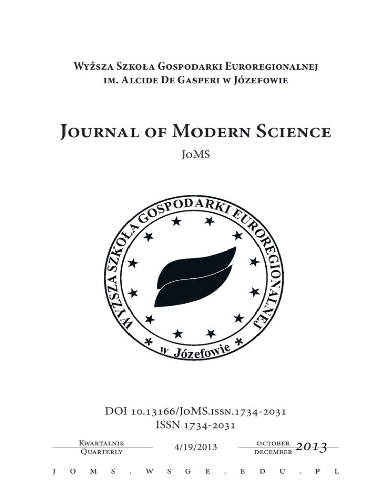 Wyższa Szkoła Gospodarki Euroregionalnej im. Alcide De Gasperi w Józefowie Journal of Modern Science JoMS DOI 10.13166/JoMS.issn.1734-2031 ISSN 1734-2031 Kwartalnik Quarterly j o m s october december 4/19/2013 . w s g e . e d u 2013 . p | 1l WSGE Zespół redakcyjny / Editorial team Adres / Address Redaktor naczelna / Editor-in-Chief Wyższa Szkoła Gospodarki Euroregionalnej im. Alcide De Gasperi dr hab. Magdalena Sitek, prof. WSGE w Józefowie, Polska / Alcide De Gasperi University of Euroregional Economy in Józefów, Poland dr Małgorzata Such-Pyrgiel Zastępca redaktora naczelnego / Assistant Editor Wyższa Szkoła Gospodarki Euroregionalnej im. Alcide De Gasperi w Józefowie, Polska / Alcide De Gasperi University of Euroregional Economy in Józefów, Poland dr Krzysztof Dziurzyński redaktor statystyczny / Statistical Editor Wyższa Szkoła Gospodarki Euroregionalnej im. Alcide De Gasperi w Józefowie, Polska/ Alcide De Gasperi University of Euroregional Economy in Józefów, Poland mgr Aurelia Łuczyńska redaktor językowy (język angielski) / English language editor Wyższa Szkoła Gospodarki Euroregionalnej im. Alcide De Gasperi w Józefowie, Polska/ Alcide De Gasperi University of Euroregional Economy in Józefów, Poland mgr Elżbieta Jamróz redaktor językowy (język włoski) / Italian language editor Wyższa Szkoła Gospodarki Euroregionalnej im. Alcide De Gasperi w Józefowie, Polska/ Alcide De Gasperi University of Euroregional Economy in Józefów, Poland mgr Aleksandra Ukleja Sekretarz Redakcji / Managing Editor Wyższa Szkoła Gospodarki Euroregionalnej im. Alcide De Gasperi w Józefowie, Polska/ Alcide De Gasperi University of Euroregional Economy in Józefów, Poland redaktor tematyczny /Subject Editor Wyższa Szkoła Gospodarki Euroregionalnej im. Alcide De Gasperi dr hab. inż. Jerzy Zawisza, Prof. WSGE w Józefowie, Polska/ Alcide De Gasperi University of Euroregional Economy in Józefów, Poland prof. zw. dr hab. Bronisław Sitek redaktor tematyczny /Subject Editor Wyższa Szkoła Gospodarki Euroregionalnej im. Alcide De Gasperi w Józefowie, Polska/ Alcide De Gasperi University of Euroregional Economy in Józefów, Poland Adres redakcji / Editorial Office Wydawnictwo Wyższej Szkoły Gospodarki Euroregionalnej im. Alcide De Gasperi w Józefowie 05-410 Józefów, ul. Sienkiewicza 2 tel./fax +48 022 789 19 03 [email protected] www.joms.wsge.edu.pl Adres do przesyłania artykułów / Address for Submission Wyższa Szkoła Gospodarki Euroregionalnej im. Alcide De Gasperi w Józefowie, ul. Sienkiewicza 2, 05-140 Józefów, Polska / Alcide De Gasperi University of Euroregional Economy, ul. Sienkiewicza 2, 05-410 Józefów, Poland Aleksandra Ukleja tel.: (+48) 22 789 19 03 int. 12 e-m@il: [email protected] j2 | WSGE o m s . w s g e . e d u . p l j o m s . w s g e . e d u . p | l3 WSGE Rada Naukowa / Scientific Committee Prof. dr hab. Bronisław Sitek [Przewodniczący / Chairman] University of Warmia and Mazury in Olsztyn, Poland Prof. dr hab. Peter Terem [Zastępca Przewodniczącego/Deputy Chairman] Matej Bel University Banská Bystrica, Slovakia Prof. dr hab. Edward Erazmus Alcide De Gasperi University of Euroregional Economy in Józefów, Poland Dr hab. Piotr Majer, prof. UWM University of Warmia and Mazury in Olsztyn, Poland Prof. dr hab. Stanisław Mraz Matej Bel University Banská Bystrica, Slovakia Prof. dr. hab. Victoria Serzhanova University of Rzeszów, Poland Prof. dr hab. Witold Pokruszyński Alcide De Gasperi University of Euroregional Economy in Józefów, Poland Prof. Paulo Aldo Rossi University of Genoa, Italy Prof. Silvestre Bello Rodriguez University of Las Palmas de Gran Canaria, Spain Prof. dr hab. Ligita Simanskiene Klaipėda University, Lithuania Prof. dr hab. Jan Widacki Andrzej Frycz Modrzewski Krakow University, Poland Prof. dr hab. Zdzisław Majkut Alcide De Gasperi University of Euroregional Economy in Józefów, Poland Prof. Laura Tafaro University of Bari “Aldo Moro”, Italy Prof. dr hab. Svetlana Zapara Sumy State University, Ukraine Prof. Jaime Bonnet University of Valencia, Spain Prof. Cristina Hermida del Llano King Juan Carlos University in Madrid, Spain Assoc. Prof. PhD. Ioan Ganfalean “1 Decembrie 1918” University in Alba Iulia, Romania Dr hab. inż. Jerzy Zawisza, Prof. WSGE Alcide De Gasperi University of Euroregional Economy in Józefów, Poland Prof. Ksenofon Krisafi University of Tirana, Albania Prof. Dr. Sabri Gökmen Karamanoğlu Mehmetbey University, Turkey Lect. PhD. Miruna Mihaela Tudorascu “1 Decembrie 1918” University in Alba Iulia, Romania dr Wiesław Breński University of Warmia and Mazury in Olsztyn, Poland dr Lucyna Sikorska Polish Border Guard Training Centre in Kętrzyn, Poland dr Andrzej Wawrzusiszyn University of Warmia and Mazury in Olsztyn, Poland Korekta / Proofreading - mgr Sławomir Koźlak Skład, łamanie, projekt okładki / Typesetting, type-matter, cover - mgr Miłosz Ukleja i mgr Aleksandra Ukleja Za wersję pierwotną niniejszego czasopisma uznaje się wersję wydaną drukiem. Elektroniczna wersja czasopisma stanowi kopię egzemplarzy wydanych drukiem i jest dostępna pod adresem. The printed version of Journal of Modern Science is the original one. The electronic version of the journal is available as a copy of the original printed version. http://www.wsge.edu.pl/pl/journal-of-modern-science-wydania.html Nakład / Circulation - 150 egzemplarzy / copies Druk i oprawa / Printing and binding P.H.U Multikram Krystyna Tuchalska, ul. Mławska 20 D, 87-500 Rypin tel/fax (+48) 054 280 22 06, [email protected] – Krystyna Tuchalska Wydawca / Publisher Wyższa Szkoła Gospodarki Euroregionalnej im. Alcide De Gasperi w Józefowie 05-410 Józefów, ul. Sienkiewicza 2 Aleksandra Ukleja tel./fax +48 022 789 19 03 [email protected] www.wsge.edu.pl © Copyright by Wyższa Szkoła Gospodarki Euroregionalnej im. Alcide De Gasperi w Józefowie. All Rights Reserved / Wszelkie prawa zastrzeżone. Kopiowanie