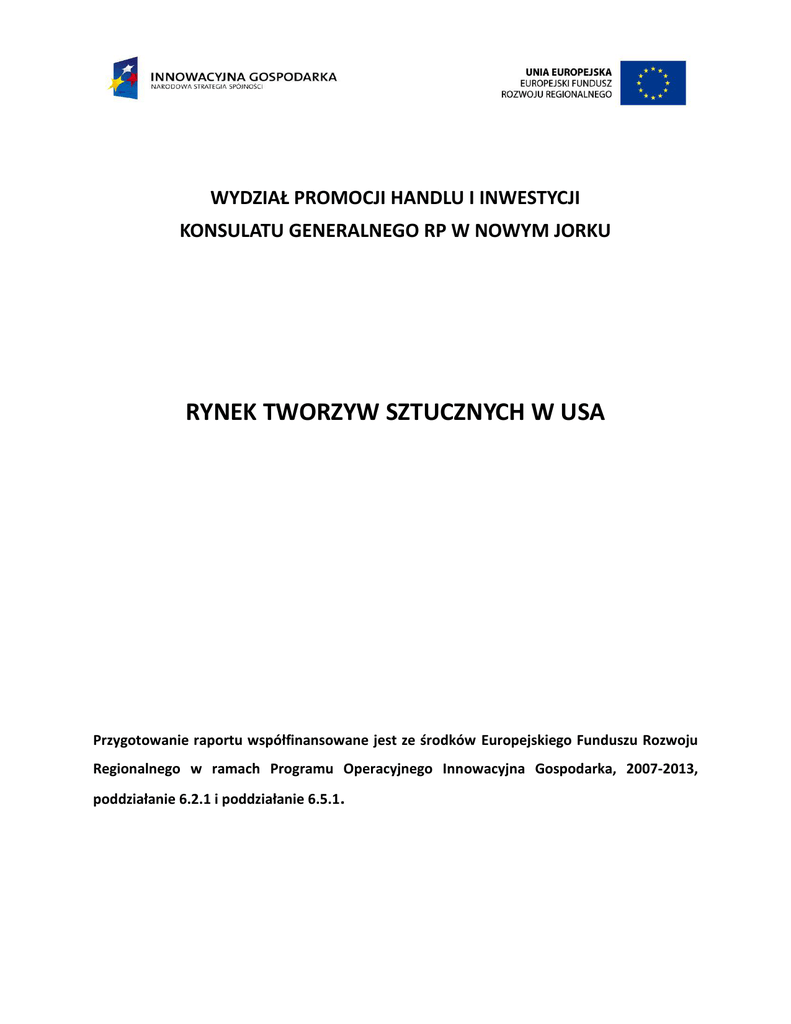 WYDZIAŁ PROMOCJI HANDLU I INWESTYCJI KONSULATU GENERALNEGO RP W NOWYM JORKU RYNEK TWORZYW SZTUCZNYCH W USA Przygotowanie raportu współfinansowane jest ze środków Europejskiego Funduszu Rozwoju Regionalnego w ramach Programu Operacyjnego Innowacyjna Gospodarka, 2007-2013, poddziałanie 6.2.1 i poddziałanie 6.5.1. WYDZIAŁ PROMOCJI HANDLU I INWESTYCJI KONSULATU GENERALNEGO RP W NOWYM JORKU RYNEK TWORZYW SZTUCZNYCH (PLASTIK) W USA Dział przemysłu zajmujący się głównie produkcją: plastikowych elementów gospodarstwa domowego; armaturą i osprzętem, plastikowych elementów budowlanych, plastikowych opakowao (oprócz butelek), plastikowych nakrętek do butelek, plastikowych linoleum podłogowych; płytki pcv, plastikowych części do silników samochodowych, plastikowych części do urządzeo domowych, plastikowych kart kredytowych i identyfikacyjnych, plastikowych dóbr trwałego użytku, plastikowych koszy na śmieci i kontenerów. Do głównych produktów i usług w tej branży należą: konsumenckie oraz komercyjne produkty plastikowe, gotowe elementy plastikowe do użytku w budynkach, gotowe elementy plastikowe na potrzeby zastosowania w dziale elektrycznym/ elektronicznym, gotowe elementy plastikowe na potrzeby transportu, Rynek tworzyw sztucznych w USA (luty 2011) WYDZIAŁ PROMOCJI HANDLU I INWESTYCJI KONSULATU GENERALNEGO RP W NOWYM JORKU inne produkty plastikowe, opakowania plastikowe, oprócz folii do żywności, pianki i butelek plastikowych, plastikowe elementy osprzętu hydraulicznego, szkło z tworzywa sztucznego, wzmocnionego. Światowy kryzys gospodarczy negatywnie wpłynął na poziom przemysłu w USA. Recesja spowodowała spadek popytu w prawie wszystkich segmentach rynku, przyczyniając się do bankructwa wielu mniejszych producentów. Wysokie obroty przemysłu tworzyw sztucznych w znacznym stopniu są uwarunkowane poziomem obrotów pięciu głównych działów gospodarki: przemysłu samochodowego (30% zleceo), budowlanego i remontowego (razem 37% zleceo), elektronicznego, hydraulicznego i jego osprzętu (ok. 10%) oraz przemysłu meblowego. W związku z kryzysem ekonomicznym w USA wszystkie powyżej wymienione działy przemysłu doświadczyły znacznego spadku w produkcji a czasami wręcz były zmuszone ogłosid upadłośd. W 2010 r. przemysł tworzyw sztucznych doświadczył spadku dochodów w wysokości 0,6% i wyniósł 90,1 mld USD. Dodatkowo, amerykaoski przemysł tworzyw sztucznych współzawodniczy z narastającą falą taniego importu - głównie z Chin (ok. 50% całego importu). Jak podaje IBIS – World w 2010 r. roczne tempo wzrostu importu wyniosło 2,1%, osiągając ok. 5 mld USD. Dla porównania, eksport amerykaoskich części plastikowych wzrósł o 0,6% w skali roku. Przewiduje się, iż w miarę rozwoju stopnia globalizacji, rodzime firmy będą przenosid swoje linie produkcyjne za granicę, w celu optymalizacji kosztów produkcji. Pomimo dosyd negatywnych dotychczasowych prognoz amerykaoski przemysł tworzyw sztucznych ma duże szanse na podźwignięcie się, wzrastając w ok. 2,8% rocznym tempie i przynosząc zyski w wysokości $103,5 mld USD. Szerokie i łatwe zastosowanie plastiku w przemyśle sprawiło, iż stał się on podstawowym i niezastąpionym materiałem w wielu dziedzinach produkcji ze względu na swoje specyficzne właściwości. Plastik charakteryzuje się wysokim stopniem plastyczności, pozwala na Rynek tworzyw sztucznych w USA (luty 2011) WYDZIAŁ PROMOCJI HANDLU I INWESTYCJI KONSULATU GENERALNEGO RP W NOWYM JORKU formułowanie dogodnych kształtów a także pozwala na kształtowanie dowolnej wagi, jest także odporny na wysokie temperatury (plastik specjalnie hartowany) oraz posiada wiele innych właściwości przydatnych w różnych gałęziach produkcji. W związku z faktem, iż tworzywa sztuczne zdominowały większośd dziedzin życia amerykanów (nowe zastosowania plastiku są nieustannie odkrywane) ich niezbędnośd i nie zastępowalnośd w życiu codziennym jest wrażliwa na ekonomiczne zachwiania gospodarki. Wysokośd popytu na rynku tworzyw sztucznych w dużym stopniu bazuje na dotychczasowych zwyczajach i nawykach konsumenta, stąd silna zależnośd pomiędzy sytuacją ekonomiczną poszczególnych działów gospodarki a produkcją plastiku. Główne działy gospodarki wpływające na wydajnośd przemysłu tworzyw sztucznych: Popyt wypływający z przemysłu samochodowego. Należy do jednych z największych segmentów rynku, produkcja samochodowa w jednej trzeciej opiera się na elementach plastikowych, wykorzystywanych przy produkcji silników mechanicznych. Jeden funt plastiku zastępuje ok. 2,5 funtów metalu, co średnio daje oszczędnośd 200 galonów (757 litrów) benzyny rocznie na 10 000 przejechanych mil. Jak podaje IBIS – World w 2010 r. nastąpił 19,1% wzrost sprzedaży samochodów, po uprzednim 30,5% spadku w 2009 r. Podczas recesji klienci dysponowali mniejszym budżetem przeznaczonym na zakup nowych aut, co automatycznie wpłynęło na spadek poziomu produkcji plastiku. Popyt wypływający z produkcji sprzętu elektrycznego. Plastikowe obudowy dla sprzętu elektronicznego wykorzystywane są podczas procesu produkcji. Popyt wypływający z przemysłu budowlanego i remontowego. Sprzedaż narzędzi i elementów przeznaczonych do remontów domów (plastikowe nakrętki, nity, zasuwki, etc.) Wzrost poziomu budownictwa wpływa na zwiększone zapotrzebowanie na narzędzia. Popyt wypływający z przemysłu osprzętu hydraulicznego i ocieplającego. Rynek tworzyw sztucznych w USA (luty 2011) WYDZIAŁ PROMOCJI HANDLU I INWESTYCJI KONSULATU GENERALNEGO RP W NOWYM JORKU Przemysł tworzyw sztucznych wspiera produkcje elementów i osprzętu hydrauliczno/ grzewczego. Popyt wypływający ze sprzedaży mebli. Przemysł meblowy używa wielu elementów plastikowych podczas produkcji i montażu, a także produkuje meble plastikowe. Cena plastiku i żywicy. Stały wzrost ceny produkcji polimerów plastikowych będzie wpł