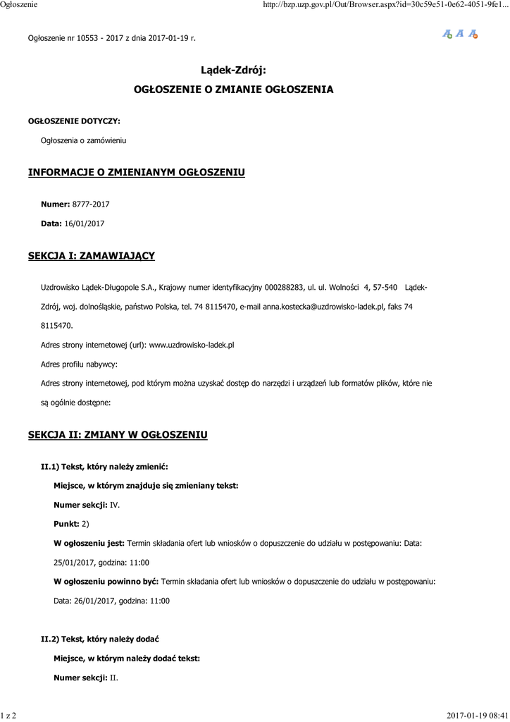 Ogłoszenie 1z2 http://bzp.uzp.gov.pl/Out/Browser.aspx?id=30c59e51-0e62-4051-9fe1... Ogłoszenie nr 10553 - 2017 z dnia 2017-01-19 r. Lądek-Zdrój: OGŁOSZENIE O ZMIANIE OGŁOSZENIA OGŁOSZENIE DOTYCZY: Ogłoszenia o zamówieniu INFORMACJE O ZMIENIANYM OGŁOSZENIU Numer: 8777-2017 Data: 16/01/2017 SEKCJA I: ZAMAWIAJĄCY Uzdrowisko Lądek-Długopole S.A., Krajowy numer identyfikacyjny 000288283, ul. ul. Wolności 4, 57-540 Lądek- Zdrój, woj. dolnośląskie, państwo Polska, tel. 74 8115470, e-mail [email protected], faks 74 8115470. Adres strony internetowej (url): www.uzdrowisko-ladek.pl Adres profilu nabywcy: Adres strony internetowej, pod którym można uzyskać dostęp do narzędzi i urządzeń lub formatów plików, które nie są ogólnie dostępne: SEKCJA II: ZMIANY W OGŁOSZENIU II.1) Tekst, który należy zmienić: Miejsce, w którym znajduje się zmieniany tekst: Numer sekcji: IV. Punkt: 2) W ogłoszeniu jest: Termin składania ofert lub wniosków o dopuszczenie do udziału w postępowaniu: Data: 25/01/2017, godzina: 11:00 W ogłoszeniu powinno być: Termin składania ofert lub wniosków o dopuszczenie do udziału w postępowaniu: Data: 26/01/2017, godzina: 11:00 II.2) Tekst, który należy dodać Miejsce, w którym należy dodać tekst: Numer sekcji: II. 2017-01-19 08:41 Ogłoszenie 2z2 http://bzp.uzp.gov.pl/Out/Browser.aspx?id=30c59e51-0e62-4051-9fe1... Punkt: 4) Tekst, który należy dodać w ogłoszeniu: 7a. Zamawiający zobowiązuje się wystąpić z pisemną prośbą o dostawę i montaż przedmiotu zamówienia nie wcześniej niż 14 dni od dnia podpisania umowy i nie później niż w terminie pozwalającym na realizacje przedmiotu umowy do dnia 20.03.2017r. 2017-01-19 08:41