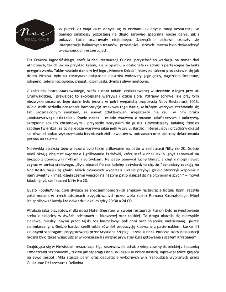W piątek 29 maja 2015 odbyła się w Poznaniu IV edycja Nocy Restauracji. W pamięci smakoszy pozostaną na długo zarówno specjalne nocne dania, jak i pokazy, które oczarowały niejednego. Szczególnie ciekawe okazały się interpretacje kulinarnych trendów przyszłości, których można było doświadczyć w poznańskich restauracjach. Dla Ernesta Jagodzińskiego, szefa kuchni restauracji Cucina, przyszłość to wariacja na temat dań etnicznych, takich jak na przykład kebab, ale w oparciu o doskonałe składniki i perfekcyjne techniki przygotowania. Takim właśnie daniem był jego ,,Modern Kebab”, który na talerzu prezentował się jak dzieło Picassa. Było to kreatywne połączenie plastrów wołowiny, jagnięciny, wędzonej śmietany, jalapeno, selera naciowego, chapati, czarnuszki, dymki i oliwy miętowej. Z kolei dla Piotra Markowskiego, szefa kuchni Jadalni zlokalizowanej w siedzibie Allegro przy ul. Grunwaldzkiej, przyszłość to ekologiczne warzywa i dzikie zioła. Potrawy zdrowe, ale przy tym niezwykle smaczne. Jego danie było jedyną w pełni wegańską propozycją Nocy Restauracji 2015. Wiele osób zdziwiła doskonała kompozycja smakowa tego dania, w którym warzywa cechowały się tak urozmaiconym smakiem, że nawet zdeklarowani mięsożercy nie czuli w nim braku „podstawowego składnika”. Danie nocne - młode warzywa z musem kalafiorowym i pokrzywą, skropione sokiem chrzanowym - przypadło wszystkim do gustu. Odwiedzający Jadalnię foodies zgodnie twierdzili, że to najlepsze warzywa jakie jedli w życiu. Bardzo interesujący i przydatny okazał się również pokaz wykorzystania leczniczych ziół i kwiatów w potrawach oraz sposoby dekorowania potraw na talerzu. Niezwykłą atrakcją tego wieczoru było także grillowanie na patio w restauracji Nifty no 20. Goście mieli okazję obejrzeć wędzenie i grillowanie karkówki, którą szef kuchni Jakub Ignyś serwował na bieżąco z domowymi frytkami i surówkami. Na patio panował luźny klimat, a chętni mogli nawet zagrać w tenisa stołowego. „Było ekstra! Po raz kolejny potwierdziło się, że Poznaniacy czekają na Noc Restauracji i są głodni takich ciekawych wydarzeń. Licznie przybyli goście stworzyli wspólnie z nami świetny klimat, dzięki czemu wieczór na naszym patio należał do najprzyjemniejszych.” – mówił Jakub Ignyś, szef kuchni Nifty No 20. Gusto Food&Wine, czyli słynąca ze śródziemnomorskich smaków restauracja hotelu Ilonn, raczyła gości mulami w trzech odsłonach przygotowanych przez szefa kuchni Romana Kosmalskiego. Mógł ich spróbować każdy kto odwiedził lokal między 20:30 a 24:00. Atrakcją jaką przygotował dla gości Hotel Sheraton w swojej restauracji Fusion było przygotowanie steku z cielęciny w dwóch odsłonach – klasycznej oraz tajskiej. Ta druga okazała się niezwykle ciekawa, między innymi przez tajski sos karmelowy, pak choi oraz sajgonkę nadziewaną puree ziemniaczanym. Goście bardzo cenili sobie również propozycję klasyczną z pasternakiem, kurkami i zielonymi szparagami przygotowaną przez Krystiana Szopkę – szefa kuchni. Podczas Nocy Restauracji można było także wziąć udział w konkursach i wygrać prywatny kurs gotowania z szefem Krystianem. Znajdująca się w Plewiskach restauracja Figa zaserwowała schab z wieprzowiny złotnickiej z kaszanką i dodatkami sezonowymi, takimi jak szparagi i bób. W lokalu w dobry nastrój wprawiał także grający na żywo zespół „Miła starsza pani” oraz degustacja wybornych win francuskich wybranych przez Guillaume Deliancourt z Deliwina. Szef kuchni Restauracji BlowUp Hall 5050 Tomek Purol przygotował pokaz, który zgromadził licznych gości. Dowiedzieli się oni między innymi jak samodzielnie przygotować majonez smakowy (w tym wypadku truflowy) oraz tatar z tuńczyka. Podniebienia tłumnie przybyłych podbiło jednak nocne danie - Polędwica wołowa z foie gras, truflą, warzywami sezonowymi i ziemniakami. Goście wyszli zauroczeni jego smakiem. O samym wydarzeniu szef Purol mówił „Bardzo, bardzo fajnie, że są takie akcje. Rzesza uśmiechniętych, zadowolonych gości to dla nas wielka satysfakcja. Widać też, że w naszym lokalu Noc Restauracji z roku na rok cieszy się coraz większą popularnością”. W restauracji Bazar 1838 już od progu goście mogli oddać się degustacji, bowiem witał ich nowatorski drink na bazie Benedyktynki. Później mogli oddać się smakowaniu dania, którego główny składnik przygotowano dwoma technikami – tradycyjną oraz przyszłościową. Był to okoń morski pieczony w cieście solnym oraz przygotowany metodą sous vide. Do tego podano także ziemniaki z ogniska – co jest nie lada rzadkością w poznańskich restauracjach. Bardzo interesującym akcentem był również pokaz w wykonaniu szefa kuchni Jacka Fedde, podczas którego goście mogli dowiedzieć się jak przygotować pyszne lody zarówno w wydaniu tradycyjnym, jak i nowoczesnym, z użyciem ciekłego azotu. Podczas Nocy Restauracji nie zabrakło również licznych nawiązań do kulinarnej klasyki. I tak, Ci, którzy chcieli spróbować mięsa z kaczki, mogli udać się pod dwa adresy. Kacze udko confit podane z szagówkami, kapustą modrą i śliwką marynowaną było propozycją Darii Gozik szefującej kulinarnemu zapleczu restauracji Monidło. Drugą propozycją opartą na mięsie kaczym była kreacja szefa restauracji Niku - Adama Zastróżnego, który gości raczył filetem z kaczki sous vide, strudlem z modrą kapustą, duetem szparagów, pianką żurawinowa i pudrem pomarańczowym. „Noc Restauracji była właściwie pierwszym poważnym testem dla nowego oblicza Restauracji Niku. Chcemy zmieniać się dla naszych gości, poznawać ich gusta, a Noc Restauracji była ku temu świetną okazją. Cieszymy się, że wszyscy którzy odwiedzili nas tej nocy mogli zobaczyć w jakim kierunku rozwijać będzie się nasz lokal.” – mówił szef Adam Zastróżny. Niecod