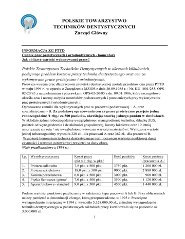 POLSKIE TOWARZYSTWO TECHNIKÓW DENTYSTYCZNYCH Zarząd Główny INFORMACJA ZG PTTD Cennik prac protetycznych i ortodontycznych - komentarz Jak obliczyć wartość wykonywanej pracy? Polskie Towarzystwo Techników Dentystycznych w okresach kilkuletnich, podejmuje problem kosztów pracy technika dentystycznego oraz cen za wykonywane prace protetyczne i ortodontyczne. Pierwsza wycena prac dla pracowni protetyki dentystycznej została przedstawiona przez PTTD w maju 1994 r., w oparciu o Zarządzenie MZiOS z dnia 30.09.1985 r. / Nr. KU 1001/255, OPS02-20/85 z uzupełnieniem i poprawkami OPS-02-20/85 z dn. 09.01.1986, które szczegółowo określa czas i normy zużycia materiałów podstawowych i pomocniczych przy wykonywaniu prac protetycznych i ortodontycznych /. Opracowano cenniki dla wykonywanych prac w pracowni podstawowej – A, oraz specjalistycznej - B. Za podstawę opracowania cen za prace protetyczne przyjęto jedną roboczogodzinę /1 rbg./ za 500 punktów, określając stawkę jednego punktu w złotówkach. W składzie jednej roboczogodziny uwzględniono: wynagrodzenie technika, składkę ZUS, podatek od wynagrodzenia i działalności gospodarczej, koszty lokalowe oraz 10 letnią amortyzacje sprzętu / nie uwzględniono wówczas wartości materiałów/. Wyliczona wartość jednej roboczogodziny wynosiła 320 zł.- dla pracowni A oraz 362 zł.- dla pracowni B. Wysokość honorarium technika dentystycznego jest iloczynem wartości punktowej danej czynności i wartości gotówkowej przyjętej na dany okres. Wzór przeliczeniowy z 1994 r.: Lp. Wyrób protetyczny 1. 2. 3. 4. 5. Proteza całkowita Proteza szkieletowa Korona porcelanowa Płytka Schwarza /górna/ Aparat blokowy- standard Koszt pracy /pkt x 1 rbg. w pkt./ 7,5 pkt. x 500 pkt. 18,0 pkt. x 500 pkt. 6,0 pkt. x 500 pkt. 7,0 pkt. x 500 pkt. 9,0 pkt. x 500 pkt. Ilość punktów 3750 pkt. 9000 pkt. 3000 pkt. 3500 pkt. 4500 pkt. Koszt protezy /pracownia A / 1 200 000 zł. 2 880 000 zł. 960 000 zł. 1 120 000 zł. 1 440 000 zł. Podane wartości punktowe przeliczamy w zależności typu pracowni A lub B. Przy obliczeniach należy pamiętać o denominacji złotego, którą przeprowadzono w 1995 r. Przeciętne wynagrodzenie miesięczne w 1994 r. wynosiło 5.328.000,00 zł., a średnie wynagrodzenie technika dentystycznego w państwowych zakładach pracy kształtowało się na poziomie ok. 3.000.000 zł. 1 W maju 2006 r., ponownie dokonano wyceny kosztów prac protetycznych i ortodontycznych. Dla obliczenia kosztów jednej roboczogodziny przyjęto wydatki związane z wyposażeniem i utrzymaniem pracowni, ilością zużytych materiałów, sprzętu, składki ZUS. Przeciętne wynagrodzenie miesięczne w I kwartale 2006 r. wynosiło 2530 zł. Koszt jednej roboczogodziny dla prac protetycznych wyliczono na poziomie 29 zł., dla prac ortodontycznych 28,24 zł. Wzór przeliczeniowy z 2006 r.: Lp. Wyrób protetyczny 1. 2. 3. 4. 5. Proteza całkowita Proteza częściowa Naprawa protezy /na zimno/ Płytka Schwarza /górna + m./ Płytka Schwarza /dolna + m./ Koszt pracy / pkt. x 1 rbg. w zł./ 7,5 pkt. x 29 = 217.5 6,5 pkt. x 29 = 188,5 1,5 pkt. x 29 = 43.5 7,0 pkt. x 28,24 = 197,68 5,0 pkt. x 28,24 = 141,20 Koszt materiałów 42,83 38,02 5,39 23,80 21,61 Razem / w zł. / 260,33 226,52 48,89 221,48 162,81 W marcu 2009 r. przedstawiony został nowy cennik prac protetycznych i ortodontycznych. Cenę jednej roboczogodziny dla prac protetycznych obliczono w wysokości 44,48 zł., a dla prac ortodontycznych w wysokości 43,75 zł. W kosztach całkowitych uwzględniono także ceny materiałów podstawowych użytych do wykonania danej pracy. Przeciętne wynagrodzenie w IV kwartale 2008 r. wynosiło 3199 zł. Wzór przeliczeniowy z 2009 r.: Lp. Wyrób protetyczny 1. 2. 3. 4. 5. 6. Proteza całkowita Proteza częściowa 8- zębowa Naprawa protezy /na zimno/ Płytka Schwarza /górna + m./ Płytka Schwarza /dolna + m./ Wymiana śruby Koszt pracy /pkt. x 1 rbg. w zł./ 7,5 pkt. x 44,48 = 333,60 6,5 pkt. x 44,48 = 289,12 1,5 pkt. x 44,48 = 66,72 7,0 pkt. x 43,75 = 306,29 5,0 pkt. x 43,75 = 218,75 1,5 pkt. x 43,75 = 65,62 Koszt materiałów 49,41 41,34 7,14 28,02 28,02 15,32 Razem / w zł. / 383,01 330,46 73,86 334,27 246,77 80,94 We wrześniu 2013 r. przedstawiono nowy cennik z zakresu prac protetycznych i ortodontycznych. Cześć A. Przy opracowywaniu części A cennika uwzględniono następujące elementy: I / Koszt wyposażenia pracowni: 1. Meble protetyczne m.in.: biurko protetyczne, stół laboratoryjny, stół gipsowy, krzesła protetyczne, pochłaniacz, dmuchawa, lampy stołowe, armatura. 2 2. Sprzęt w pracowni m.in.: mikrosilnik, obcinarka do gipsu, wyparzarka do wosku, wytwornica pary, mieszadło próżniowe, wibrator stołowy, prasa hydrauliczna, prasa ręczna, sprężarka bezolejowa, odstojnik do gipsu, zestaw polerowniczy z wyciągiem, polimeryzator, naczynie ciśnieniowe do polimeryzacji ortokrylu. 3. Sprzęt drobny: nożyk elektryczny, ramki do puszek, puszki polimeryzacyjne, artykulatory, kleszcze, palniki, miski, nożyki do wosku, narzędzia pomocnicze itp. Koszty wyposażenia pracowni protetycznej wynoszą 83714 zł. Koszty wyposażenia pracowni ortodontycznej wynoszą 79077,30 zł. Obliczenie amortyzacji sprzętu: koszt składnika amortyzujemy w ciągu 10 lat. Amortyzacja roczna: 10% od kwoty 8371,4 zł, czyli 697,62 zł.- amortyzacja miesięczna dla pracowni protetycznej i odpowiednio 658,98 zł., dla pracowni ortodontycznej. II/ Koszty lokalowe, media, inne środki: 1. Wynajem lokalu z ogrzewaniem, gaz, energia elektryczna, woda, telefon, internet, księgowość, koszt dowozu i rozwożenia prac, wywóz śmieci, odzież ochronna, środki czystości, środki biurowe, adaptacja pomieszczenia, dokumentacja PPOŻ. i BHP, sprzątanie itp. Koszty lokalowe, media, i inne dla pracowni protetycznej wynoszą 4338,13 zł miesięcznie. Koszty lokalowe, media i inne dla pracowni ortodontycznej wynoszą 4222,12 zł miesięcznie. III/ ZUS / składka – w 