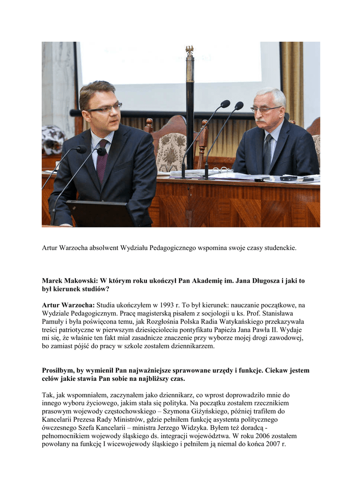 Artur Warzocha absolwent Wydziału Pedagogicznego wspomina swoje czasy studenckie. Marek Makowski: W którym roku ukończył Pan Akademię im. Jana Długosza i jaki to był kierunek studiów? Artur Warzocha: Studia ukończyłem w 1993 r. To był kierunek: nauczanie początkowe, na Wydziale Pedagogicznym. Pracę magisterską pisałem z socjologii u ks. Prof. Stanisława Pamuły i była poświęcona temu, jak Rozgłośnia Polska Radia Watykańskiego przekazywała treści patriotyczne w pierwszym dziesięcioleciu pontyfikatu PapieŜa Jana Pawła II. Wydaje mi się, Ŝe właśnie ten fakt miał zasadnicze znaczenie przy wyborze mojej drogi zawodowej, bo zamiast pójść do pracy w szkole zostałem dziennikarzem. Prosiłbym, by wymienił Pan najwaŜniejsze sprawowane urzędy i funkcje. Ciekaw jestem celów jakie stawia Pan sobie na najbliŜszy czas. Tak, jak wspomniałem, zaczynałem jako dziennikarz, co wprost doprowadziło mnie do innego wyboru Ŝyciowego, jakim stała się polityka. Na początku zostałem rzecznikiem prasowym wojewody częstochowskiego – Szymona GiŜyńskiego, później trafiłem do Kancelarii Prezesa Rady Ministrów, gdzie pełniłem funkcję asystenta politycznego ówczesnego Szefa Kancelarii – ministra Jerzego Widzyka. Byłem teŜ doradcą pełnomocnikiem wojewody śląskiego ds. integracji województwa. W roku 2006 zostałem powołany na funkcję I wicewojewody śląskiego i pełniłem ją niemal do końca 2007 r. Obecnie pracuję w NajwyŜszej Izbie Kontroli i w Instytucie Nauk Politycznych naszej Akademii. Przez dwie kadencje byłem równieŜ radnym Częstochowy, gdzie pełniłem szereg funkcji, łącznie z funkcją wiceprzewodniczącego Rady Miasta. Od 2010 r. jestem równieŜ radnym Sejmiku Województwa Śląskiego. Moje cele na najbliŜsze lata to napisanie doktoratu i dalsze angaŜowanie się na rzecz spraw dotyczących naszego miasta i regionu. Co dały Panu studia w AJD? Studia dały mi pięć najpiękniejszych lat mojego Ŝycia, podczas których uczyłem się Ŝyć samodzielnie, poznałem wspaniałą dziewczynę, która dzisiaj jest moją Ŝoną, poznałem niesamowitych ludzi, z którymi utrzymuje kontakt do dzisiaj, a takŜe śpiewałem w znakomitym chórze - wówczas jeszcze akademickim - „Collegium Cantorum”. W moim przypadku studia w Częstochowie odcisnęły tak trwałe piętno, Ŝe po ich zakończeniu, wraz z Ŝoną podjęliśmy decyzję o tym, Ŝe pozostajemy w tym mieście i tutaj układamy sobie nasze wspólne Ŝycie. Nasze miasteczko akademickie to dla nas takie miejsce niemal codziennych, sentymentalnych powrotów do miejsc wspólnych spacerów, spotkań z przyjaciółmi, przeŜywanych stresów, związanych z nauką. Olbrzymią przyjemność sprawia mi to, Ŝe dzisiaj, jako nauczyciel akademicki spotykam się ze studentami w miejscach, gdzie dwadzieścia lat temu sam jeszcze przychodziłem, jako student. Jakie umiejętności nabyte w AJD i w jaki sposób wykorzystuje Pan w pracy? No cóŜ, na studiach szybko przekonałem się, Ŝe szkoła nie jest moim powołaniem. Stąd wzięła się moja świadoma decyzja o rezygnacji z wykonywania tego zawodu w przyszłości. Jednak Ŝycie przynosi niespodzianki i uczy, Ŝe kaŜda zdobyta wiedza moŜe się kiedyś przydać. I tak, z problemami edukacji zetknąłem się po raz pierwszy jako radny, który w roku 1999, po tzw. „reformie gimnazjalnej” musiał podejmować decyzje dotyczące utworzenia nowej siatki szkół. Jednak w pełni wykorzystałem swoją wyuczoną wiedzę kiedy byłem wicewojewodą i nadzorowałem szkolnictwo w województwie śląskim. Muszę przyznać, Ŝe współpraca na tym polu ze śląskim kuratorem oświaty oraz ministrem edukacji dała mi wielką satysfakcję i wspólnie moŜemy się poszczycić tym, Ŝe nie dopuściliśmy do zamknięcia Ŝadnej szkoły z powodów pseudoekonomicznych. Czy poleca Pan studia w AJD kandydatom, a jeśli tak to z jakich powodów? Oczywiście, Ŝe polecam studia w AJD, choć trudno wyróŜnić tutaj jakiś konkretny kierunek. Warto zwrócić uwagę na to, Ŝe pomimo licznych, niesprzyjających, czy - wręcz noszących znamiona kryzysowych – okoliczności nasza Akademia mozolnie pnie się w górę w róŜnego rodzaju rankingach wyŜszych uczelni i cały czas się rozwija. Oprócz coraz lepszej bazy dydaktycznej, czyli coraz lepszych, Ŝeby nie powiedzieć: coraz bardziej komfortowych warunków do studiowania, mamy coraz lepszą i lepiej wykwalifikowaną kadrę akademicką. JeŜeli chodzi o studentów, to muszę powiedzieć, z własnego doświadczenia, Ŝe w przewaŜającej części są to inteligentni i ambitni młodzi ludzie, którzy są w stanie wejść w bardzo pozytywne i kulturalne relacje z wykładowcami, z zachowaniem właściwego wzajemnego dystansu i wymagań. Co powinno się studiować? - czy tylko kierunki zapewniające zatrudnienie, czy takŜe takie które zapewniają rozwój duchowy lub wiąŜą się z zainteresowaniami? To pytanie dotyczy akurat dylematów, które na co dzień przeŜywają moi podopieczni, czyli adepci nauk politycznych, którzy usłyszeli niedawno z ust bardzo waŜnego polityka, Ŝe lepszy jest dobrze wyszkolony spawacz, niŜ kiepski politolog, co w domyśle znaczyło tyle, Ŝe stawiać naleŜy na rozwój prostych, zapewniający byt umiejętności zawodowych, niŜ na wiedzę i rozwój duchowy. Najlepszą odpowiedzią na to pytanie niech będzie to, co powiedzieli nasi studenci, a mianowicie, Ŝe czasy, a w tym modne teorie, politycy, ideologie przemijają, a oni ciągle mają nieposkromiony apetyt na czytanie ksiąŜek i zdobywanie wiedzy. Wydaje mi się, Ŝe w tych młodych ludziach dzisiaj cała nadzieja i Ŝe od nich moŜemy czerpać siłę, by dalej walczyć o rozwój naszej Akademii. JeŜeli tego zabraknie i nasza uczelnia zamiast dalej rozwijać się, zaczęłaby się kurczyć, to następne pod nóŜ pójdą kolejne uczelnie, łącznie z najbardziej renomowanymi. I do tego nie wolno nam dopuścić, bo to walka 