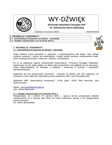 WY-DŹWIĘK Komenda Gdańskiej Chorągwi ZHP im. Bohaterów Ziemi Gdańskiej Gdańsk, 10 czerwca 2016 r. 19/KCH/2016 2. INFORMACJE I KOMUNIKATY 2.1. Komunikacja Kryzysowa na obozie – warsztaty 2.2. Składki członkowskie za II kwartał 2016 r. 2. INFORMACJE I KOMUNIKATY 2.1. Komunikacja Kryzysowa na obozie – warsztaty Przed obozem warto pomyśleć o zajęciach z bezpieczeństwa dla kadry. Gdy jednak zrobimy wszystko i zdarzy się nieszczęście, trzeba szybko sprostać oczekiwaniom osób, które oczekują informacji: rodzicom, mediom, przełożonym. Po to są najbliższe zajęcia Uniwersytetu Komunikacji i Promocji Chorągwi Gdańskiej. Zapraszamy na nie osoby jadące na obozy jako komendanci (szczególnie po raz pierwszy), osoby odpowiedzialne za kontakty z mediami i promocję w hufcach i wszystkich zainteresowanych. Zajmiemy się też pozytywnymi sprawami – przecież na obozie jest tak cudownie, że niekiedy to nasz może być odwiedzony przez protektora ZHP, czyli Prezydenta RP. Spotkanie UKIP „Komunikacja kryzysowa”, 14.06, godz. 18.00. Dom Harcerza, Sala konferencyjna. Zapisy: [email protected]. phm. Marta Bednarska 2.2. Składki członkowskie za II kwartał 2016 r. Przypominam, że z dniem 27 czerwca 2016 r. upływa termin przekazania składek członkowskich za II kwartał roku 2016. W miarę możliwości proszę o ich uregulowanie przed terminem. hm. Marek Boraczyński