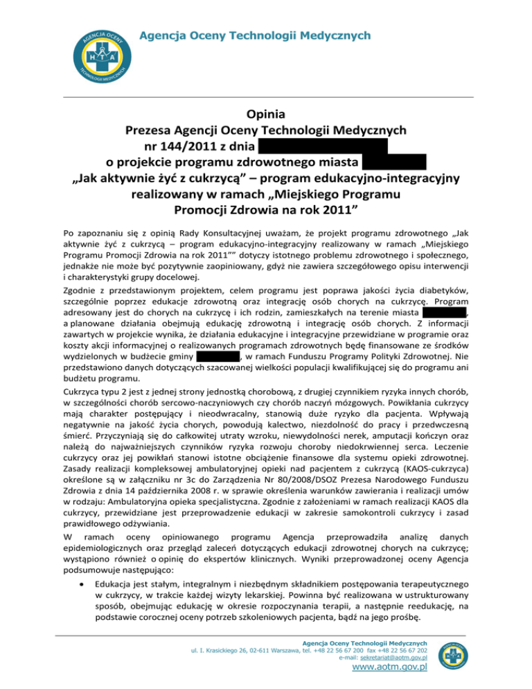 Agencja Oceny Technologii Medycznych Opinia Prezesa Agencji Oceny Technologii Medycznych nr 144/2011 z dnia o projekcie programu zdrowotnego miasta „Jak aktywnie żyć z cukrzycą” – program edukacyjno‐integracyjny realizowany w ramach „Miejskiego Programu Promocji Zdrowia na rok 2011” Po zapoznaniu się z opinią Rady Konsultacyjnej uważam, że projekt programu zdrowotnego „Jak aktywnie żyć z cukrzycą – program edukacyjno‐integracyjny realizowany w ramach „Miejskiego Programu Promocji Zdrowia na rok 2011”” dotyczy istotnego problemu zdrowotnego i społecznego, jednakże nie może być pozytywnie zaopiniowany, gdyż nie zawiera szczegółowego opisu interwencji i charakterystyki grupy docelowej. Zgodnie z przedstawionym projektem, celem programu jest poprawa jakości życia diabetyków, szczególnie poprzez edukacje zdrowotną oraz integrację osób chorych na cukrzycę. Program adresowany jest do chorych na cukrzycę i ich rodzin, zamieszkałych na terenie miasta , a planowane działania obejmują edukację zdrowotną i integrację osób chorych. Z informacji zawartych w projekcie wynika, że działania edukacyjne i integracyjne przewidziane w programie oraz koszty akcji informacyjnej o realizowanych programach zdrowotnych będę finansowane ze środków wydzielonych w budżecie gminy , w ramach Funduszu Programy Polityki Zdrowotnej. Nie przedstawiono danych dotyczących szacowanej wielkości populacji kwalifikującej się do programu ani budżetu programu. Cukrzyca typu 2 jest z jednej strony jednostką chorobową, z drugiej czynnikiem ryzyka innych chorób, w szczególności chorób sercowo‐naczyniowych czy chorób naczyń mózgowych. Powikłania cukrzycy mają charakter postępujący i nieodwracalny, stanowią duże ryzyko dla pacjenta. Wpływają negatywnie na jakość życia chorych, powodują kalectwo, niezdolność do pracy i przedwczesną śmierć. Przyczyniają się do całkowitej utraty wzroku, niewydolności nerek, amputacji kończyn oraz należą do najważniejszych czynników ryzyka rozwoju choroby niedokrwiennej serca. Leczenie cukrzycy oraz jej powikłań stanowi istotne obciążenie finansowe dla systemu opieki zdrowotnej. Zasady realizacji kompleksowej ambulatoryjnej opieki nad pacjentem z cukrzycą (KAOS‐cukrzyca) określone są w załączniku nr 3c do Zarządzenia Nr 80/2008/DSOZ Prezesa Narodowego Funduszu Zdrowia z dnia 14 października 2008 r. w sprawie określenia warunków zawierania i realizacji umów w rodzaju: Ambulatoryjna opieka specjalistyczna. Zgodnie z założeniami w ramach realizacji KAOS dla cukrzycy, przewidziane jest przeprowadzenie edukacji w zakresie samokontroli cukrzycy i zasad prawidłowego odżywiania. W ramach oceny opiniowanego programu Agencja przeprowadziła analizę danych epidemiologicznych oraz przegląd zaleceń dotyczących edukacji zdrowotnej chorych na cukrzycę; wystąpiono również o opinię do ekspertów klinicznych. Wyniki przeprowadzonej oceny Agencja podsumowuje następująco: Edukacja jest stałym, integralnym i niezbędnym składnikiem postępowania terapeutycznego w cukrzycy, w trakcie każdej wizyty lekarskiej. Powinna być realizowana w ustrukturowany sposób, obejmując edukację w okresie rozpoczynania terapii, a następnie reedukację, na podstawie corocznej oceny potrzeb szkoleniowych pacjenta, bądź na jego prośbę. Agencja Oceny Technologii Medycznych ul. I. Krasickiego 26, 02-611 Warszawa, tel. +48 22 56 67 200 fax +48 22 56 67 202 e-mail: [email protected] www.aotm.gov.pl Opinia Prezesa AOTM nr 144/2011 z dnia Celem edukacji pacjenta jest wspieranie go w samodzielnym postępowaniu z cukrzycą (self‐ management training) oraz w modyfikacji stylu życia, ze względu na zalecany sposób odżywiania oraz aktywność fizyczną. W cukrzycy typu 2 szczególne znaczenie ma kwestia otyłości. Zalecane jest równoległe prowadzenie zindywidualizowanej edukacji oraz tworzenie grupowych programów edukacyjnych. Program edukacji pacjenta powinien być tworzony przy udziale chorego i jego lekarza oraz pozostawać w ścisłym związku i koordynacji z zalecanym sposobem leczenia cukrzycy. Pacjent powinien być aktywnym członkiem zespołu terapeutycznego. Podstawę edukacji stanowi ustalenie indywidualnych celów postępowania w cukrzycy, z uwzględnieniem trudności specyficznych dla danej osoby. Program edukacji powinien zawierać kształtowanie wpływu na przebieg choroby, ponieważ sama wiedza nie jest wystarczająca do optymalnego postępowania w cukrzycy. Edukację powinny prowadzić odpowiednio przeszkolone osoby (lekarze, pielęgniarki, dietetycy, natomiast w długoterminowej perspektywie należy dążyć do ukształtowania zawodu medycznego — edukatora diabetologicznego). W edukacji powinni brać również udział członkowie zespołu terapeutycznego, reprezentujący różne zawody medyczne. Edukacja wstępna chorego na cukrzycę leczonego dietą lub dietą i doustnymi lekami hipoglikemizującymi powinna trwać co najmniej 5 godzin, natomiast pacjenta leczonego insuliną — około 9 godzin. Należy ją kontynuować przez cały rok, przeznaczając łącznie na ten cel 5–9 godzin dla chorych na cukrzycę typu 2, a w przypadkach cukrzycy typu 1 — co najmniej 7–14 godzin. W następnych latach czas przeznaczony na reedukację musi być uzależniony od zasobu wiedzy, którą przyswoił pacjent, od liczby błędów popełnianych przez chorego, a także od rodzaju pojawiających się ewentualnie powikłań czy chorób towarzyszących. W przypadku edukacji terapeutycznej dzieci, metody i programy edukacyjne powinny być zróżnicowane i dostosowane do zmian zachodzących w rozwoju zdolności intelektualnych dziecka oraz zadań wychowawczych rodziców. Ocena programów edukacyjnych dla chorych na cukrzycę powinna być ukierunkowana na ocenę wyników takich jak: zdolność pacjenta do osiągnięcia samodzielnie określonych celów leczenia cukrzycy, poprawa adaptacji psychospołecznej