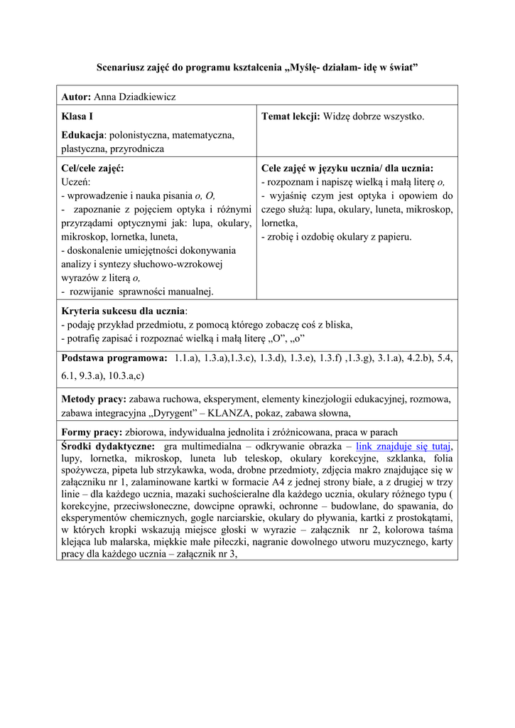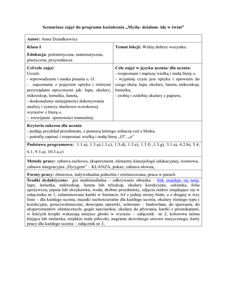 Scenariusz zajęć do programu kształcenia „Myślę- działam- idę w świat” Autor: Anna Dziadkiewicz Klasa I Temat lekcji: Widzę dobrze wszystko. Edukacja: polonistyczna, matematyczna, plastyczna, przyrodnicza Cel/cele zajęć: Uczeń: - wprowadzenie i nauka pisania o, O, - zapoznanie z pojęciem optyka i różnymi przyrządami optycznymi jak: lupa, okulary, mikroskop, lornetka, luneta, - doskonalenie umiejętności dokonywania analizy i syntezy słuchowo-wzrokowej wyrazów z literą o, - rozwijanie sprawności manualnej. Cele zajęć w języku ucznia/ dla ucznia: - rozpoznam i napiszę wielką i małą literę o, - wyjaśnię czym jest optyka i opowiem do czego służą: lupa, okulary, luneta, mikroskop, lornetka, - zrobię i ozdobię okulary z papieru. Kryteria sukcesu dla ucznia: - podaję przykład przedmiotu, z pomocą którego zobaczę coś z bliska, - potrafię zapisać i rozpoznać wielką i małą literę „O”, „o” Podstawa programowa: 1.1.a), 1.3.a),1.3.c), 1.3.d), 1.3.e), 1.3.f) ,1.3.g), 3.1.a), 4.2.b), 5.4, 6.1, 9.3.a), 10.3.a,c) Metody pracy: zabawa ruchowa, eksperyment, elementy kinezjologii edukacyjnej, rozmowa, zabawa integracyjna „Dyrygent” – KLANZA, pokaz, zabawa słowna, Formy pracy: zbiorowa, indywidualna jednolita i zróżnicowana, praca w parach Środki dydaktyczne: gra multimedialna – odkrywanie obrazka – link znajduje się tutaj, lupy, lornetka, mikroskop, luneta lub teleskop, okulary korekcyjne, szklanka, folia spożywcza, pipeta lub strzykawka, woda, drobne przedmioty, zdjęcia makro znajdujące się w załączniku nr 1, zalaminowane kartki w formacie A4 z jednej strony białe, a z drugiej w trzy linie – dla każdego ucznia, mazaki suchościeralne dla każdego ucznia, okulary różnego typu ( korekcyjne, przeciwsłoneczne, dowcipne oprawki, ochronne – budowlane, do spawania, do eksperymentów chemicznych, gogle narciarskie, okulary do pływania, kartki z prostokątami, w których kropki wskazują miejsce głoski w wyrazie – załącznik nr 2, kolorowa taśma klejąca lub malarska, miękkie małe piłeczki, nagranie dowolnego utworu muzycznego, karty pracy dla każdego ucznia – załącznik nr 3, Przebieg zajęć Działania uczniów 1. Odkrywa zdjęcia umieszczone w zadaniu interaktywnym i odgaduje co się na nich znajduje. „Drogowskazy” -wskazówki i uwagi o realizacji Centra Aktywnej Edukacji Zadanie na dobry początek. polonistycznoNauczyciel wita uczniów i zaprasza do komunikacyjne odgadnięcia co znajduje się na zdjęciu prezentowanym na tablicy interaktywnej (jest to zdjęcie makro przedstawiające w zbliżeniu mech). Gdy uczniowie mają trudności z odgadnięciem, co znajduje się na zdjęciu, prosi o odkrycie drugiego obrazka w tym zadaniu i prosi o nazwanie tego co się na nim znajduje ( ten sam mech tylko sfotografowany z większej odległości). W tym momencie można również wyświetlić uczniom zestaw zdjęć makro – przedstawiających różne przedmioty w dużym zbliżeniu. Zadaniem dzieci jest odgadnięcie, co znajduje się na fotografii. Załącznik nr 1 Kolejnym zadaniem uczniów jest odgadnięcie, co znajduje się na trzecim zdjęciu (jest to zdjęcie przedstawiające naskórek ludzki widziany pod mikroskopem) Po odsłonięciu trzeciego obrazka nauczyciel daje uczniom czas na snucie domysłów i przypuszczeń. 2. Rozmawia w parze, o tym co może znajdować się na zdjęciu. Można zastosować technikę Wymiana polonistycznow parach – uczniowie w parach rozmawiają komunikacyjne o tym, co według nich znajduje się na zdjęciu. Pozwala dzieciom „puścić wodze fantazji” informuje, że nie ma złej odpowiedzi, każdy pomysł jest dobry, a zadaniem pary jest wymienienie się swoimi pomysłami, można też stworzyć wspólny opis zdjęcia – interpretacja pary. Oba wcześniejsze ćwiczenia są sytuacją wyjściową do rozmowy i prezentacji przyrządów optycznych. 3. Oglądają, Nauczyciel ustawia przed uczniami manipulują i następujące przedmioty: lupę, okulary nazywają różne korekcyjne, mikroskop, lunetę, lornetkę. przyrządy Dzieci mają możliwość dotknąć każdy z nich optyczne. i wypróbować możliwości tego urządzenia (należy zwrócić uwagę, by dzieci nie przymierzały okularów – chyba że będą to tzw. zerówki). matematycznoprzyrodnicze i polonistycznokomunikacyjne Nauczyciel prosi uczniów, by spróbowali określić co takiego łączy te przedmioty. Nauczyciel wprowadza pojęcie przyrząd optyczny i wraz z uczniami próbuje je zdefiniować. Wyjaśnienie z Wikipedii: http://pl.wikipedia.org/wiki/Przyrz%C4%85 d_optyczny 4. W parach wykonują szkło powiększające z kropli wody i obserwują wybrany przez siebie przedmiot. Nauczyciel prosi uczniów o dobranie się matematycznow pary. Każda para przygotowuje swoje przyrodnicze miejsce do pracy, stolik, szklankę, pojemniczek z odrobina wody, pipetę lub strzykawkę, folię spożywczą i wybiera drobny przedmiot, który następnie wkłada do szklanki. Uczniowie w parach przeprowadzają doświadczenie polegające na stworzeniu prowizorycznej lupy z kropli wody. Nauczyciel prosi uczniów, by włożyli do szklanki przedmiot, który chcieliby zobaczyć z bliska, obejrzeć jego szczegóły. Następnie każda para zakrywa wierzch szklanki dobrze naciągniętą folią spożywczą. Kolejnym krokiem jest umieszczenie na folii kropelki wody przy użyciu pipety lub strzykawki. Następnie dzieci obserwują umieszczony w szklance przedmiot dzięki powstałej lupie. 5. Uczestniczy w integracyjnej zabawie ruchowej – „Dyrygent”. Nauczyciel zaprasza dzieci do wspólnej artystyczno-ruchowe zabawy w kole, a mianowicie stworzenia orkiestry. Spośród wszystkich dzieci wybiera jedną osobę, która na chwilę odwróci się od wszystkich dzieci. W tym czasie nauczyciel wskazuje jedną osobę, która będzie dyrygowała orkiestrą, czyli pokazywała gesty, które reszta dzieci będzie naśladowała. Nauczyciel uwrażliwia dzieci, by gesty by