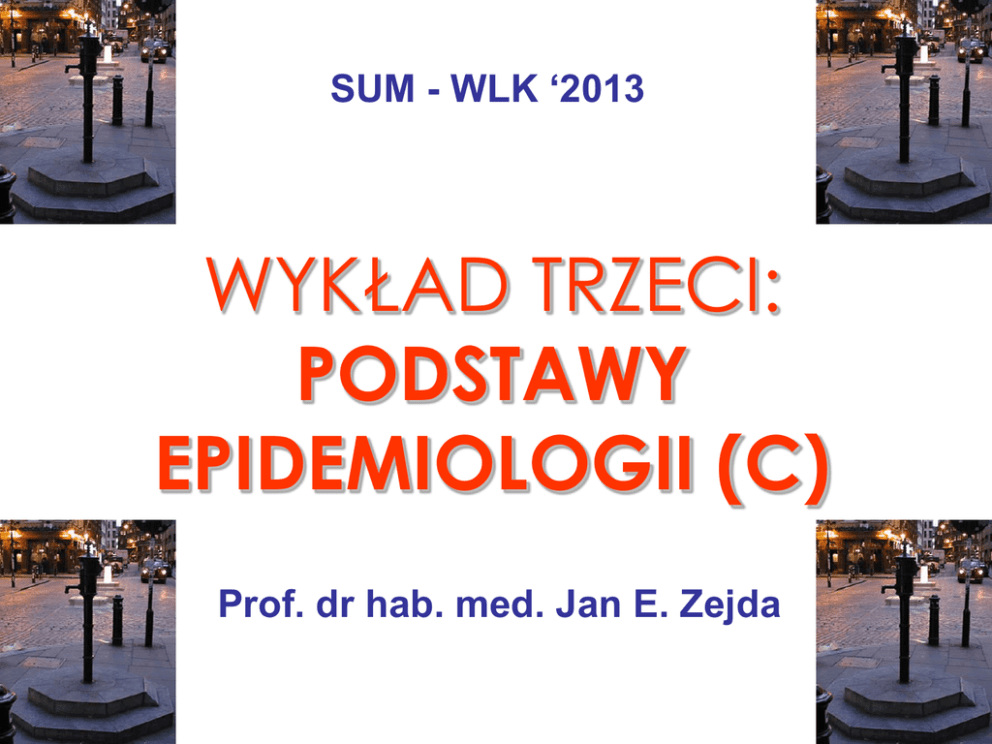 SUM - WLK ‘2013 WYKŁAD TRZECI: PODSTAWY EPIDEMIOLOGII (C) Prof. dr hab. med. Jan E. Zejda TREŚĆ DZISIEJSZEGO WYKŁADU PODSTAWOWE MIARY STANU ZDROWIA ZWIĄZANE Z BADANIEM OPISOWYM Umieralność Śmiertelność Chorobowość Zachorowalność UMIERALNOŚĆ Umieralność oznacza liczbę zgonów, które występują w danym okresie, z reguły w roku kalendarzowym. Wyróżnia się umieralność ogólną (liczba wszystkich zgonów) i umieralność specyficzną (liczba zgonów z powodu specyficznej choroby). Miarą umieralności jest współczynnik umieralności, który oblicza się jako iloraz zgonów w danej populacji (licznik) i liczby członków tej populacji (mianownik), zgodnie z formułami: Współczynnik umieralności ogólnej = liczba wszystkich zgonów w populacji P w okresie t / liczebność populacji P w okresie t Współczynnik umieralności specyficznej = liczba wszystkich zgonów z powodu danej choroby w populacji P w okresie t / liczebność populacji P w okresie t UMIERALNOŚĆ OGÓLNA UMIERALNOŚĆ SPECYFICZNA (PL) (GUS ROCZNIK DEMOGRAFICZNY) STRUKTURA UMIERALNOŚCI Pozostałe przyczyny Urazy, zatrucia Choroby układu krązenia Now otw ory * - Goryński P., Wojtyniak B., Kuszewski K.: Monitoring oczekiwanych efektów realizacji Narodowego Programu Zdrowia. PZH, Warszawa 2004 PRZEDWCZESNA UMIERALNOŚĆ Umieralność, której – w danym przedziale wieku - można zapobiec poprzez skuteczne działania reprezentujące promocję zdrowia, profilaktykę chorób, a także właściwe postępowanie diagnostyczne, terapeutyczne i rehabilitacyjne. Umieralność przedwczesna, analizowana także jako ‘zgony do uniknięcia’ jest kompleksowym miernikiem skuteczności systemu ochrony zdrowia, w odniesieniu do kontroli zachorowalności i śmiertelności w wybranych grupach chorób, w wymiarze populacyjnym. Klasyczna cezura czasowa: wiek = 65 lat Kryterium OECD: wiek = 70 lat W Polsce, w dekadzie 1990-2000 doszło do zmniejszenia u.p. („65 lat”): - choroby układu krążenia: z 136,8/100000 do 95,5/100000 - urazy i zatrucia: z 66,8/100000 do 55,6/100000 ŚMIERTELNOŚĆ Śmiertelność łączy się bezpośrednio z umieralnością i oznacza strukturę zgonów w analizowanych przypadkach chorobowych. Współczynnik śmiertelności oblicza się jako iloraz liczby zgonów z powodu danej choroby (licznik) i liczby osób chorych na tę chorobę (mianownik), zgodnie z formułą: Współczynnik śmiertelności = liczba zgonów z powodu choroby X w czasie t / liczba chorych na chorobę X w czasie t ŚMIERTELNOŚĆ Śmiertelność w / z powodu próchnicy: 0% Śmiertelność w / z powodu zapalenia otrzewnej: 10% Śmiertelność w / z powodu raka trzustki: 95% Miara agresywności choroby i skuteczności diagnostycznej oraz terapeutycznej Uwaga 1: Śmiertelność może odzwierciedlać śmiertelność w danym roku, albo w całej historii naturalnej analizowanej choroby. Drugi wariant bardziej poprawny (są choroby „bardziej lub mniej śmiertelne”). Uwaga 2: Obserwacja śmiertelności w całym przebiegu choroby to zadanie czasochłonne. Często określa się śmiertelność w obserwacji pięcioletniej, co jest stosowane np. w onkologii i lepiej znane jako „przeżycie pięcioletnie” od momentu rozpoznania / wdrożenia leczenia danej choroby (przeżywalność jest w tym przypadku „odwrotnością” śmiertelności). Uwaga 3: Konkurencyjne przyczyny zgonu mogą maskować rzeczywisty wymiar śmiertelności (np. samobójstwo chorego na raka trzustki) CHOROBOWOŚĆ Chorobowość jest definiowana jako częstość występowania danej choroby. Częstość występowania choroby dotyczy danego momentu (chorobowość punktowa) lub może być określana w sprecyzowanym przedziale czasowym (chorobowość okresowa). Chorobowość jest mierzona współczynnikiem chorobowości, który oblicza się jako iloraz liczby osób chorych (licznik) i liczby osób „narażonych” na chorobę (mianownik): Współczynnik chorobowości = liczba osób chorych w populacji P w momencie t / liczba osób narażonych w populacji P CHOROBOWOŚĆ Z POWODU CHORÓB ALERGICZNYCH U DZIECI (SOSNOWIEC – 2000) 20 15 (%) 10 5 0 Astm a oskrzelow a ANN Chłopcy AZS Dziew czynki Chorobowość punktowa („środek” 2000 roku): 5% = 5/100 = 50 / 1000 = 500 / 10000 ZACHOROWALNOŚĆ Zachorowalność (zapadalność) na daną chorobę jest definiowana jako wystąpienie nowego przypadku tej choroby. Zachorowalność jest mierzona współczynnikiem zachorowalności (zapadalności). Współczynnik zachorowalności oblicza się dzieląc liczbę nowych przypadków choroby w danej populacji i w danym okresie (licznik) przez liczbę członków tej populacji (mianownik). Najczęściej, w mianowniku podaje się wielkość populacji w środku okresu, w którym rejestruje się zapadalność: Współczynnik zachorowalności = liczba nowych zachorowań w populacji P w okresie t / liczebność populacji narażonej P w okresie t MIARY ZAPADALNOŚCI WSP. ZAPADALNOŚCI Liczba Zachorowań NASZ PRZYKŁAD 3/64 = 0.05 rok -1 Osobolata ODSETKOWY WSP. ZAPADALNOŚCI Liczba Zachorowań 3/10 = 0,3 = 30% Liczba Narażonych na Zachorowanie ILORAZ SZANS ZAPADALNOŚCI Liczba Zachorowań Liczba Nie-zachorowań 3/(10-3) = 3:7 ZAPADALNOŚĆ - MIARY X 10 Liczba Dzieci 9 Okres Zdrowia 8 7 X 6 5 4 3 X 2 X Początek Astmy 1 0 1 2 3 4 5 6 7 Liczba Lat Obserwacji Trzy przypadki astmy w ciągu 7 lat obserwacji obejmującej 10 dzieci. - Istotne pytanie: Ile czasu trzeba, aby doszło do zachorowania na astmę ? - Np. u dziecka nr 5 potrzeba 6 lat, nazywanych „osobolatami” Wniosek: Zapadalność na astmę w w/w badaniu ma wymiar 3 / (7*7+4+6+5) = 3 / 64 osobolata MIARY ZAPADALNOŚCI WSP. ZAPADALNOŚCI Najczęstszy sposób zapadalności Liczbaprezentacji Zachorowań Osobolata ODSETKOWY WSP. ZAPADALNOŚCI Liczba Zachorowań Liczba Narażonych na Zachorowanie Zwykle współczynnik zapadalności opisuje liczbę nowych przypadków w krótkim okresie, np. w roku kalendarzowym – pu