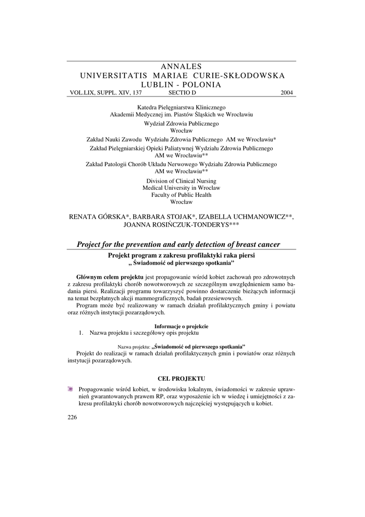 ANNALES UNIVERSITATIS MARIAE CURIE-SKŁODOWSKA LUBLIN - POLONIA VOL.LIX, SUPPL. XIV, 137 SECTIO D 2004 Katedra Pielęgniarstwa Klinicznego Akademii Medycznej im. Piastów Śląskich we Wrocławiu Wydział Zdrowia Publicznego Wrocław Zakład Nauki Zawodu Wydziału Zdrowia Publicznego AM we Wrocławiu* Zakład Pielęgniarskiej Opieki Paliatywnej Wydziału Zdrowia Publicznego AM we Wrocławiu** Zakład Patologii Chorób Układu Nerwowego Wydziału Zdrowia Publicznego AM we Wrocławiu** Division of Clinical Nursing Medical University in Wroclaw Faculty of Public Health Wrocław RENATA GÓRSKA*, BARBARA STOJAK*, IZABELLA UCHMANOWICZ**, JOANNA ROSIŃCZUK-TONDERYS*** Project for the prevention and early detection of breast cancer Projekt program z zakresu profilaktyki raka piersi „ Świadomość od pierwszego spotkania” Głównym celem projektu jest propagowanie wśród kobiet zachowań pro zdrowotnych z zakresu profilaktyki chorób nowotworowych ze szczególnym uwzględnieniem samo badania piersi. Realizacji programu towarzyszyć powinno dostarczenie bieżących informacji na temat bezpłatnych akcji mammograficznych, badań przesiewowych. Program może być realizowany w ramach działań profilaktycznych gminy i powiatu oraz różnych instytucji pozarządowych. Informacje o projekcie 1. Nazwa projektu i szczegółowy opis projektu Nazwa projektu: „Świadomość od pierwszego spotkania” Projekt do realizacji w ramach działań profilaktycznych gmin i powiatów oraz różnych instytucji pozarządowych. CEL PROJEKTU Propagowanie wśród kobiet, w środowisku lokalnym, świadomości w zakresie uprawnień gwarantowanych prawem RP, oraz wyposażenie ich w wiedzę i umiejętności z zakresu profilaktyki chorób nowotworowych najczęściej występujących u kobiet. 226 Podnoszenie świadomości prawnej kobiet, oraz świadomości zdrowotnej obejmującej profilaktykę chorób nowotworowych. Szkolenie kobiet z zakresu prawa oraz profilaktyki najczęściej występujących w danej grupie schorzeń nowotworowych. Zakres tematyczny szkolenia L.p. 1. 2. 3. 4. 5. 6. 7. 8. 9. 10. 11. TEMATYKA Uprawnienia kobiet gwarantowane prawem RP. Czynniki warunkujące zdrowie z analizą zachowań prozdrowotnych własnych. Profilaktyka chorób nowotworowych w ujęciu kodeksu przeciwrakowego. Czynniki ryzyka warunkujące zachorowania na raka piersi. Ankietowa ocena własnego ryzyka. Kalendarz badań profilaktycznych w grupach wiekowych i grupach ryzyka. Przesiewowe badania mammograficzne w środowisku lokalnym. Różnicowanie zmian fizjologicznych piersi w różnych etapach życiowych kobiety oraz zmian chorobowych. Znaczenie samokontroli w profilaktyce raka sutka – cele samobadania. Metody samokontroli – zasady, etapy, sposoby. Metody samokontroli w działaniu profilaktycznym. Różnicowanie zmian w piersi w badaniu palpacyjnym. Analiza zdobytej wiedzy i umiejętności w aspekcie wykorzystania w propagowaniu zachowań prozdrowotnych. ILOŚĆ GODZIN 2 TYP SPOTKANIA Informacyjne 1 Informacyjne 1 Informacyjne 1 Informacyjne 1 Edukacyjne 1 Edukacyjne 1 Edukacyjne 2 Edukacyjne 2 Ewaluacyjne 2 Ewaluacyjne 1 Ewaluacyjne OPIS PLANOWANYCH DZIAŁAŃ Cykl szkoleniowy obejmuje 3 kolejne spotkania – spotkanie informacyjne, edukacyjne i ewaluacyjne. Spotkania odbywałyby się w soboty (dzień wolny) co 2 tygodnie. Godziny spotkań akceptowane przez uczestników należy ustalać na bieżąco i powinny być dostosowane do potrzeb środowiska. Najdogodniejszą porą roku do wdrożenia programu w środowisku wiejskim jest późna jesień i zima. Liczba edukowanych kobiet. W szkoleniu „Świadomość od pierwszego spotkania” założyć należy, że przeszkolonych będzie 600 kobiet (30 grup 20-sto osobowych) stanowiących grupę wolontariuszek propagujących zdobytą wiedzę i umiejętności w swoim środowisku rodzinnym i pracy. Liczba godzin. Szkolenie będzie realizowane w ciągu 450 godzin dydaktycznych gdzie główną metodą będą ćwiczenia. Przewiduje się 30 grup szkolonych w cyklu 15 godzin 227 dydaktycznych (w tym 6 godzin wykładu i 9 godzin ćwiczeń). Grupa odbędzie 3 spotkania 5- cio godzinne. Prowadzący szkolenie Prowadzący szkolenia przyszłych wolontariuszy propagujących zdobytą wiedzę i umiejętności w środowisku lokalnym: Lekarz ginekolog, lekarz rodzinny, pielęgniarka środowiskowa/rodzinna, pielęgniarka szkolna, pielęgniarka podstawowej opieki zdrowotnej, edukatorzy pozyskiwani z grupy nauczycieli szkół, radca prawny Opis miejsca przeprowadzania szkolenia. Przewiduje się głównie wykorzystanie sal dydaktycznych szkół wiejskich wyposażonych w sprzęt audiowizualny. Uczestnicy / adresaci szkolenia, sposób naboru uczestników. Przeszkolonych zostanie 600 kobiet w wieku od 35 do 58 lat (ze względu na największą zapadalność na choroby nowotworowe w danej grupie wiekowej) we wsiach, małych miasteczkach, pozyskiwanych poprzez ogłoszenia w parafiach, zgłoszenia dyrektorów placówek oświatowych oraz poprzez ogłoszenia w mediach lokalnych. Sposób oceny realizacji projektu oraz spodziewane efekty. Ocena na podstawie: ankiety ewaluacyjnej oceniającej efektywność przeprowadzonego programu oraz określającej zakres i skuteczność działań wolontariuszy w ich środowisku lokalnym badań statystycznych – gdzie porównany będzie zakres i częstość badań jakie kobiety dotychczas wykonywały ( dane zebrane podczas pierwszego spotkania) z tymi samymi danymi zebranymi po zakończeniu szkolenia. Spodziewanym efektem będzie: wzrost wiedzy na temat uprawnień kobiet z zakresu ochrony zdrowia gwarantowanych prawem RP, wzrost wiedzy na temat profilaktyki chorób nowotworowych narządów rodnych i sutka pozyskanie bieżącej informacji z zakresu przesiewowych badań mammograficznych pozyskanie umiejętności samoobserwacji i samobadania piersi Informacje na temat instytucji współpracujących przy realizacji projektu Dyrektorzy przedszkoli, szkół podstawowych i gimnazjów oraz urz