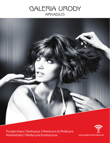 Fryzjerstwo | Stylizacja | Manicure & Pedicure Kosmetyka | Medycyna Estetyczna www.galeriaarkadius.pl facebook.com/galeriaurodyarkadius STYLIZACJA Modelowanie Prostowanie keratynowe STEAMPOD Modelowanie loki Upięcia – kok Upięcie sylwestrowe / ślubne Warkocz Beach Waves Trwała Kuracja KERATYNOWA - trwałe prostowanie Cover (tuszowanie siwych włosów) Przedłużanie włosów KRÓTKIE ŚREDNIE DŁUGIE 45 zł 65 zł 55 zł 75 zł 75 zł 130 - 160 zł 180 - 220 zł 65 zł 85 zł 90 zł 160 - 220 zł 200 - 250 zł od 50 zł od 150 zł 185 zł 400 - 1000 zł 130 zł 180 zł 165 zł 400 - 1000 zł od 50 zł cena ustalana po konsultacji z fryzjerem 145 zł W ramach usługi wliczona stylizacja STRZYŻENIE Strzyżenie damskie Strzyżenie męskie Strzyżenie nakładką Strzyżenie dziecka (do 7 lat) Grzywka, wąsy, broda 60 zł 50 zł 30 zł 30 - 40 zł 10 zł 75 zł 50 zł 85 zł 50 zł 40 - 50 zł 10 zł 50 - 60 zł 10 zł 195 zł 225 zł 175 zł 205 zł 225 zł od 65 zł od 100 zł 270 zł 215 zł 245 zł 185 zł 225 zł 245 zł od 75 zł od 110 zł 290 zł 235 zł 265 zł 205 zł 245 zł 265 zł od 85 zł od 120 zł 315 zł 40 / 30 zł 50 zł 40 / 30 zł 50 zł 40 / 30 zł 50 zł 80 zł 80 zł 80 zł 110 zł 590 zł 149 zł 110 zł 110 zł W ramach usługi wliczona stylizacja KOLORYZACJA Farba Loreal Majirel/ Cool Cover/Luo Color Farba Loreal INOA – bez amoniaku Farba Loreal DIA RICHESSE/LIGHT RICHESSE Baleyage 1 kolor (dodatkowy kolor + 20 zł) Pasemka 1 kolor (dodatkowy kolor + 20 zł) Demakijaż Dekoloryzacja Farba Ombre W ramach usługi wliczona stylizacja i strzyżenie PIELĘGNACJA Ampułka/ maska LOREAL Rytułał KERASTASE podstawowy (ampułka) Rytułał KERASTASE intensywny (ampułka+maska+sauna) Rytułał KERASTASE eksluzywny (ampułka+buster+maska+sauna) Pakiet 6 zabiegów Kerastase eksluzywny Rytuał Dyscypline Indywidualna konsultacja - bezpłatnie MANICURE Malowanie Klasyczny manicure Manicure SPA Manicure hybrydowy Manicure hybrydowy french Manicure winylowy Manicure Japoński Kąpiel parafinowa dłoni Manicure męski Zdobienie 20 zł 50 zł 70 zł 100 zł 120 zł 80 zł 70 zł 50 zł 50 zł od 15 zł PEDICURE Pedicure klasyczny Pedicure SPA Leczniczy Pedicure SUDA Kąpiel parafinowa stóp Pedicure hybrydowy Pedicure z kwasem Pedicure hybrydowy z kwasem 100 zł 135 zł 120-160 zł 50 zł 150 zł 160 zł 180 zł PAKIETY Manicure + Pedicure Manicure SPA + Pedicure SPA Manicure + Pedicure hybrydowy Manicure + Pedicure w 1 godz! 135- 150 zł 195 zł 250 zł 150 zł PRZEDŁUŻANIE Akryl/żel na naturalne paznokci – utwardzenie własnej płytki Przedłużanie paznokci metodą akrylową/żelową (tradycyjne) (french) Kosmetyka paznokci przedłużanych Zdjęcie tipsów + manicure Uzupełnienie akrylu/żelu (tradycyjne) (french) Akryl/żel na paznokcie u stóp + częściowy pedicure 130 zł 190 zł 200 zł 60 zł 80 zł 120 zł 135 zł 190 zł NIE TRAĆ CZASU ! Manicure i pedicure w 1 godzinę ! Koloryzacja z manicure w 2 godziny ! HENNA Henna brwi/rzęs Regulacja brwi Masaż twarzy Ampułka, maska algowa Peeling kawitacyjny, ampułka, maska algowa Peeling kawitacyjny przy zabiegu Oczyszczanie manualne Oczyszczanie manualne z kwasem Oczyszczanie manualne z peelingiem kawitacyjnym Oczyszczanie manualne z mikrodermabrazją Oczyszcznie pleców REFECTCOIL TANA 20 zł 20 zł 25 zł 20 zł 70 zł 150 zł 190 zł 50 zł 180 zł 250 zł 230 zł 270 zł od 150 zł MIKRODERMABRAZJA DIAMENTOWA / KORUNDOWA Mikrodermabrazja twarzy + ampułka + maska Mikrodermabrazja twarzy + kwas Mikrodermabrazja twarzy, szyj, dekoltu + maska 199 zł 250 zł 250 zł Istnieje możliwość wprowadzenia ampułki ultradźwiękami, bądź infuzją tlenową OXYBRAZJA TLENOWA Oxybrazja twarz + ampułka + maska Oxybrazja twarz, szyja, dekolt + ampułka Oxybrazja okolice oczu i ust Oxybrazja dodatkowo do zabiegu Karnet 6 zabiegów Oxybrazji Istnieje możliwość wprowadzenia ampułki ultradźwiękami, bądź infuzją tlenową 250 zł 290 zł 150 zł 99 zł 6 zabiegów, płacisz za 5! ZABIEGI DR BAUMANN Silna odbudowa skóry z ceramidami Zabieg autorski Dr Bauman Zabieg oczyszczający z masażem + liposomy Zabieg regeneracyjny dla skóry zmęczonej z liposomami wielowarstwowymi i wit. E + C Zabieg regeneracyjny z liposomami wielowarstwowymi i ceramidami dla cery suchej i bardzo suchej Zabieg wzmacniający dla skóry wrażliwej, naczyniowej z kasztanowcem czerwonym Zabieg głęboko nawilżający z mikrodermabrazją lub kwasami owocowymi AHA “De Luxe” 250 - 320 zł 250 - 320 zł 250 - 320 zł 250 - 320 zł 250 - 320 zł 250 - 320 zł ZABIEGI NA TWARZ - ERISCON LABORATOIRE FRESH CAVAIR Zabieg zapobiegający starzeniu się skóry SUPREME DHE.Age Zabieg odmładzający korygujący zmarszczki ENERGY LIFT Zabieg modelujący MESO VIT Zabieg regenerująco ochronno rozjaśniający BOTU VIP Zabieg korygujący zmarszczki NOVACID+ Zabieg złuszczający PERFECTION Zabieg usuwający przebarwienia HYDRA CLINIC Zabieg mocno nawilżający BIOPURE Zabieg oczyszczająco seboregulujący ACTI BIOTIC Zabieg usuwający zmiany trądzikowe DERMA CALM Zabieg łagodząco uodparniający wrażliwą skórę BIO OPTIC Zabieg pod oczy GENXSKIN - Anti-Aging Control System NOWOSĆ 320 zł 320 zł 320 zł 290 zł 290 zł 280 zł 280 zł 280 zł 300 zł 220 zł 280 zł 190 zł 390 zł ZABIEGI PIELĘGNACYJNE NA TWARZ - THALGO Marine collagen Treatment Hyaluronic Marine Treatment Silicium Marine Treatment Absolute Hydration Ritual 280 zł 290 zł 320 zł 320 zł ZABIEGI FIRMY XYLOGIC ( kosmoceutyczna linia do skór problematycznych ) Kwasy Xylogic (Fast Peel, Mix Peel, Mandel Peel 50%) twarz Pełen zabieg pielęgnacyjny firmy Xylogic (kwasy, substancje aktywne, maska, serum, alga, krem) Zabieg z czystą vit. C 50% / +kwasy Zabieg z wyciągiem z ruszczyka 30% / +kwasy Zabieg z multiwitaminami A-C-E 21% / +kwasy Zabieg z Arbutyną 50% / +kwasy Zabieg z Retinolem lub Retinalem / +kwasy HIT! RETIX.C terapia z kompleksem ACTICELL 40% Zabieg Retix.C Acticell 4