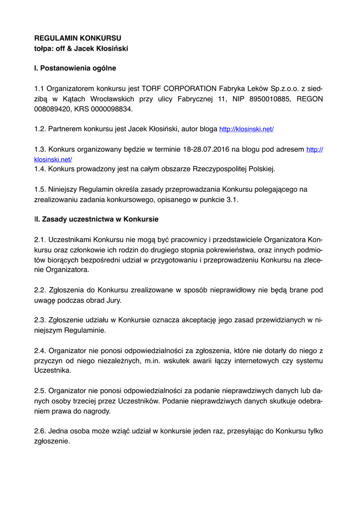 REGULAMIN KONKURSU tołpa: off & Jacek Kłosiński I. Postanowienia ogólne 1.1 Organizatorem konkursu jest TORF CORPORATION Fabryka Leków Sp.z.o.o. z siedzibą w Kątach Wrocławskich przy ulicy Fabrycznej 11, NIP 8950010885, REGON 008089420, KRS 0000098834. 1.2. Partnerem konkursu jest Jacek Kłosiński, autor bloga http://klosinski.net/ 1.3. Konkurs organizowany będzie w terminie 18-28.07.2016 na blogu pod adresem http:// klosinski.net/ 1.4. Konkurs prowadzony jest na całym obszarze Rzeczypospolitej Polskiej. 1.5. Niniejszy Regulamin określa zasady przeprowadzania Konkursu polegającego na zrealizowaniu zadania konkursowego, opisanego w punkcie 3.1. II. Zasady uczestnictwa w Konkursie 2.1. Uczestnikami Konkursu nie mogą być pracownicy i przedstawiciele Organizatora Konkursu oraz członkowie ich rodzin do drugiego stopnia pokrewieństwa, oraz innych podmiotów biorących bezpośredni udział w przygotowaniu i przeprowadzeniu Konkursu na zlecenie Organizatora. 2.2. Zgłoszenia do Konkursu zrealizowane w sposób nieprawidłowy nie będą brane pod uwagę podczas obrad Jury. 2.3. Zgłoszenie udziału w Konkursie oznacza akceptację jego zasad przewidzianych w niniejszym Regulaminie. 2.4. Organizator nie ponosi odpowiedzialności za zgłoszenia, które nie dotarły do niego z przyczyn od niego niezależnych, m.in. wskutek awarii łączy internetowych czy systemu Uczestnika. 2.5. Organizator nie ponosi odpowiedzialności za podanie nieprawdziwych danych lub danych osoby trzeciej przez Uczestników. Podanie nieprawdziwych danych skutkuje odebraniem prawa do nagrody. 2.6. Jedna osoba może wziąć udział w konkursie jeden raz, przesyłając do Konkursu tylko zgłoszenie. 2.7. Użytkownik, zgłaszając swoją pracę do konkursu jednocześnie oświadcza, iż posiada prawa autorskie do opublikowanego Utworu. III. Przebieg konkursu 3.1. Zadanie Konkursowe polega na zrealizowaniu następującego zadania: „Przedstaw swój ulubiony sposób na relaks, odpoczynek i regenerację”. Odpowiedzi należy zostawić na blogu http://klosinski.net/ pod wpisem konkursowym, podpisując się imieniem i nazwiskiem. Spośród wszystkich zgłoszeń uczestników Konkursu, którzy spełnią warunki Regulaminu, autor bloga http://klosinski.net/ wybierze 30 laureatów. 3.2. Nagrody 30 x zestaw dermokosmetyków tołpa o wartości ok. 120 zł brutto każdy IV Wyniki konkursu 4.1. Informacja o wynikach Konkursu zostanie ogłoszona w zaktualizowanym wpisie na blogu http://klosinski.net/ do pięciu dni roboczych od daty zakończenia konkursu. 4.2. Zwycięzcy Konkursu aby otrzymać nagrodę, w ciągu 5 dni roboczych zobowiązani będą przesłać swoje dane adresowe Partnerowi Konkursu. 4.3. Zwycięzcy Konkursu wyrażają zgodę na opublikowanie własnego imienia i nazwiska oraz zgłoszenia konkursowego na blogu http://klosinski.net/ oraz na profilu https://www.facebook.com/tolpamniejwiecej/ 4.4. Organizator nie ponosi odpowiedzialności za niemożność ani utrudnienia odbioru nagrody z przyczyn leżących po stronie Uczestnika nagrodzonego w Konkursie. 4.5. Nagrody nieodebrane przepadają. 4.6. Nagrody zostaną doręczone laureatom najpóźniej 30 dni od daty przekazania danych osobowych. V. Dane Osobowe 5.1. Przetwarzanie danych osobowych Uczestników Konkursów odbywa się zgodnie z ustawą o ochronie danych osobowych. 5.2. Administratorem danych osobowych udostępnianych przez Uczestników konkursu jest Organizator Konkursu. 5.3. Uczestnik konkursu wyraża zgodę na przetwarzanie jego danych osobowych przez Organizatora, w celu realizacji obowiązków wynikających z przeprowadzenia Konkursu. Uczestnik wyraża zgodę na przekazanie swoich danych osobowych firmie kurierskiej lub pocztowej, celem doręczenia nagrody. VI. Postanowienia końcowe 6.1. Niniejszy Regulamin dostępny jest na blogu http://klosinski.net/ 6.2. Niniejszy Regulamin stanowi jedyny dokument określający zasady Konkursu. Wszelkie materiały promocyjno-reklamowe mają wyłącznie charakter informacyjny. 6.3. Organizator zastrzega sobie możliwość dokonania zmiany niniejszego Regulaminu, jeśli nie wpłynie to na pogorszenie sytuacji Uczestników.