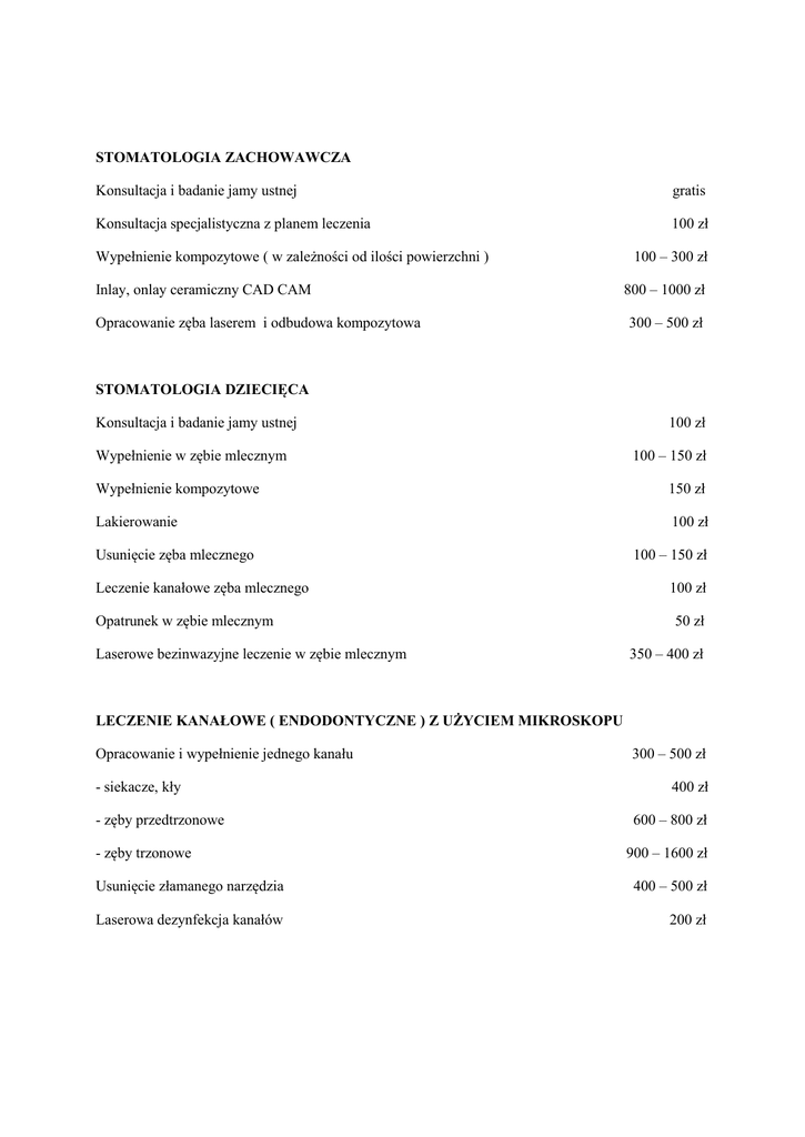 STOMATOLOGIA ZACHOWAWCZA Konsultacja i badanie jamy ustnej gratis Konsultacja specjalistyczna z planem leczenia 100 zł Wypełnienie kompozytowe ( w zależności od ilości powierzchni ) Inlay, onlay ceramiczny CAD CAM Opracowanie zęba laserem i odbudowa kompozytowa 100 – 300 zł 800 – 1000 zł 300 – 500 zł STOMATOLOGIA DZIECIĘCA Konsultacja i badanie jamy ustnej Wypełnienie w zębie mlecznym 100 zł 100 – 150 zł Wypełnienie kompozytowe 150 zł Lakierowanie 100 zł Usunięcie zęba mlecznego Leczenie kanałowe zęba mlecznego Opatrunek w zębie mlecznym Laserowe bezinwazyjne leczenie w zębie mlecznym 100 – 150 zł 100 zł 50 zł 350 – 400 zł LECZENIE KANAŁOWE ( ENDODONTYCZNE ) Z UŻYCIEM MIKROSKOPU Opracowanie i wypełnienie jednego kanału - siekacze, kły - zęby przedtrzonowe - zęby trzonowe 300 – 500 zł 400 zł 600 – 800 zł 900 – 1600 zł Usunięcie złamanego narzędzia 400 – 500 zł Laserowa dezynfekcja kanałów 200 zł CHIRURGIA Usunięcie zęba 200 zł Dłutowanie zęba 200 – 300 zł Dłutowanie zęba zatrzymanego 300 – 600 zł Ekstrakcja atraumatyczna 300 zł Resekcja siekacza, kła 500 zł Resekcja przedtrzonowca, trzonowca 600 zł Podcięcie laserowe wędzidełka wargi / języka 400 zł IMPLANTOLOGIA ( ceny uzależnione są od użytego systemu implantologicznego ) Implant Ankylos 3000 zł Implant Astra , Astra EV, Astra EV Profile 3200 zł Podniesienie zatoki ( sinus lift ) – cena z biomateriałem 2000 – 4000 zł Augmentacja kości – cena z biomateriałem 1000 – 2000 zł Przeszczep tkanki łącznej 1000 – 1600 zł Przeszczep bloku kostnego 3000 – 4000 zł Laserowa dystrakcja wyrostka 1000 zł Leczenie laserem Nd – Yag i Er Yag periipmlentitis: - metoda zamknięta 500 zł - metoda otwarta 1000 zł - metoda otwarta z augmentacją – odbudową wyrostka 1500 zł Biostymulacja po zabiegowa 1 sesja 60zł IMPLANTOPROTETYKA Korona porcelanowa ( na stopie Cr-Co ) + łącznik tytanowy 2700 zł Korona całoceramiczna + łącznik tytanowy 2900 zł Korona całoceramiczna CAD CAM + łącznik hybrydowy 3200 zł PROTETYKA 1000 zł Korona porcelanowa ( na stopie Cr-Co ) Korona całoceramiczna Cerec CAD CAM 1600 – 1800 zł Licówka porcelanowa 1600 – 1800 zł 400 zł Korona tymczasowa Thelio CAD CAM Proteza szkieletowa 2000 zł Proteza akrylowa Proteza na zatrzaskach, zasuwach, teleskopach 1500 – 2000 zł wycena indywidualna Wkład koronowo – korzeniowy 400 – 600 zł ORTODONCJA Konsultacja ortodontyczna 100 zł Konsultacja ortodontyczna z planem leczenia oraz wykonaniem modeli diagnostycznych 250 zł Aparat ruchomy 200 – 1200 zł Aparat stały ( metalowy ) – cena za jeden łuk Tradycyjny 2500 zł DAMON 3000 zł Aparat stały ( estetyczny ) – cena za jeden łuk Tradycyjny 3000 zł DAMON 3600 zł Wizyta kontrolna Aparat ruchomy Aparat stały ( jeden łuk ) Aparat stały ( dwa łuki ) 120 – 150 zł 80 zł 100 zł 150 zł PERIODONTOLOGIA Kiretaż zamknięty ( jeden łuk ) 200 zł Kiretaż otwarty ( bez ceny biomateriału ) 500 zł Regeneracja kieszonki dziąsłowej laserem Nd Yag i Er Yag 700 zł HIGIENIZACJA Usunięcie kamienia – scalling, piaskowanie, lakierowanie zębów Wybielanie lampą Beyond Wybielanie Fotona Lightwalker Laser 250 – 350 zł 800 zł 1000 zł TOMOGRAFIA KOMPUTEROWA 3D, DIAGNOSTYKA RTG Tomografia szczęki lub żuchwy 300 zł Tomografia szczęki i żuchwy 500 zł Zdjęcia pantomograficzne 100 zł *podane ceny są cenami orientacyjnymi i zależą od indywidualnych warunków, diagnozy i planu leczenia zaakceptowanego przez Pacjent.
