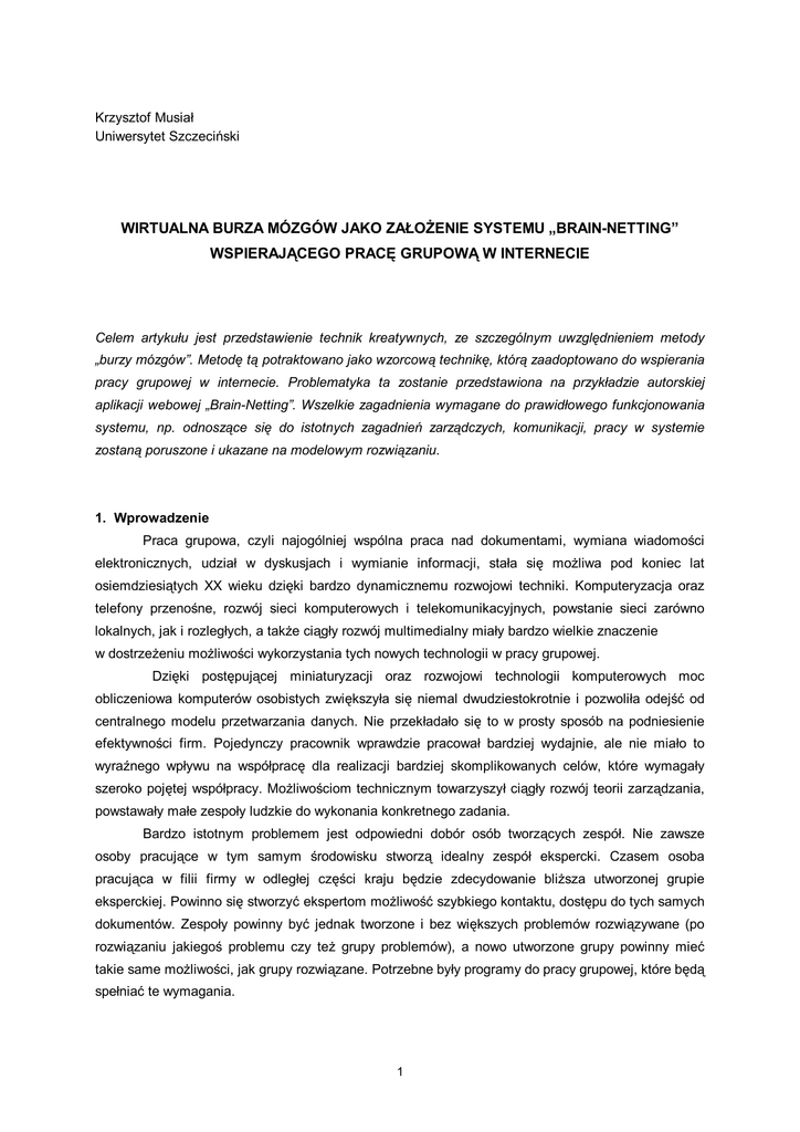 Krzysztof Musiał Uniwersytet Szczeciński WIRTUALNA BURZA MÓZGÓW JAKO ZAŁOŻENIE SYSTEMU „BRAIN-NETTING” WSPIERAJĄCEGO PRACĘ GRUPOWĄ W INTERNECIE Celem artykułu jest przedstawienie technik kreatywnych, ze szczególnym uwzględnieniem metody „burzy mózgów”. Metodę tą potraktowano jako wzorcową technikę, którą zaadoptowano do wspierania pracy grupowej w internecie. Problematyka ta zostanie przedstawiona na przykładzie autorskiej aplikacji webowej „Brain-Netting”. Wszelkie zagadnienia wymagane do prawidłowego funkcjonowania systemu, np. odnoszące się do istotnych zagadnień zarządczych, komunikacji, pracy w systemie zostaną poruszone i ukazane na modelowym rozwiązaniu. 1. Wprowadzenie Praca grupowa, czyli najogólniej wspólna praca nad dokumentami, wymiana wiadomości elektronicznych, udział w dyskusjach i wymianie informacji, stała się możliwa pod koniec lat osiemdziesiątych XX wieku dzięki bardzo dynamicznemu rozwojowi techniki. Komputeryzacja oraz telefony przenośne, rozwój sieci komputerowych i telekomunikacyjnych, powstanie sieci zarówno lokalnych, jak i rozległych, a także ciągły rozwój multimedialny miały bardzo wielkie znaczenie w dostrzeżeniu możliwości wykorzystania tych nowych technologii w pracy grupowej. Dzięki postępującej miniaturyzacji oraz rozwojowi technologii komputerowych moc obliczeniowa komputerów osobistych zwiększyła się niemal dwudziestokrotnie i pozwoliła odejść od centralnego modelu przetwarzania danych. Nie przekładało się to w prosty sposób na podniesienie efektywności firm. Pojedynczy pracownik wprawdzie pracował bardziej wydajnie, ale nie miało to wyraźnego wpływu na współpracę dla realizacji bardziej skomplikowanych celów, które wymagały szeroko pojętej współpracy. Możliwościom technicznym towarzyszył ciągły rozwój teorii zarządzania, powstawały małe zespoły ludzkie do wykonania konkretnego zadania. Bardzo istotnym problemem jest odpowiedni dobór osób tworzących zespół. Nie zawsze osoby pracujące w tym samym środowisku stworzą idealny zespół ekspercki. Czasem osoba pracująca w filii firmy w odległej części kraju będzie zdecydowanie bliższa utworzonej grupie eksperckiej. Powinno się stworzyć ekspertom możliwość szybkiego kontaktu, dostępu do tych samych dokumentów. Zespoły powinny być jednak tworzone i bez większych problemów rozwiązywane (po rozwiązaniu jakiegoś problemu czy też grupy problemów), a nowo utworzone grupy powinny mieć takie same możliwości, jak grupy rozwiązane. Potrzebne były programy do pracy grupowej, które będą spełniać te wymagania. 1 2. Aplikacje internetowe pracy grupowej Rozwój technologii webowej w intranecie oraz internecie zmieniły tradycyjne spojrzenie na systemy pracy grupowej. Nie musiały być to już potężne systemy zbudowane dla potrzeb firmy, można było wykorzystać tańsze i, co ważne, równie efektywne narzędzia. Dzięki wykorzystaniu technologii klient-serwer możliwe było stworzenie aplikacji, która będzie dawać wielkie możliwości użytkowania, przy stosunkowo niewielkich kosztach. Dane w takim systemie znajdują się na głównym komputerze-serwerze i mogą być pobierane i wyświetlane poprzez przeglądarkę komputera-klienta. Odpowiednie oprogramowanie odpowiedzialne za właściwe pobieranie i wyświetlanie danych znajduje się na komputerze klienta. Wszelkie komponenty, które powinny znajdować się w systemach tego typu, znajdują się w takich systemach: od modułów administracyjnych i komunikacyjnych, przez moduły zarządzające materiałami CMS1, do modułów pozwalających na ocenę rozwiązań. W takich właśnie systemach integralną częścią jest przeglądarka internetowa, która to stanowi interfejs dla użytkownika. Dzięki zastosowaniu niezależnych od platform koncepcji oraz języków programowania takie rozwiązania mogą być wykorzystywane na różnym sprzęcie i systemach operacyjnych. Najważniejsze cechy, które powinny być spełnione przez systemy dedykowane dla pracy grupowej to2: • autentyfikacja, dzięki czemu tylko uprawnieni użytkownicy będą mieli możliwość pracy oraz komunikacji między sobą; • mechanizmy zabezpieczające dokumenty, czyli mechanizmy wyłączające prawa zapisu dla plików znajdujących się aktualnie w przetwarzaniu przez innych użytkowników; • fora dyskusyjne, które umożliwiają prowadzenie rozmów w sposób zorganizowany dzięki grupom tematycznym, tzw. wątkom; • adnotacje i opinie: dokumenty mogą być opisywane i oceniane przez innych użytkowników; • informowanie o zdarzeniach, dzięki którym eksperci na bieżąco otrzymują informacje o wydarzeniach w pracy. Mogą być to zarówno krótkie wiadomości przesyłane emailem, jak i raporty o postępach nad projektem; • różne poziomy dostępu dla użytkowników, na przykład uprawnienia tylko dla odczytu lub udostępnienie dokumentu dla użytkownika anonimowego; • wyszukiwarka, która umożliwi wyszukiwanie dat modyfikacji oraz autorów wiadomości, a także korzystanie z zasobów internetowych; • funkcje archiwizujące; • rozsyłanie dokumentów poprzez e-mail. Współpracownicy grupy roboczej lub też zespołu projektowego mają możliwość połączenia się z dowolnego miejsca i z dowolnego komputera poprzez ogólnodostępne łącza internetowe za pomocą dowolnej przeglądarki internetowej do systemu i pozyskanie wszelkich informacji, które są potrzebne do rozwiązania postawionego przed grupą zadania. Bardzo istotne w systemach tego typu jest to, że użytkownicy mają możliwość komunikowania się z innymi użytkownikami. Komunikowanie się w internecie charakteryzują dwa sposoby czasowego 1 2 Content Management System – system zarządzania zawartością. M. Brodersen, eTeamwork – Webbasierte Gruppenarbeit, „Splitter“ 2002, nr 4, s. 16. 2 przekazywania informacji3: • synchronicznie, • asynchronicznie. Komunikacja synch