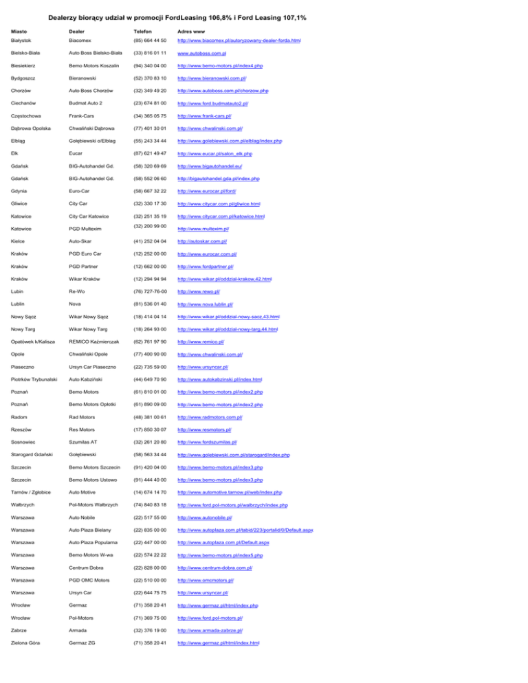 Dealerzy biorący udział w promocji FordLeasing 106,8% i Ford Leasing 107,1% Miasto Dealer Telefon Adres www Białystok Biacomex (85) 664 44 50 http://www.biacomex.pl/autoryzowany-dealer-forda.html Bielsko-Biała Auto Boss Bielsko-Biała (33) 816 01 11 www.autoboss.com.pl Biesiekierz Bemo Motors Koszalin (94) 340 04 00 http://www.bemo-motors.pl/index4.php Bydgoszcz Bieranowski (52) 370 83 10 http://www.bieranowski.com.pl/ Chorzów Auto Boss Chorzów (32) 349 49 20 http://www.autoboss.com.pl/chorzow.php Ciechanów Budmat Auto 2 (23) 674 81 00 http://www.ford.budmatauto2.pl/ Częstochowa Frank-Cars (34) 365 05 75 http://www.frank-cars.pl/ Dąbrowa Opolska Chwaliński Dąbrowa (77) 401 30 01 http://www.chwalinski.com.pl/ Elbląg Gołębiewski o/Elblag (55) 243 34 44 http://www.golebiewski.com.pl/elblag/index.php Ełk Eucar (87) 621 49 47 http://www.eucar.pl/salon_elk.php Gdańsk BIG-Autohandel Gd. (58) 320 69 69 http://www.bigautohandel.eu/ Gdańsk BIG-Autohandel Gd. (58) 552 06 60 http://bigautohandel.gda.pl/index.php Gdynia Euro-Car (58) 667 32 22 http://www.eurocar.pl/ford/ Gliwice City Car (32) 330 17 30 http://www.citycar.com.pl/gliwice.html Katowice City Car Katowice (32) 251 35 19 http://www.citycar.com.pl/katowice.html (32) 200 99 00 Katowice PGD Multexim Kielce Auto-Skar (41) 252 04 04 http://autoskar.com.pl/ Kraków PGD Euro Car (12) 252 00 00 http://www.eurocar.com.pl/ Kraków PGD Partner (12) 662 00 00 http://www.fordpartner.pl/ Kraków Wikar Kraków (12) 294 94 94 http://www.wikar.pl/oddzial-krakow,42.html Lubin Re-Wo (76) 727-76-00 http://www.rewo.pl/ Lublin Nova (81) 536 01 40 http://www.nova.lublin.pl/ Nowy Sącz Wikar Nowy Sącz (18) 414 04 14 http://www.wikar.pl/oddzial-nowy-sacz,43.html http://www.multexim.pl/ Nowy Targ Wikar Nowy Targ (18) 264 93 00 http://www.wikar.pl/oddzial-nowy-targ,44.html Opatówek k/Kalisza REMICO Kaźmierczak (62) 761 97 90 http://www.remico.pl/ Opole Chwaliński Opole (77) 400 90 00 http://www.chwalinski.com.pl/ Piaseczno Ursyn Car Piaseczno (22) 735 59 00 http://www.ursyncar.pl/ Piotrków Trybunalski Auto Kabziński (44) 649 70 90 http://www.autokabzinski.pl/index.html Poznań Bemo Motors (61) 810 01 00 http://www.bemo-motors.pl/index2.php Poznań Bemo Motors Opłotki (61) 890 09 00 http://www.bemo-motors.pl/index2.php Radom Rad Motors (48) 381 00 61 http://www.radmotors.com.pl/ Rzeszów Res Motors (17) 850 30 07 http://www.resmotors.pl/ Sosnowiec Szumilas AT (32) 261 20 80 http://www.fordszumilas.pl/ Starogard Gdański Gołębiewski (58) 563 34 44 http://www.golebiewski.com.pl/starogard/index.php Szczecin Bemo Motors Szczecin (91) 420 04 00 http://www.bemo-motors.pl/index3.php Szczecin Bemo Motors Ustowo (91) 444 40 00 http://www.bemo-motors.pl/index3.php Tarnów / Zgłobice Auto Motive (14) 674 14 70 http://www.automotive.tarnow.pl/web/index.php Wałbrzych Pol-Motors Wałbrzych (74) 840 83 18 http://www.ford.pol-motors.pl/walbrzych/index.php Warszawa Auto Nobile (22) 517 55 00 http://www.autonobile.pl/ Warszawa Auto Plaza Bielany (22) 835 00 00 http://www.autoplaza.com.pl/tabid/223/portalid/0/Default.aspx Warszawa Auto Plaza Popularna (22) 447 00 00 http://www.autoplaza.com.pl/Default.aspx Warszawa Bemo Motors W-wa (22) 574 22 22 http://www.bemo-motors.pl/index5.php Warszawa Centrum Dobra (22) 828 00 00 http://www.centrum-dobra.com.pl/ Warszawa PGD OMC Motors (22) 510 00 00 http://www.omcmotors.pl/ Warszawa Ursyn Car (22) 644 75 75 http://www.ursyncar.pl/ Wrocław Germaz (71) 358 20 41 http://www.germaz.pl/html/index.php Wrocław Pol-Motors (71) 369 75 00 http://www.ford.pol-motors.pl/ Zabrze Armada (32) 376 19 00 http://www.armada-zabrze.pl/ Zielona Góra Germaz ZG (71) 358 20 41 http://www.germaz.pl/html/index.html