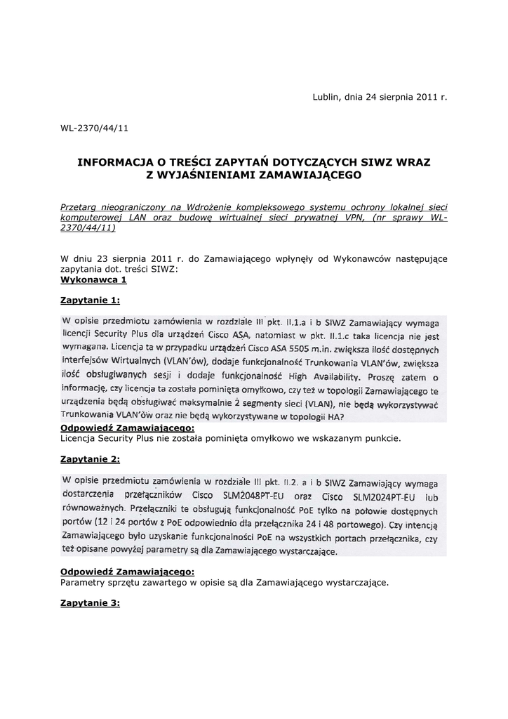 Lublin, dnia 24 sierpnia 2011 r. WL-2370/44/11 INFORMACJA O TREŚCI ZAPYTAŃ DOTYCZĄCYCH SIWZ WRAZ Z WYJAŚNIENIAMI ZAMAWIAJĄCEGO Przetarg nieograniczony na Wdrożenie kompleksowego systemu ochrony lokalnej sieci komputerowej LAN oraz budowę wirtualnej sieci prywatnej VPN, (nr sprawy WL2370/44/11) W dniu 23 sierpnia 2011 r. do Zamawiającego wpłynęły od Wykonawców następujące zapytania dot. treści SIWZ: Wykonawca 1 Zapytanie 1: Odpowiedź Zamawiającego: Licencja Security Plus nie została pominięta omyłkowo we wskazanym punkcie. Zapytanie 2: Odpowiedź Zamawiającego: Parametry sprzętu zawartego w opisie są dla Zamawiającego wystarczające. Zapytanie 3: Odpowiedź Zamawiającego: Zamawiający nie posiada takiego oprogramowania i dlatego wymaga dostarczenia Systemu Centralnego Zarządzania wraz z serwerem - wskazany symbol producenta Cisco ma jednoznacznie wskazywać na cechy jakimi ma się charakteryzować System - symbol CSMPR50-4.0-K9 jest równoważny i prawdopodobnie bardziej trafny jeśli chodzi o specyfikację w celach handlowych. Zapytanie 4: Odpowiedź Zamawiającego: Zdanie "Serwis sieci i urządzeń sieciowych SLA" zawiera oczywisty błąd drukarski i powinno brzmieć "Serwis sieci i urządzeń sieciowych, SLA" - SLA (Service Level Agreement). Zapytanie 5: Zgodnie z zapisem o 3 letniej gwarancji na urządzenia, nie traktując systemu zarządzania urządzeniami firewall ASA jako urządzenia Zamawiający nie wymaga 3 letniego wsparcia serwisowego dla tego konkretnie elementu dostawy. Wykonawca 2 Zapytanie 1: Odpowiedź Zamawiającego: Wymagane parametry sprzętu: A) ASA5510-SEC-BUN-K9 1. Urządzenie powinno pełnić rolę ściany ogniowej śledzącej stan połączeń z funkcją weryfikacji informacji charakterystycznych dla warstwy aplikacji. 2. Urządzenie nie powinno posiadać ograniczenia na ilość jednocześnie pracujących użytkowników w sieci chronionej. 3. Powinno być oparte o dedykowany system operacyjny – nie dopuszcza się rozwiązań gdzie platformą systemową jest otwarty system operacyjny np. UNIX (Linux, FreeBSD etc.) lub jego modyfikacja. 4. Urządzenie musi posiadać co najmniej pięć portów 10/100 FastEthernet. 5. Powinno posiadać dedykowane dwa porty dla podłączenia konsoli oraz dla uzyskania zdalnego dostępu przez modem asynchroniczny. 6. Powinno posiadać co najmniej jeden port USB dla przyszłych zastosowań (tokeny, etc.). 7. Powinno posiadać co najmniej 256MB DRAM oraz 64MB Flash. 8. Urządzenie powinno posiadać dodatkowy slot pozwalający na wykorzystanie modułów funkcjonalnych zwiększających standardowe możliwości urządzenia, w szczególności: a. moduł umożliwiający osiągniecie pełnej funkcjonalności systemu IPS (Intrusion Prevention System), b. moduł umożliwiający osiągniecie funkcjonalności ochrony antywirusowej, antyspyware’owej, antyspamowej, filtrowania i blokowania odwołań do niepożądanych adresów URL oraz filtrowania zawartości poczty elektronicznej email, c. uzyskanie co najmniej czterech dodatkowych portów 10/100/1000 GigabitEthernet. 9. Urządzenie musi posiadać zintegrowane sprzętowe wsparcie dla szyfrowania. 10. Urządzenie powinno mieć możliwość operowania jako transparentna ściana ogniowa warstwy drugiej ISO OSI. 11. Urządzenie powinno umożliwiać terminowanie co najmniej 250 jednoczesnych sesji VPN opartych o protokół IPSec. 12. Na urządzeniu powinna istnieć możliwość terminowania jednocześnie do 2 sesji WebVPN z możliwością rozszerzenia do 250 przy zastosowaniu odpowiedniej licencji na oprogramowanie. 13. Urządzenie powinno obsługiwać co najmniej 130000 jednoczesnych sesji/połączeń z prędkością co najmniej 8000 połączeń na sekundę. 14. Przepustowość obsługiwana przez urządzenie w trybie zapory ogniowej (firewall) nie powinna być mniejsza niż 300 Mbps i jednocześnie 160 Mbps dla ruchu szyfrowanego symetrycznymi algorytmami 3DES/AES. 15. Wraz z urządzeniem powinno być dostarczane oprogramowanie klienta VPN, umożliwiające instalację go i zestawienie do urządzenia połączeń VPN z komputerów osobistych PC pracujących pod kontrolą systemów operacyjnych Windows, Solaris i Linux, a także komputerów Mac. Oprogramowanie to powinno pochodzić od tego samego producenta, co oferowane urządzenie i powinno być objęte jego jednolitym wsparciem technicznym. 16. Urządzenie powinno umożliwiać obsługę co najmniej 100 interfejsów VLAN w standardzie 802.1Q. 17. Urządzenie powinno w celu redundancji umożliwiać implementację funkcji niezawodności pary takich urządzeń, czyli tzw. failoveru działającego w trybie active/standby lub active/active. 18. Urządzenie powinno umożliwiać obsługę minimum 2 wirtualnych instancji firewall i umożliwiać rozbudowę do co najmniej 5 wirtualnych instancji firewall. 19. Powinno dokonywać inspekcji ruchu głosowego w zakresie protokołów H.323, SIP, SCCP, MGCP, TAPI, JTAPI. 20. Urządzenie powinno mieć możliwość blokowania aplikacji typu „internetowy komunikator” wykorzystujących port 80 (np.: Skype, MSN). 21. Urządzenie powinno mieć możliwość blokowania aplikacji typu peer-to-peer (np: Kaaza, eDonkoey). 22. Urządzenie powinno mieć możliwość inspekcji protokołów HTTP oraz FTP na nie standartowych portach. 23. Urządzenie powinno zapewniać wsparcie dla list kontroli dostępu dla IPv6. 24. Urządzenie powinno być zarządzalne przy wykorzystaniu dedykowanej aplikacji umożliwiającej płynną (z użyciem kreatorów) konfigurację poszczególnych funkcji urządzenia. 25. Urządzenie powinno być przystosowane do montażu w 19-calowej szafie rackowej i nie zajmować więcej miejsca niż 1RU (rack unit). B) ASA5505-SEC-BUN-K9 – wymagane parametry sprzętu: 1. Urządzenie powinno pełnić rolę ściany ogniowej śledzącej stan połączeń z funkcją weryfikacji informacji charakterystycznych dla warstwy aplikacji. 2. Urządzenie nie powinno posiadać ograniczenia na ilość jed