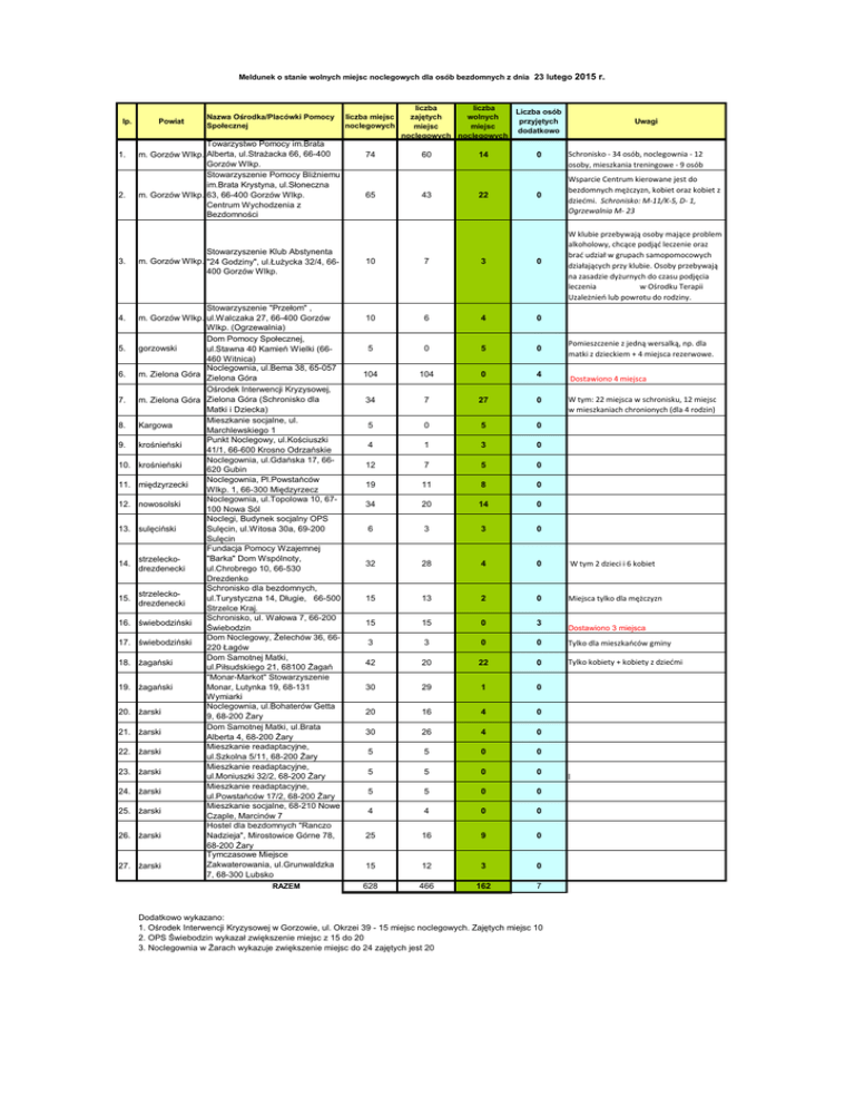 Meldunek o stanie wolnych miejsc noclegowych dla osób bezdomnych z dnia 23 lutego 2015 r. lp. 1. 2. 3. 4. 5. 6. 7. 8. 9. 10. 11. 12. 13. 14. 15. 16. 17. 18. 19. 20. 21. 22. 23. 24. 25. 26. 27. Powiat Nazwa Ośrodka/Placówki Pomocy Społecznej Towarzystwo Pomocy im.Brata m. Gorzów Wlkp. Alberta, ul.Strażacka 66, 66-400 Gorzów Wlkp. Stowarzyszenie Pomocy Bliźniemu im.Brata Krystyna, ul.Słoneczna m. Gorzów Wlkp. 63, 66-400 Gorzów Wlkp. Centrum Wychodzenia z Bezdomności Stowarzyszenie Klub Abstynenta m. Gorzów Wlkp. "24 Godziny", ul.Łużycka 32/4, 66400 Gorzów Wlkp. Stowarzyszenie "Przełom" , m. Gorzów Wlkp. ul.Walczaka 27, 66-400 Gorzów Wlkp. (Ogrzewalnia) Dom Pomocy Społecznej, gorzowski ul.Stawna 40 Kamień Wielki (66460 Witnica) Noclegownia, ul.Bema 38, 65-057 m. Zielona Góra Zielona Góra Ośrodek Interwencji Kryzysowej, m. Zielona Góra Zielona Góra (Schronisko dla Matki i Dziecka) Mieszkanie socjalne, ul. Kargowa Marchlewskiego 1 Punkt Noclegowy, ul.Kościuszki krośnieński 41/1, 66-600 Krosno Odrzańskie Noclegownia, ul.Gdańska 17, 66krośnieński 620 Gubin Noclegownia, Pl.Powstańców międzyrzecki Wlkp. 1, 66-300 Międzyrzecz Noclegownia, ul.Topolowa 10, 67nowosolski 100 Nowa Sól Noclegi, Budynek socjalny OPS sulęciński Sulęcin, ul.Witosa 30a, 69-200 Sulęcin Fundacja Pomocy Wzajemnej "Barka" Dom Wspólnoty, strzeleckoul.Chrobrego 10, 66-530 drezdenecki Drezdenko Schronisko dla bezdomnych, strzeleckoul.Turystyczna 14, Długie, 66-500 drezdenecki Strzelce Kraj. Schronisko, ul. Wałowa 7, 66-200 świebodziński Świebodzin Dom Noclegowy, Żelechów 36, 66świebodziński 220 Łagów Dom Samotnej Matki, żagański ul.Piłsudskiego 21, 68100 Żagań "Monar-Markot" Stowarzyszenie żagański Monar, Lutynka 19, 68-131 Wymiarki Noclegownia, ul.Bohaterów Getta żarski 9, 68-200 Żary Dom Samotnej Matki, ul.Brata żarski Alberta 4, 68-200 Żary Mieszkanie readaptacyjne, żarski ul.Szkolna 5/11, 68-200 Żary Mieszkanie readaptacyjne, żarski ul.Moniuszki 32/2, 68-200 Żary Mieszkanie readaptacyjne, żarski ul.Powstańców 17/2, 68-200 Żary Mieszkanie socjalne, 68-210 Nowe żarski Czaple, Marcinów 7 Hostel dla bezdomnych "Ranczo żarski Nadzieja", Mirostowice Górne 78, 68-200 Żary Tymczasowe Miejsce Zakwaterowania, ul.Grunwaldzka żarski 7, 68-300 Lubsko RAZEM Iiczba miejsc noclegowych Iiczba liczba zajętych wolnych miejsc miejsc noclegowych noclegowych Liczba osób przyjętych dodatkowo 74 60 14 0 65 43 22 0 10 7 3 0 10 6 4 0 5 0 5 0 104 104 0 4 34 7 27 0 5 0 5 0 Uwagi Schronisko - 34 osób, noclegownia - 12 osoby, mieszkania treningowe - 9 osób Wsparcie Centrum kierowane jest do bezdomnych mężczyzn, kobiet oraz kobiet z dziedmi. Schronisko: M-11/K-5, D- 1, Ogrzewalnia M- 23 W klubie przebywają osoby mające problem alkoholowy, chcące podjąd leczenie oraz brad udział w grupach samopomocowych działających przy klubie. Osoby przebywają na zasadzie dyżurnych do czasu podjęcia leczenia w Ośrodku Terapii Uzależnieo lub powrotu do rodziny. Pomieszczenie z jedną wersalką, np. dla matki z dzieckiem + 4 miejsca rezerwowe. Dostawiono 4 miejsca W tym: 22 miejsca w schronisku, 12 miejsc w mieszkaniach chronionych (dla 4 rodzin) 4 1 3 0 12 7 5 0 19 11 8 0 34 20 14 0 6 3 3 0 32 28 4 0 W tym 2 dzieci i 6 kobiet 15 13 2 0 Miejsca tylko dla mężczyzn 15 15 0 3 3 3 0 0 Tylko dla mieszkaoców gminy 42 20 22 0 Tylko kobiety + kobiety z dziedmi 30 29 1 0 20 16 4 0 30 26 4 0 5 5 0 0 5 5 0 0 5 5 0 0 4 4 0 0 25 16 9 0 15 12 3 0 628 466 162 7 Dodatkowo wykazano: 1. Ośrodek Interwencji Kryzysowej w Gorzowie, ul. Okrzei 39 - 15 miejsc noclegowych. Zajętych miejsc 10 2. OPS Świebodzin wykazał zwiększenie miejsc z 15 do 20 3. Noclegownia w Żarach wykazuje zwiększenie miejsc do 24 zajętych jest 20 Dostawiono 3 miejsca l