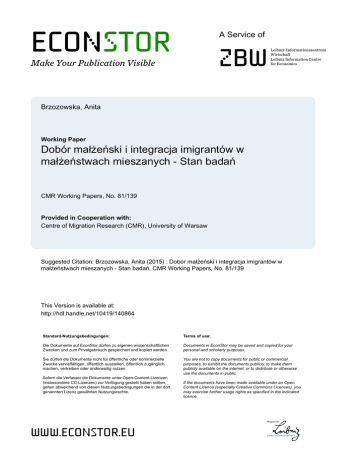 econstor A Service of zbw Make Your Publication Visible Leibniz-Informationszentrum Wirtschaft Leibniz Information Centre for Economics Brzozowska, Anita Working Paper Dobór małżeński i integracja imigrantów w małżeństwach mieszanych - Stan badań CMR Working Papers, No. 81/139 Provided in Cooperation with: Centre of Migration Research (CMR), University of Warsaw Suggested Citation: Brzozowska, Anita (2015) : Dobór małżeński i integracja imigrantów w małżeństwach mieszanych - Stan badań, CMR Working Papers, No. 81/139 This Version is available at: http://hdl.handle.net/10419/140864 Standard-Nutzungsbedingungen: Terms of use: Die Dokumente auf EconStor dürfen zu eigenen wissenschaftlichen Zwecken und zum Privatgebrauch gespeichert und kopiert werden. Documents in EconStor may be saved and copied for your personal and scholarly purposes. Sie dürfen die Dokumente nicht für öffentliche oder kommerzielle Zwecke vervielfältigen, öffentlich ausstellen, öffentlich zugänglich machen, vertreiben oder anderweitig nutzen. You are not to copy documents for public or commercial purposes, to exhibit the documents publicly, to make them publicly available on the internet, or to distribute or otherwise use the documents in public. Sofern die Verfasser die Dokumente unter Open-Content-Lizenzen (insbesondere CC-Lizenzen) zur Verfügung gestellt haben sollten, gelten abweichend von diesen Nutzungsbedingungen die in der dort genannten Lizenz gewährten Nutzungsrechte. www.econstor.eu If the documents have been made available under an Open Content Licence (especially Creative Commons Licences), you may exercise further usage rights as specified in the indicated licence. 81/139 ANITA BRZOZOWSKA Dobór małżeński i integracja imigrantów w małżeństwach mieszanych – stan badań Maj12015 www.migracje.uw.edu.pl Anita Brzozowska – Ośrodek Badań nad Migracjami, Uniwersytet Warszawski [email protected] 2 Streszczenie Celem publikacji jest prezentacja istniejącego stanu wiedzy o małżeństwach mieszanych wyróżnionych ze względu na kryterium narodowości i pochodzenia etnicznego współmałżonków w kontekście doboru małżeńskiego i integracji imigrantów w krajach przyjmujących. Praca zawiera omówienie sposobów definiowania małżeństwa oraz typów małżeństw mieszanych. Przedstawia również w świetle wybranych koncepcji teoretycznych dobór małżeński oraz społeczny wymiar integracji imigrantów, którzy zawarli małżeństwa mieszane. W kolejnej części tekstu zaprezentowane zostały najważniejsze badania nad małżeństwami mieszanymi przeprowadzone przede wszystkim na gruncie studiów migracyjnych. Publikację kończą wnioski podsumowujące najważniejsze osiągnięcia z zakresu omawianej problematyki oraz próba wskazania potencjału tego kierunku badań w polskich studiach migracyjnych. Słowa kluczowe: małżeństwa mieszane, integracja, migracje, dobór małżeński 3 Abstract The aim of this study is to present the state of the art of research on mixed marriages in terms of ethnicity and nationality. The study covers the works on mate selection and immigrants integration. It begins with an overview of existing definitions of marriage and types of mixed marriage as well. These introductory reflections are followed by the presentation of marital matching process and social integration of immigrants from different theoretical perspectives. Then, the analysis of studies of intermarriage come in first place focusing primarily on migration studies. The study ends with the conclusions that summarize the most important scientific achievements of researchers in the field of intermarriage research. It encompasses also separate section on the potential of the intermarriage research in Poland. Keywords: mixed marriages, integration, migration, mate selection 4 Spis treści 1. Wprowadzenie ........................................................................................................................ 6 2. Podstawowe zagadnienia definicyjne..................................................................................... 8 3. Dobór małżeński w małżeństwach mieszanych i integracja imigrantów w świetle wybranych koncepcji teoretycznych ........................................................................................ 11 3.1. Dobór małżeński w świetle wybranych koncepcji teoretycznych................................. 11 3.2. Integracja migrantów a małżeństwa mieszane w świetle wybranych koncepcji teoretycznych ....................................................................................................................... 16 4. Przegląd stanu badań nad doborem małżeńskim i integracją imigrantów zawierających małżeństwa mieszane ............................................................................................................... 18 4.1. Badania nad doborem małżeńskim ............................................................................... 18 4.2. Badania nad integracją imigrantów zawierających małżeństwa mieszane ................... 21 4.3. Przegląd stanu badań nad małżeństwami mieszanymi w Polsce .................................. 23 5. Uwagi końcowe .................................................................................................................... 25 Bibliografia............................................................................................................................... 26 5 1. Wprowadzenie Ranga społeczna przypisywana małżeństwu oraz wielorakie konsekwencje, jakie pociąga za sobą zawarcie związku małżeńskiego, leżą u podstaw szerokiego nim zainteresowania różnych dyscyplin naukowych. Uwaga badaczy poświęcona tej problematyce wynika z wielopostaciowej istoty samego związku małżeńskiego, jak również ze społecznoekonomicznych, demograficznych i prawnych konsekwencji jego zawarcia. Co więcej, niewiele jest obecnie społeczeństw