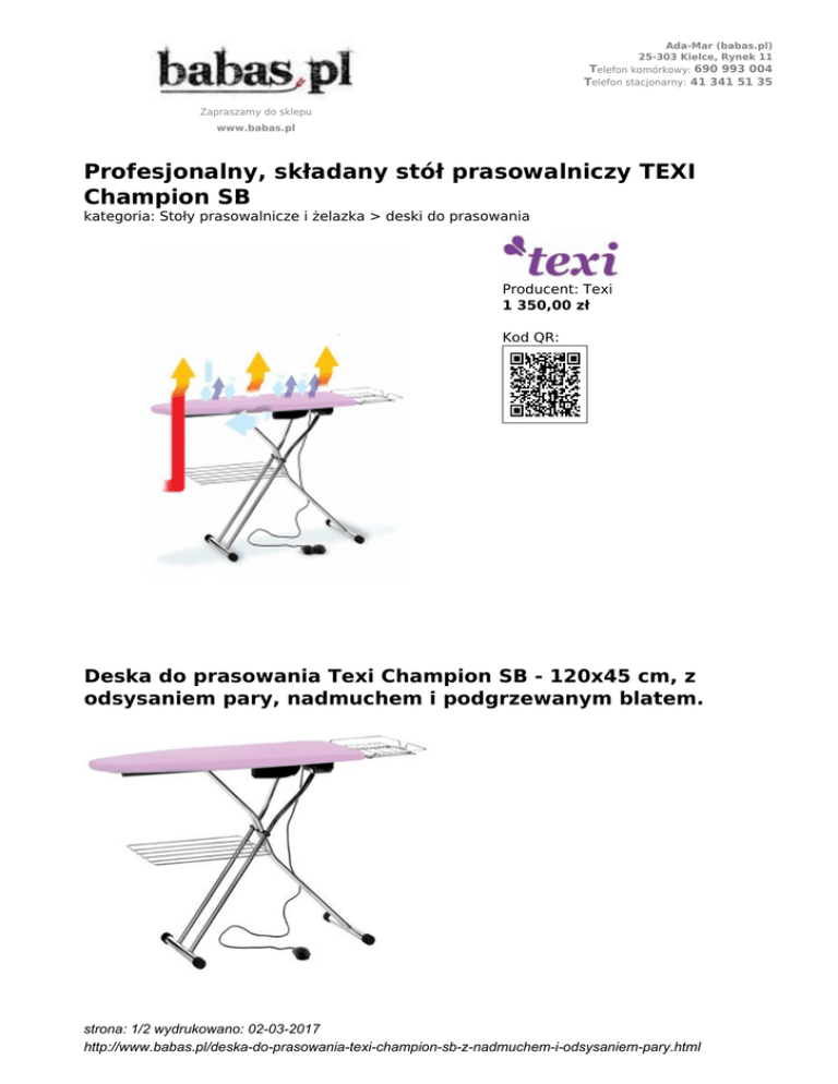 Ada-Mar (babas.pl) 25-303 Kielce, Rynek 11 Telefon komórkowy: 690 993 004 Telefon stacjonarny: 41 341 51 35 Zapraszamy do sklepu www.babas.pl Profesjonalny, składany stół prasowalniczy TEXI Champion SB kategoria: Stoły prasowalnicze i żelazka > deski do prasowania Producent: Texi 1 350,00 zł Kod QR: Deska do prasowania Texi Champion SB - 120x45 cm, z odsysaniem pary, nadmuchem i podgrzewanym blatem. strona: 1/2 wydrukowano: 02-03-2017 http://www.babas.pl/deska-do-prasowania-texi-champion-sb-z-nadmuchem-i-odsysaniem-pary.html Niezwykle solidny, składany, chromowany stół prasowalniczy typu deska o wymiarach 120x45 cm. Z podgrzewaną powierzchnią oraz oraz systemem odsysania pary. Interesującym systemem dodatkowym jest nadmuch umożliwiający prasowanie techniką prasowania balonowego. Ultra delikatne tkaniny prasujemy na balonie powietrznym bez dociskania tkaniny do powierzchni deski. W połączeniu z żelazkiem wyposażonym w generator pary daje możliwość osiągnięcia efektu suchego prasowania. Prasowanie tkanin staje się szybkie i perfekcyjne - bez wybłyszczeń. Polecana zarówno w domu jak i niewielkich pracowniach krawieckich oraz usługowych. Główne cechy: odsysanie pary: 40W nadmuch powietrza: 40W podgrzewana powierzchnia: 400W regulacja wysokości w zakresie: 85 - 102 cm statyw do odstawienia żelazka lub wytwornicy pary wraz z żelazkiem pod deską dodatkowa półka made in Italy Dane techniczne: napięcie: 230V wymiary stołu gotowego do pracy: 152x46x91 cm wymiary stołu po złożeniu: 165x46x13 cm waga: 18,5 kg strona: 2/2 wydrukowano: 02-03-2017 http://www.babas.pl/deska-do-prasowania-texi-champion-sb-z-nadmuchem-i-odsysaniem-pary.html
