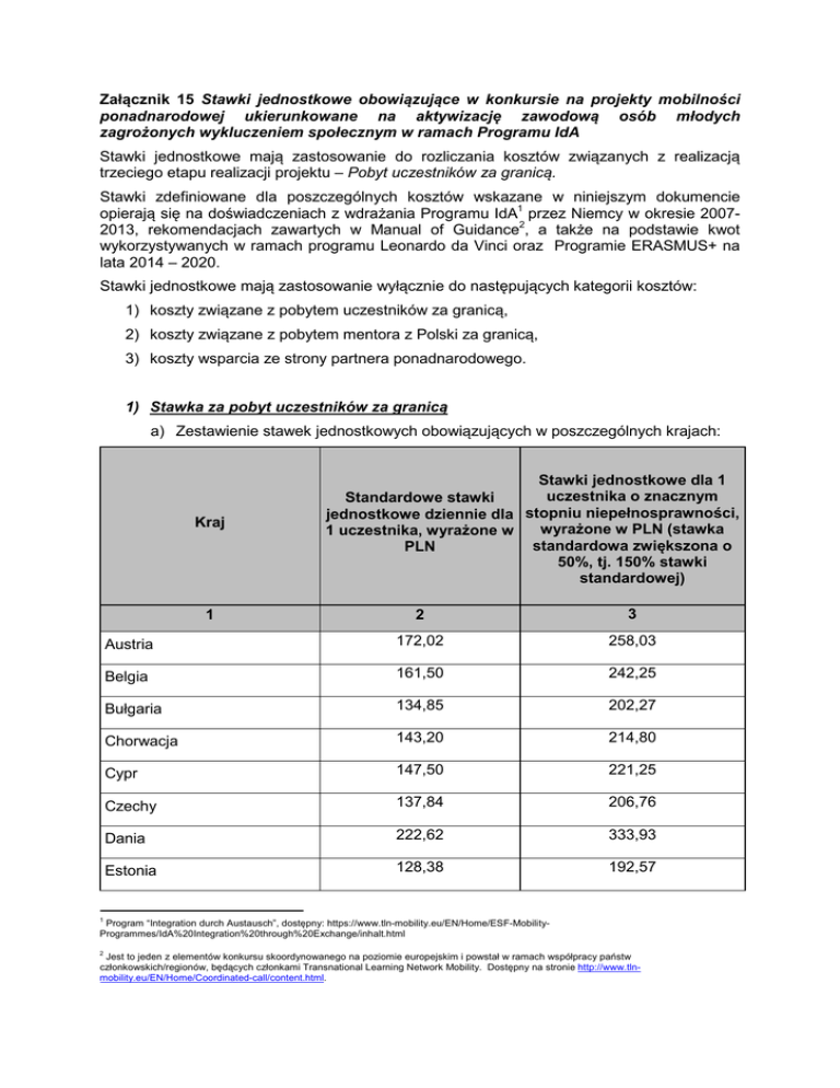 Załącznik 15 Stawki jednostkowe obowiązujące w konkursie na projekty mobilności ponadnarodowej ukierunkowane na aktywizację zawodową osób młodych zagrożonych wykluczeniem społecznym w ramach Programu IdA Stawki jednostkowe mają zastosowanie do rozliczania kosztów związanych z realizacją trzeciego etapu realizacji projektu – Pobyt uczestników za granicą. Stawki zdefiniowane dla poszczególnych kosztów wskazane w niniejszym dokumencie opierają się na doświadczeniach z wdrażania Programu IdA1 przez Niemcy w okresie 20072013, rekomendacjach zawartych w Manual of Guidance2, a także na podstawie kwot wykorzystywanych w ramach programu Leonardo da Vinci oraz Programie ERASMUS+ na lata 2014 – 2020. Stawki jednostkowe mają zastosowanie wyłącznie do następujących kategorii kosztów: 1) koszty związane z pobytem uczestników za granicą, 2) koszty związane z pobytem mentora z Polski za granicą, 3) koszty wsparcia ze strony partnera ponadnarodowego. 1) Stawka za pobyt uczestników za granicą a) Zestawienie stawek jednostkowych obowiązujących w poszczególnych krajach: Kraj Stawki jednostkowe dla 1 uczestnika o znacznym Standardowe stawki jednostkowe dziennie dla stopniu niepełnosprawności, wyrażone w PLN (stawka 1 uczestnika, wyrażone w standardowa zwiększona o PLN 50%, tj. 150% stawki standardowej) 2 3 Austria 172,02 258,03 Belgia 161,50 242,25 Bułgaria 134,85 202,27 Chorwacja 143,20 214,80 Cypr 147,50 221,25 Czechy 137,84 206,76 Dania 222,62 333,93 Estonia 128,38 192,57 1 1 Program “Integration durch Austausch”, dostępny: https://www.tln-mobility.eu/EN/Home/ESF-MobilityProgrammes/IdA%20Integration%20through%20Exchange/inhalt.html 2 Jest to jeden z elementów konkursu skoordynowanego na poziomie europejskim i powstał w ramach współpracy państw członkowskich/regionów, będących członkami Transnational Learning Network Mobility. Dostępny na stronie http://www.tlnmobility.eu/EN/Home/Coordinated-call/content.html. Finlandia 188,44 282,66 Francja 190,85 286,28 Grecja 150,73 226,10 Hiszpania 165,02 247,53 Holandia 177,92 266,87 Irlandia 197,03 295,55 Litwa 121,95 182,93 Luxemburg 161,50 242,25 Łotwa 123,84 185,76 Malta 146,44 219,65 Niemcy 161,50 242,25 Portugalia 148,32 222,48 Rumunia 135,67 203,50 Słowacja 142,38 213,57 Słowenia 140,25 210,38 Szwecja 185,45 278,17 Węgry 123,02 184,53 Wielka Brytania 225,04 337,55 Włochy 181,68 272,52 b) Pobyt uczestników za granicą trwa od 60 do 180 dni. Powyższe stawki jednostkowe obejmują jeden dzień pobytu jednego uczestnika za granicą w celu realizacji programu mobilności ponadnarodowej (minimalne wymagania w zakresie pobytu uczestników za granicą opisane są w regulaminie konkursu – część II, pkt 5) c) W ramach stawki jednostkowej pokrywane są następujące koszty: - wyżywienie: co najmniej trzy pełnowartościowe posiłki dziennie; - zakwaterowanie co najmniej zgodnie z poniższymi wymogami: o w obiekcie z pełnym zapleczem sanitarnym, o dostęp do własnego lub współdzielonego pomieszczenia np. łazienka, pokój dzienny/świetlica, kuchnia/aneks kuchenny (wyposażony: kuchenka elektryczna lub gazowa, lodówka, przybory kuchenne, sztućce, stół i krzesła), o w pokojach z dostępem do światła dziennego, o co najmniej podstawowe wyposażenie pokoi: łóżko, szafa, stół/biurko i umywalka, o w przypadku uczestników niepełnosprawnych obiekt bez barier architektonicznych, dostosowany do obowiązujących standardów, o umiejscowione w odległości umożliwiającej dotarcie do miejsca odbywania stażu/praktyk pieszo lub środkiem komunikacji miejskiej w czasie nie dłuższym niż 1 godzina w jedną stronę (według rozkładu jazdy). - transport lokalny za granicą: przede wszystkim wynikający z konieczności przemieszczania się pomiędzy miejscem zakwaterowania a miejscem/ami realizacji programu mobilności ponadnarodowej; - ubezpieczenie: wszelkie konieczne ubezpieczenia, w tym od odpowiedzialności cywilnej i od następstw nieszczęśliwych wypadków na czas pobytu za granicą; - wszystkie dodatkowe koszty związane z pobytem za granicą oraz realizacją IPD uczestnika (np. stypendium stażowe/„kieszonkowe dla uczestnika”, udział w wydarzeniach, udział w projektach na rzecz społeczności lokalnej, dodatkowe wyjazdy, bilety wstępu). d) W umowie zawieranej pomiędzy uczestnikiem a projektodawcą obowiązkowo wskazana jest wysokość stawki przypadającej na jeden dzień pobytu jednego uczestnika w danym kraju. Dodatkowo, w umowie obowiązkowo wskazany jest sposób wydatkowania danej kwoty, tzn. jakie koszty z wymienionych w pkt c) pokrywa w imieniu uczestnika projektodawca (zapewniając i opłacając np. zakwaterowanie lub wyżywienie), a jakie środki uczestnik otrzymuje i na co powinien je przeznaczyć. e) Koszty podróży uczestników za granicę i z powrotem nie są wliczone w powyższe stawki. Koszty te będą rozliczane na podstawie kosztów rzeczywiście poniesionych. Zalecana jest podróż publicznymi/zbiorowymi środkami transportu oraz zakup biletów podróży z możliwością zwrotu lub wymiany (np. w zakresie zmiany terminu podróży lub nazwiska osoby podróżującej) na wypadek nieoczekiwanych sytuacji. f) Dokumenty, jakie projektodawca zobowiązany jest przedstawić w celu potwierdzenia poniesienia wydatków z zastosowaniem ww. stawki to co najmniej: - umowy zawarte pomiędzy uczestnikami a projektodawcą, - listy obecności podpisywane codziennie przez uczestników w miejscu stażu i potwierdzone podpisem pracodawcy, - umowa o współpracy ponadnarodowej pomiędzy partnerami. g) Kwota wydatków kwalifikowalnych rozliczanych w oparciu o stawki jednostkowe, jest ustalana na podstawie przemnożenia ustalonej stawki jednostkowej przez liczbę aktywności faktycznie zrealizowanych w trakcie pobytu za granicą spełniających warunki określone w regulaminie konkursu. W sytuacji zakończenia mobilności wcześniej niż pierwotnie zakładano IOK każdorazowo anal