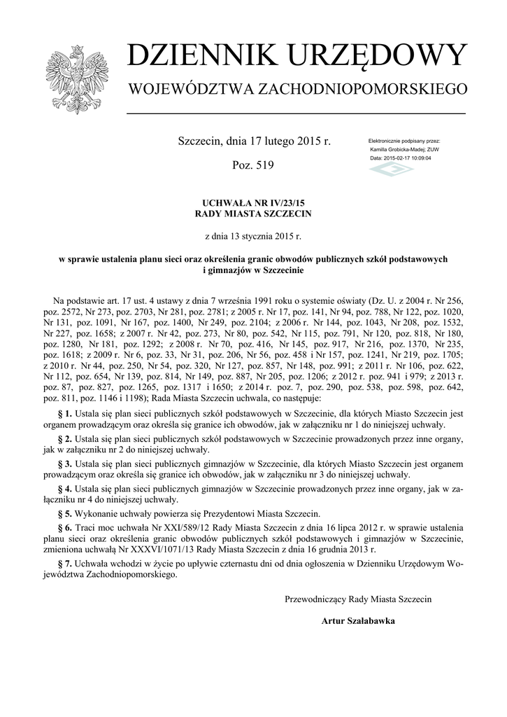 DZIENNIK URZĘDOWY WOJEWÓDZTWA ZACHODNIOPOMORSKIEGO Szczecin, dnia 17 lutego 2015 r. Elektronicznie podpisany przez: Kamilla Grobicka-Madej; ZUW Data: 2015-02-17 10:09:04 Poz. 519 UCHWAŁA NR IV/23/15 RADY MIASTA SZCZECIN z dnia 13 stycznia 2015 r. w sprawie ustalenia planu sieci oraz określenia granic obwodów publicznych szkół podstawowych i gimnazjów w Szczecinie Na podstawie art. 17 ust. 4 ustawy z dnia 7 września 1991 roku o systemie oświaty (Dz. U. z 2004 r. Nr 256, poz. 2572, Nr 273, poz. 2703, Nr 281, poz. 2781; z 2005 r. Nr 17, poz. 141, Nr 94, poz. 788, Nr 122, poz. 1020, Nr 131, poz. 1091, Nr 167, poz. 1400, Nr 249, poz. 2104; z 2006 r. Nr 144, poz. 1043, Nr 208, poz. 1532, Nr 227, poz. 1658; z 2007 r. Nr 42, poz. 273, Nr 80, poz. 542, Nr 115, poz. 791, Nr 120, poz. 818, Nr 180, poz. 1280, Nr 181, poz. 1292; z 2008 r. Nr 70, poz. 416, Nr 145, poz. 917, Nr 216, poz. 1370, Nr 235, poz. 1618; z 2009 r. Nr 6, poz. 33, Nr 31, poz. 206, Nr 56, poz. 458 i Nr 157, poz. 1241, Nr 219, poz. 1705; z 2010 r. Nr 44, poz. 250, Nr 54, poz. 320, Nr 127, poz. 857, Nr 148, poz. 991; z 2011 r. Nr 106, poz. 622, Nr 112, poz. 654, Nr 139, poz. 814, Nr 149, poz. 887, Nr 205, poz. 1206; z 2012 r. poz. 941 i 979; z 2013 r. poz. 87, poz. 827, poz. 1265, poz. 1317 i 1650; z 2014 r. poz. 7, poz. 290, poz. 538, poz. 598, poz. 642, poz. 811, poz. 1146 i 1198); Rada Miasta Szczecin uchwala, co następuje: § 1. Ustala się plan sieci publicznych szkół podstawowych w Szczecinie, dla których Miasto Szczecin jest organem prowadzącym oraz określa się granice ich obwodów, jak w załączniku nr 1 do niniejszej uchwały. § 2. Ustala się plan sieci publicznych szkół podstawowych w Szczecinie prowadzonych przez inne organy, jak w załączniku nr 2 do niniejszej uchwały. § 3. Ustala się plan sieci publicznych gimnazjów w Szczecinie, dla których Miasto Szczecin jest organem prowadzącym oraz określa się granice ich obwodów, jak w załączniku nr 3 do niniejszej uchwały. § 4. Ustala się plan sieci publicznych gimnazjów w Szczecinie prowadzonych przez inne organy, jak w załączniku nr 4 do niniejszej uchwały. § 5. Wykonanie uchwały powierza się Prezydentowi Miasta Szczecin. § 6. Traci moc uchwała Nr XXI/589/12 Rady Miasta Szczecin z dnia 16 lipca 2012 r. w sprawie ustalenia planu sieci oraz określenia granic obwodów publicznych szkół podstawowych i gimnazjów w Szczecinie, zmieniona uchwałą Nr XXXVI/1071/13 Rady Miasta Szczecin z dnia 16 grudnia 2013 r. § 7. Uchwała wchodzi w życie po upływie czternastu dni od dnia ogłoszenia w Dzienniku Urzędowym Województwa Zachodniopomorskiego. Przewodniczący Rady Miasta Szczecin Artur Szałabawka Dziennik Urzędowy Województwa Zachodniopomorskiego –2– Poz. 519 Załącznik Nr 1 do uchwały Nr IV/23/15 Rady Miasta Szczecin z dnia 13 stycznia 2015 r. Plan sieci publicznych szkół podstawowych w Szczecinie, dla których Miasto Szczecin jest organem prowadzącym oraz granice ich obwodów: 1) Szkoła Podstawowa Nr 1 im. Bolesława Chrobrego w Szczecinie, al. Piastów 6, obejmująca obwód szkolny - ulice: Aleja Piastów 1 - 16 oraz 57 - do końca Aleja Wojska Polskiego 26 oraz 28 - 63 Bolesława Krzywoustego 21 - 29 Bolesława Śmiałego 8 - 47 (oprócz 23 - 32) Chodkiewicza cała Jagiellońska 10 - 31 oraz 71 - 90 Księcia Bogusława X 1 - 9 Pocztowa 5 - 34 Ściegiennego 1 - 11 oraz 56 - do końca Żółkiewskiego cała 2) Szkoła Podstawowa Nr 3 im. Juliusza Słowackiego w Szczecinie, ul. Władysława Reymonta 23, obejmująca obwód szkolny - ulice: Abramowskiego cała Bałuckiego cała Brzozowskiego cała Cieszkowskiego cała Domańskiego cała Goszczyńskiego cała Grzegorza z Sanoka cała Hoene-Wrońskiego cała Jakuba Bojki cała Janickiego cała Karłowicza cała Karpowicza cała Korfantego cała Kozierowskiego cała Księcia Poniatowskiego 1 - 20 Libelta cała Lindego cała Łukasiewicza cała Mickiewicza 59 - 159 Paderewskiego cała Przybyszewskiego cała Dziennik Urzędowy Województwa Zachodniopomorskiego –3– Poz. 519 Reymonta cała Rostworowskiego cała Sienkiewicza cała Stojałowskiego cała Traugutta cała Trentowskiego cała Waryńskiego cała 3) Szkoła Podstawowa Nr 5 im. Henryka Sienkiewicza w Szczecinie, ul. Królowej Jadwigi 29, obejmująca obwód szkolny - ulice: Aleja Bohaterów Warszawy 50 - 83C Aleja Piastów 17 - 35 oraz 40A - 56 Aleja Wojska Polskiego 1 - 25 oraz 27 Bogurodzicy cała Bohaterów Getta Warszawskiego cała Bolesława Krzywoustego 1 - 19 oraz 58 - 80 Głowackiego cała Kaszubska (oprócz 1 - 5, 26 - 55 i 70 - 71) Kordeckiego cała Królowej Jadwigi cała Księcia Bogusława X 10 - 43 Księcia Sambora cała Księcia Witolda cała Księżnej Przybysławy cała Ku Słońcu 1 - 13 oraz 140 Kusocińskiego cała Langiewicza cała Małkowskiego cała Obrońców Stalingradu 19 - 24 Plac Zwycięstwa 1 - 2 Sikorskiego 25 - 32 Szwoleżerów cała Śląska 1 - 3 oraz 49 - 55 Świętego Wojciecha 1 - 7 Więckowskiego cała Wilków Morskich cała Władysława Jagiełły cała Władysława Łokietka cała Dziennik Urzędowy Województwa Zachodniopomorskiego –4– Poz. 519 4) Szkoła Podstawowa Nr 7 im. Heleny Raszki w Szczecinie, ul. Złotowska 86, obejmująca obwód szkolny ulice: Alpejska cała Andromedy cała Andyjska cała Astronomiczna cała Babiogórska cała Beskidzka cała Białej Mewy cała Bliska cała Brytyjska cała Brzeska cała Calineczki cała Celtycka cała Cieszyńska cała Czeska cała Delfina cała Dolomitów cała Domowa cała Duńska (oprócz 4-52 parzyste, 11-19 a nieparzyste) Dzierżonia cała Dzikich Plaż cała Feniksa cała Filipinek cała Fińska cała Fiordów cała Giżycka cała Glogera cała Gorce cała Guliwera cała Himalajska cała Izerska cała Jantarowa cała Jaworzynki cała Jemiołowa cała Jurajska cała Kalinowa cała Karkonoska cała Kasjopei cała Dziennik Urzędowy Województwa Zachodniopomorskiego Kaskadowa cała Kolberga cała Korony Północnej cała Kostrz