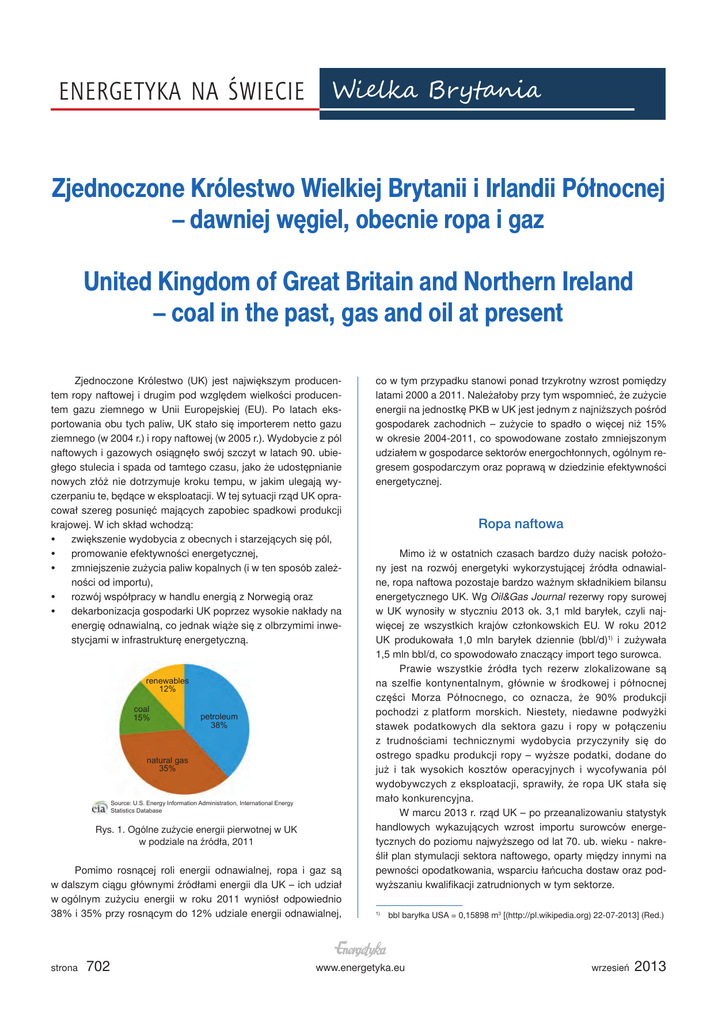 Energetyka na świecie Wielka Brytania Zjednoczone Królestwo Wielkiej Brytanii i Irlandii Północnej – dawniej węgiel, obecnie ropa i gaz United Kingdom of Great Britain and Northern Ireland – coal in the past, gas and oil at present Zjednoczone Królestwo (UK) jest największym producentem ropy naftowej i drugim pod względem wielkości producentem gazu ziemnego w Unii Europejskiej (EU). Po latach eksportowania obu tych paliw, UK stało się importerem netto gazu ziemnego (w 2004 r.) i ropy naftowej (w 2005 r.). Wydobycie z pól naftowych i gazowych osiągnęło swój szczyt w latach 90. ubiegłego stulecia i spada od tamtego czasu, jako że udostępnianie nowych złóż nie dotrzymuje kroku tempu, w jakim ulegają wyczerpaniu te, będące w eksploatacji. W tej sytuacji rząd UK opracował szereg posunięć mających zapobiec spadkowi produkcji krajowej. W ich skład wchodzą: • zwiększenie wydobycia z obecnych i starzejących się pól, • promowanie efektywności energetycznej, • zmniejszenie zużycia paliw kopalnych (i w ten sposób zależności od importu), • rozwój współpracy w handlu energią z Norwegią oraz • dekarbonizacja gospodarki UK poprzez wysokie nakłady na energię odnawialną, co jednak wiąże się z olbrzymimi inwestycjami w infrastrukturę energetyczną. renewables 12% coal 15% petroleum 38% natural gas 35% Source: U.S. Energy Information Administration, International Energy Statistics Database Rys. 1. Ogólne zużycie energii pierwotnej w UK w podziale na źródła, 2011 Pomimo rosnącej roli energii odnawialnej, ropa i gaz są w dalszym ciągu głównymi źródłami energii dla UK – ich udział w ogólnym zużyciu energii w roku 2011 wyniósł odpowiednio 38% i 35% przy rosnącym do 12% udziale energii odnawialnej, strona 702 co w tym przypadku stanowi ponad trzykrotny wzrost pomiędzy latami 2000 a 2011. Należałoby przy tym wspomnieć, że zużycie energii na jednostkę PKB w UK jest jednym z najniższych pośród gospodarek zachodnich – zużycie to spadło o więcej niż 15% w okresie 2004-2011, co spowodowane zostało zmniejszonym udziałem w gospodarce sektorów energochłonnych, ogólnym regresem gospodarczym oraz poprawą w dziedzinie efektywności energetycznej. Ropa naftowa Mimo iż w ostatnich czasach bardzo duży nacisk położony jest na rozwój energetyki wykorzystującej źródła odnawialne, ropa naftowa pozostaje bardzo ważnym składnikiem bilansu energetycznego UK. Wg Oil&Gas Journal rezerwy ropy surowej w UK wynosiły w styczniu 2013 ok. 3,1 mld baryłek, czyli najwięcej ze wszystkich krajów członkowskich EU. W roku 2012 UK produkowała 1,0 mln baryłek dziennie (bbl/d)1) i zużywała 1,5 mln bbl/d, co spowodowało znaczący import tego surowca. Prawie wszystkie źródła tych rezerw zlokalizowane są na szelfie kontynentalnym, głównie w środkowej i północnej części Morza Północnego, co oznacza, że 90% produkcji pochodzi z platform morskich. Niestety, niedawne podwyżki stawek podatkowych dla sektora gazu i ropy w połączeniu z trudnościami technicznymi wydobycia przyczyniły się do ostrego spadku produkcji ropy – wyższe podatki, dodane do już i tak wysokich kosztów operacyjnych i wycofywania pól wydobywczych z eksploatacji, sprawiły, że ropa UK stała się mało konkurencyjna. W marcu 2013 r. rząd UK – po przeanalizowaniu statystyk handlowych wykazujących wzrost importu surowców energetycznych do poziomu najwyższego od lat 70. ub. wieku - nakreślił plan stymulacji sektora naftowego, oparty między innymi na pewności opodatkowania, wsparciu łańcucha dostaw oraz podwyższaniu kwalifikacji zatrudnionych w tym sektorze. bbl baryłka USA = 0,15898 m3 [(http://pl.wikipedia.org) 22-07-2013] (Red.) 1) www.energetyka.eu wrzesień 2013 Mimo to, w ocenie EIA, produkcja ropy w UK będzie nadal spadać, pozostając poniżej poziomu 1 mln bbl/d aż do końca roku 2014, ze względu na bliskie wyczerpania zasoby pól eksploatowanych oraz malejące szanse na znaczące odkrycia w najbliższej przyszłości. Wydobycie ropy UK produkuje głównie trzy gatunki ropy, które, ogólnie rzecz biorąc, są lekkie i słodkie, co czyni je atrakcyjnymi dla nabywców zagranicznych: • Flotta – z terminalem przeładunkowym na Orkneyach i produkcją na poziomie 50 000 bbl/d w roku 2012, • Forties – wydobywana w centralnej części Morza Północnego, na południe od kompleksu Brent i na wschód od Flotty z wydobyciem 500 000 bbl/d w roku 2011, • Brent – pompowany do terminalu na Szetlandach z produkcją na poziomie 70 000 bbl/d w roku 2012. Pola wydobywcze eksploatowane są przez operatorów, z których, wg danych DECC za rok 2012, najwięksi to: Nexen – z produkcją na poziomie 192 000 bbl/d oraz BP – 132 000 bbl/d. Oczywiście, przez cały czas trwa proces wyczerpywania się starych pól i otwierania nowych, jednak generalnie popyt góruje nad podażą. Import/Eksport Zjednoczone Królestwo - kiedyś jeden w wielkich eksporterów ropy naftowej – boryka się obecnie ze spadkiem eksportu idącym w parze ze zmniejszeniem się produkcji krajowej. Jednak pomimo tego niekorzystnego trendu, nadal jest jednym z największych producentów i eksporterów w Europie – i, wg danych opublikowanych przez HMRC (Urząd Skarbowy i Podatkowy UK), eksportowało w roku 2011 ok. 690 000 bbl/d, z czego znaczna większość (82%) była przeznaczona dla Europy – głównie Niemiec i Holandii. Germany 21% Netherlands 34% France 11% Other 17% Poland 4% United States 13% Source: United Kingdom's HMRC Rys. 3. UK – eksport ropy naftowej do poszczególnych krajów, 2011 million barrels per day 3.0 history 2.5 2.0 UK jest również znaczącym importerem ropy, odbierającym w roku 2011 więcej niż 1 mln bbl/d. Wg HMRC, większość tego importu (67%) pochodziła z Norwegii, co stanowi pewien spadek w stosunku do 72% z poprzedniego roku. Pozostały import to głównie Rosja (8%), Nigeria (7%) oraz Środkowy Wschód (2%). fore
