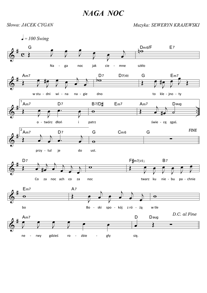 NAGA NOC Słowa: JACEK CYGAN # q = 100 Swing Muzyka: SEWERYN KRAJEWSKI œ J & c Œ G Na -‐ œ J œ J ga noc œ J jak # AŒ m 7 œ # œ œ œ j j & J J J J œ œ w stu -‐ dni # ŒA m 7 & 1 # ŒA m 7 & 2 # DŒ 7 & œ œ J J & œ. œ J D7 przy -‐ tul w ( ) noc ach co w # -‐ œ J œ J rwy gdzieś ro FINE ∑ G twarz ku j œ œJ œ J zbie .. #m7( b 5 ) B7 œ œ œ œ œ œJ Œ J J J J J œ -‐ Œ F noc Œ œ J j j D aug œ #œ ˙ Am7 Cm 6 ust. A7 kle -‐ jno -‐ ty świe -‐ cę zgaś. Bo -‐ ski # œ & J Œ Em7 w za bo Am7 Em7 œ # œ œ œJ Œ J J J G to j j œ # œj œ œj œj œj w za E7 szkło D 7 b9 7 G do Em7 ne mne patrz j œ je -‐ dno B 7/D i j j D7 œ œ œ. cie b Dw na -‐ gie o -‐ twórz dłoń Co # wi -‐ na œ J n Dwm 6/F j œ -‐ j j j œ œ œ spo -‐ kój z ró -‐ żą œ D gły się. œ nie -‐ bu pa -‐ chnie w w tle Œ D aug Ó D.C. al Fine