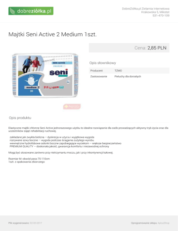 DobreZiółka.pl Zielarnia Internetowa Krakowska 5, Mikstat 531-470-109 Majtki Seni Active 2 Medium 1szt. Cena: 2,85 PLN Opis słownikowy Producent TZMO Zastosowanie Pieluchy dla dorosłych Opis produktu Elastyczne majtki chłonne Seni Active jednorazowego użytku to idealne rozwiązanie dla osób prowadzących aktywny tryb życia oraz dla uczestników zajęć rehabilitacji ruchowej. zakładane jak zwykła bielizna – dyskrecja w użyciu i wyjątkowa wygoda rozrywane szwy boczne – wygoda podczas ściągania zużytego wyrobu wewnętrzne hydrofobowe osłonki boczne zapobiegające wyciekom – większe bezpieczeństwo PREMIUM QUALITY – doskonała jakość, gwarancja komfortu i niezawodnej ochrony Mogą być stosowane zarówno przy nietrzymaniu moczu, jak i przy inkontynencji kałowej. Rozmiar M: obwód pasa 75-110cm 1szt. z opakowania zbiorczego Plik wygenerowano: 02-03-2017 Powered by TCPDF (www.tcpdf.org) Oprogramowanie sklepu: AptusShop