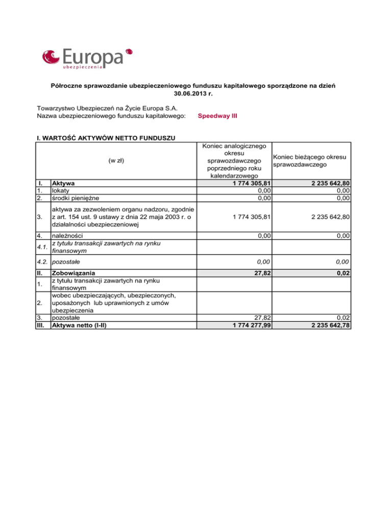Półroczne sprawozdanie ubezpieczeniowego funduszu kapitałowego sporządzone na dzień 30.06.2013 r. Towarzystwo Ubezpieczeń na Życie Europa S.A. Nazwa ubezpieczeniowego funduszu kapitałowego: Speedway III I. WARTOŚĆ AKTYWÓW NETTO FUNDUSZU (w zł) I. 1. 2. Aktywa lokaty środki pieniężne 3. aktywa za zezwoleniem organu nadzoru, zgodnie z art. 154 ust. 9 ustawy z dnia 22 maja 2003 r. o działalności ubezpieczeniowej Koniec analogicznego okresu Koniec bieżącego okresu sprawozdawczego sprawozdawczego poprzedniego roku kalendarzowego 1 774 305,81 2 235 642,80 0,00 0,00 0,00 0,00 1 774 305,81 2 235 642,80 4. należności z tytułu transakcji zawartych na rynku 4.1. finansowym 0,00 0,00 4.2. pozostałe 0,00 0,00 27,82 0,02 27,82 1 774 277,99 0,02 2 235 642,78 II. 1. 2. 3. III. Zobowiązania z tytułu transakcji zawartych na rynku finansowym wobec ubezpieczających, ubezpieczonych, uposażonych lub uprawnionych z umów ubezpieczenia pozostałe Aktywa netto (I-II) Półroczne sprawozdanie ubezpieczeniowego funduszu kapitałowego sporządzone na dzień 30.06.2013 r. Towarzystwo Ubezpieczeń na Życie Europa S.A. Nazwa ubezpieczeniowego funduszu kapitałowego: Speedway III II. ZMIANY AKTYWÓW NETTO FUNDUSZU (w zł) A. B. I. 1. 2. 3. II. 1. 2. 3. 4. 5. 6. 7. Aktywa netto funduszu na początek okresu sprawozdawczego Stan netto z działalności operacyjnej (I-II) Zwiększenia funduszu tytułem składek zwiększających wartość funduszu pozostałe przychody pozostałe zwiększenia Zmniejszenia funduszu tytułem wykupu tytułem wypłat pozostałych świadczeń ubezpieczeniowych tytułem opłaty za ryzyko ubezpieczeniowe oraz innych opłat potrącanych z fuduszu tytułem zwrotu składek ubezpieczeniowych tytułem opłat za zarządzanie funduszem oraz innych opłat tytułem administrowania funduszem pozostałe koszty Analogiczny okres sprawozdawczy poprzedniego roku kalendarzowego Bieżący okres sprawozdawczy 1 846 419,19 2 003 710,09 -12 940,00 0,00 0,00 0,00 0,00 0,00 12 940,00 12 940,00 0,00 0,00 0,00 0,00 0,00 0,00 -59 201,20 231 932,69 1 774 277,99 2 235 642,78 pozostałe zmniejszenia C. Wynik netto z działalności inwestycyjnej D. Aktywa netto funduszu na koniec okresu sprawozdawczego Półroczne sprawozdanie ubezpieczeniowego funduszu kapitałowego sporządzone na dzień 30.06.2013 r. Towarzystwo Ubezpieczeń na Życie Europa S.A. Nazwa ubezpieczeniowego funduszu kapitałowego: III LICZBA I WARTOŚĆ JEDNOSTEK ROZRACHUNKOWYCH (w zł) I. 1. 2. II. 1. 2. 3. 4. Speedway III Liczba jednostek rozrachunkowych: na początek okresu sprawozdawczego na koniec okresu sprawozdawczego Wartość jednostki rozrachunkowej (w zł): na początek okresu sprawozdawczego minimalna wartość jednostki rozrachunkowej w okresie sprawozdawczym maksymalna wartość jednostki rozrachunkowej w okresie sprawozdawczym na koniec okresu sprawozdawczego Analogiczny okres sprawozdawczy poprzedniego roku kalendarzowego Bieżący okres sprawozdawczy 28 009,9998 27 809,9998 27 709,9998 27 709,9998 65,92 72,31 60,53 72,31 65,92 63,80 84,12 80,68 Półroczne sprawozdanie ubezpieczeniowego funduszu kapitałowego sporządzone na dzień 30.06.2013 r. Towarzystwo Ubezpieczeń na Życie Europa S.A. Nazwa ubezpieczeniowego funduszu kapitałowego: IV ZESTAWIENIE AKTYWÓW NETTO FUNDUSZU (w zł) I. 1. 2. Speedway III Lokaty (suma 1-12) papiery wartościowe emitowane, poręczone lub gwarantowane przez Skarb Państwa lub organizacje międzynarodowe, których członkiem jest Rzeczpospolita Polska obligacje emitowane lub poręczone przez jednostki samorządu terytorialnego lub związki jednostek samorządu terytorialnego Udział w aktywach netto funduszu (w %) 0,00 0,00% Wartość bilansowa (w zł) 0,00 0,00% 0,00% 3. Inne dłużne papiery wartościowe o stałej stopie dochodu 0,00 0,00% 4. 5. 6. akcje udziały jednostki uczestnictwa lub certyfikaty inwestycyjne w funduszach inwestycyjnych instrumenty pochodne, o ile służą zmniejszeniu ryzyka związanego z innymi aktywami stanowiącymi pokrycie rezerw techniczno-ubezpieczeniowych inne papiery wartościowe o zmiennej stopie dochodu pożyczki nieruchomości depozyty bankowe pozostałe lokaty Aktywa za zezwoleniem organu nadzoru, zgodnie z art.. 154 ust.9 ustawy z dnia 22 maja 2003 r. o działalności ubezpieczeniowej Środki pieniężne Należności Zobowiązania Aktywa netto (w tym) krajowe zagraniczne - kraje UE zagraniczne - kraje poza UE 0,00 0,00% 0,00% 0,00 0,00% 0,00 0,00% 7. 8. 9. 10. 11. 12. II. III. IV V. VI. 1. 2. 3. 0,00 0,00 0,00% 0,00% 0,00% 0,00% 0,00% 2 235 642,80 0,00 0,00 0,02 2 235 642,78 -0,02 2 235 642,80 0,00 100,00% 0,00% 0,00% 0,00% 100,00% 0,00% 100,00% 0,00% 0,00