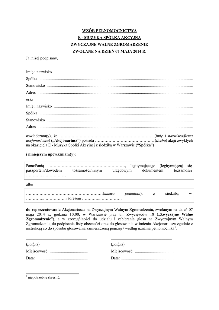 WZÓR PEŁNOMOCNICTWA E - MUZYKA SPÓŁKA AKCYJNA ZWYCZAJNE WALNE ZGROMADZENIE ZWOŁANE NA DZIEŃ 07 MAJA 2014 R. Ja, niżej podpisany, Imię i nazwisko ......................................................................................................................................... Spółka ........................................................................................................................................................ Stanowisko ................................................................................................................................................ Adres ......................................................................................................................................................... oraz Imię i nazwisko ......................................................................................................................................... Spółka ........................................................................................................................................................ Stanowisko ................................................................................................................................................ Adres ......................................................................................................................................................... oświadczam(y), że …………………………………………………………… (imię i nazwisko/firma akcjonariusza) („Akcjonariusz”) posiada …………………………………….. (liczba) akcji zwykłych na okaziciela E - Muzyka Spółki Akcyjnej z siedzibą w Warszawie (“Spółka”) i niniejszym upoważniam(y): Pana/Panią …………………………………………………, legitymującego (legitymującą) się paszportem/dowodem tożsamości/innym urzędowym dokumentem tożsamości …………..……………, albo …………………………………………………(nazwa podmiotu), …………..…………… i adresem …………..……………, z siedzibą w do reprezentowania Akcjonariusza na Zwyczajnym Walnym Zgromadzeniu, zwołanym na dzień 07 maja 2014 r., godzina 10:00, w Warszawie przy ul. Zwycięzców 18 („Zwyczajne Walne Zgromadzenie”), a w szczególności do udziału i zabierania głosu na Zwyczajnym Walnym Zgromadzeniu, do podpisania listy obecności oraz do głosowania w imieniu Akcjonariusza zgodnie z instrukcją co do sposobu głosowania zamieszczoną poniżej / według uznania pełnomocnika 1. ______________________________ ______________________________ (podpis) (podpis) Miejscowość: ...................................... Miejscowość: ...................................... Data: ................................................... Data: .................................................... 1 niepotrzebne skreślić. WAŻNE INFORMACJE: Identyfikacja Akcjonariusza W celu identyfikacji Akcjonariusza udzielającego pełnomocnictwa, do niniejszego pełnomocnictwa powinna zostać załączona: (i) w przypadku akcjonariusza będącego osobą fizyczną - kopia dowodu osobistego, paszportu lub innego urzędowego dokumentu potwierdzającego tożsamość akcjonariusza; albo (ii) w przypadku akcjonariusza innego niż osoba fizyczna – kopia odpisu z właściwego rejestru lub innego dokumentu potwierdzającego upoważnienie osoby fizycznej (lub osób fizycznych) do reprezentowania Akcjonariusza na Zwyczajnym Walnym Zgromadzeniu (np. nieprzerwany ciąg pełnomocnictw). W przypadku wątpliwości co do prawdziwości kopii wyżej wymienionych dokumentów, Zarząd zastrzega sobie prawo do żądania od pełnomocnika okazania przy sporządzaniu listy obecności: (i) w przypadku akcjonariusza będącego osobą fizyczną – kopii potwierdzonej za zgodność z oryginałem przez notariusza lub inny podmiot uprawniony do potwierdzania za zgodność z oryginałem kopii dowodu osobistego, paszportu lub innego urzędowego dokumentu potwierdzającego tożsamość akcjonariusza; albo (ii) w przypadku akcjonariusza innego niż osoba fizyczna - oryginału lub kopii potwierdzonej za zgodność z oryginałem przez notariusza lub inny podmiot uprawniony do potwierdzania za zgodność z oryginałem odpisu z właściwego rejestru lub innego dokumentu potwierdzającego upoważnienie osoby fizycznej (lub osób fizycznych) do reprezentowania pełnomocnika na Zwyczajnym Walnym Zgromadzeniu (np. nieprzerwany ciąg pełnomocnictw). Identyfikacja pełnomocnika W celu identyfikacji pełnomocnika, Zarząd zastrzega sobie prawo do żądania od pełnomocnika okazania przy sporządzaniu listy obecności: (i) w przypadku pełnomocnika będącego osobą fizyczną - dowodu osobistego, paszportu lub innego urzędowego dokumentu potwierdzającego tożsamość akcjonariusza; albo (ii) w przypadku pełnomocnika innego niż osoba fizyczna - oryginału lub kopii potwierdzonej za zgodność z oryginałem przez notariusza lub inny podmiot uprawniony do potwierdzania za zgodność z oryginałem odpisu z właściwego rejestru lub innego dokumentu potwierdzającego upoważnienie osoby fizycznej (osób fizycznych) do reprezentowania pełnomocnika na Zwyczajnym Walnym Zgromadzeniu (np. nieprzerwany ciąg pełnomocnictw). ZWRACAMY UWAGĘ, ŻE W PRZYPADKU ROZBIEŻNOŚCI POMIĘDZY DANYMI AKCJONARIUSZA WSKAZANYMI W PEŁNOMOCNICTWIE A DANYMI ZNAJDUJĄCYMI SIĘ NA LIŚCIE AKCJONARIUSZY SPORZĄDZONEJ W OPARCIU O WYKAZ OTRZYMANY OD PODMIOTU PROWADZĄCEGO DEPOZYT PAPIERÓW WARTOŚCIOWYCH (KRAJOWY DEPOZYT PAPIERÓW WARTOŚCIOWYCH S.A.) I PRZEKAZANEGO SPÓŁCE ZGODNIE Z ART. 4063 KODEKSU SPÓŁEK HANDLOWYCH AKCJONARIUSZ MOŻE NIE ZOSTAĆ DOPUSZCZONY DO UCZESTNICTWA W ZWYCZAJNYM WALNYM ZGROMADZENIU. ZWRACAMY UWAGĘ, ŻE SPÓŁKA NIE NAKŁADA OBOWIĄZKU UDZIELANIA PEŁNOMOCNICTWA NA POWYŻSZYM FORMULARZU.
