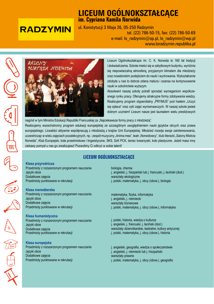 LICEUM OGÓLNOKSZTAŁCĄCE im. Cypriana Kamila Norwida RADZYMIN ul. Konstytucji 3 Maja 26, 05-250 Radzymin tel. (22) 786-50-15, fax: (22) 786-50-69 e-mail: [email protected], [email protected] www.loradzymin.republika.pl Liceum Ogólnokształcące im. C. K. Norwida to 160 lat tradycji i doświadczenia. Szkoła mieści się w zabytkowym budynku, wyróżnia się niepowtarzalną atmosferą, przyjaznym klimatem dla młodzieży oraz nowatorskim podejściem do nauki i wychowania. Wykształcenie zdobyte u nas to dobrze zdana matura i szansa na kontynuowanie nauki w szkolnictwie wyższym. Absolwent naszej szkoły potrafi sprostać wymaganiom współczesnego rynku pracy. Oferujemy atrakcyjne formy zdobywania wiedzy. Realizujemy program stypendialny „PRYMUS” pod hasłem „Uczyć się opłaca” oraz cykl zajęć wyrównawczych. W naszej szkole jesteś dobrym uczniem! Liceum nasze jest laureatem wielu prestiżowych nagród w tym Ministra Edukacji Republiki Francuskiej za „Najciekawsze formy pracy z młodzieżą”. Realizujemy wszechstronny program edukacji europejskiej ze szczególnym uwzględnieniem nauki języków obcych oraz prawa europejskiego. Licealiści aktywnie współpracują z młodzieżą z krajów Unii Europejskiej. Młodzież rozwija swoje zainteresowania, uczestnicząc w wielu zajęciach pozalekcyjnych, np.: zespół muzyczny „Anima mea”, teatr „Norwidowcy”, klub literacki „Salony Mistrza Norwida”, Klub Europejski, koła przedmiotowe i lingwistyczne, SKS, SzK PCK, taniec towarzyski, koło plastyczne. Jeżeli masz inny ciekawy pomysł u nas go zrealizujesz! Pozwolimy Ci odkryć w sobie talent! LICEUM OGÓLNOKSZTAŁCĄCE Klasa przyrodnicza Przedmioty z rozszerzonym programem nauczania Języki obce Dodatkowe zajęcia Przedmioty punktowane w rekrutacji Klasa menedżerska Przedmioty z rozszerzonym programem nauczania Języki obce Dodatkowe zajęcia Przedmioty punktowane w rekrutacji Klasa humanistyczna Przedmioty z rozszerzonym programem nauczania Języki obce Dodatkowe zajęcia Przedmioty punktowane w rekrutacji Klasa europejska Przedmioty z rozszerzonym programem nauczania Języki obce Dodatkowe zajęcia Przedmioty punktowane w rekrutacji biologia, chemia j. angielski, j. hiszpański lub j. francuski, j. łaciński (dod.) warsztaty ekologiczne j. polski, matematyka, j. obcy (obow.), biologia matematyka, fizyka, informatyka j. angielski, j. niemiecki warsztaty biznesowe j. polski, matematyka, j. obcy (obow.), informatyka j. polski, historia, wiedza o kulturze j. angielski, j. francuski, j. łaciński (dod.) warsztaty dziennikarskie, teatralne, kultury antycznej j. polski, matematyka, j. obcy (obow.), historia j. angielski, geografia, wiedza o społeczeństwie j. angielski, j. niemiecki lub j. hiszpański warsztaty prawne j. polski, matematyka, j. obcy (obow.), geografia LICEUM OGÓLNOKSZTAŁCĄCE im. Bitwy Warszawskiej 1920 roku ul. Żwirki i Wigury 4, 05-281 Urle tel./fax: (25) 675-48-94 e-mail: [email protected] www.liceumurle.pl URLE Szkoła została otworta 1 września 2002 r. Od początku w szkole prowadzona jest innowacja pedagogiczna. Istnieją klasy wojskowe i policyjne. Raz w miesiącu klasy wojskowe wyjeżdżają do Oddziału Specjalnego Żandarmerii Wojskowej w Mińsku Maz. na zajęcia poligonowe. W tym samym miejscu organizowany jest również obóz szkoleniowo-wypoczynkowy, który kończy się egzaminem i uzyskaniem certyfikatu. Raz w miesiącu uczniowie wyjeżdżają na strzelnice CWKS „Legia” w Warszawie. Natomiast klasy policyjne dwa razy w semestrze wyjeżdżają do Centrum Szkolenia Policji w Legionowie. Szkoła bierze udział w różnych akcjach i konkursach np.: „Góra grosza”, „Młodzi głosują”, „Sprawni jak żołnierze”, „O złotą łuskę”, „Mam haka na raka”. Obecnie w 5 klasach Liceum uczy się 148 uczniów. Zajęcia dodatkowe: koła zainteresowań (polonistyczno-teatralne, informatyczne, strzeleckie, historyczne, germanistyczne, teologiczne), zajęcia sportowe z sekcjami: tenisa stołowego, piłki nożnej, siatkowej i koszykowej. Szkoła posiada: 2 pracownie komputerowe (internet), bibliotekę, salę gimnastyczną, siłownię, boiska do gier zespołowych, ścianę wspinaczkową. Od 1 września 2010 roku powstanie klasa strażacka. LICEUM OGÓLNOKSZTAŁCĄCE Klasa wojskowa Języki obce Przedmioty w zakresie rozszerzonym Zwiększona ilość godzin Dodatkowy przedmiot Klasa policyjna Języki obce Przedmioty w zakresie rozszerzonym Zwiększona ilość godzin Dodatkowy przedmiot Klasa strażacka Języki obce Przedmioty w zakresie rozszerzonym Zwiększona ilość godzin Dodatkowy przedmiot język angielski, język niemiecki matematyka, wiedza o społeczeństwie, historia wychowanie fizyczne przysposobienie wojskowe język angielski, język niemiecki język angielski, historia, matematyka wychowanie fizyczne prawo policyjne język angielski, język niemiecki historia, wiedza o społeczeństwie, matematyka wychowanie fizyczne ochrona przeciwpożarowa Gimnazjalisto! Dzięki naszemu Liceum otrzymasz wykształcenie i zdobędziesz umiejętności, które pozwolą Ci dostać się na studia i zdobyć upragniony zawód. ZESPÓŁ SZKÓŁ im. Krzysztofa Kamila Baczyńskiego TŁUSZCZ ul. Radzymińska 2, 05-240 Tłuszcz tel./fax: (29) 777-42-00 e-mail: [email protected] www.zs.tluszcz.pl Zespół Szkół im. K.K.Baczyńskiego w Tłuszczu to szkoła nowoczesna i nowatorska pod wieloma względami. Naszą tradycję dopiero budujemy i kształtujemy, więc każdy uczeń może odcisnąć swój wyraźny ślad i mieć poczucie, że tworzy coś ponadczasowego. Przyświeca nam dewiza Henri Bergsona „Trzeba działać jak człowiek myślący, trzeba myśleć jak człowiek czynu”. Naszymi mocnymi stronami są: nowoczesny budynek ze świetnie wyposażonymi salami lekcyjnymi, świeżo wyremontowana, pełnowymiarowa hala sportowa i nowoczesne boiska, pracownia fryzjerska wyposażona w sprzęt o najwyższym standardzie; profesjonalna kadra pedagogicz