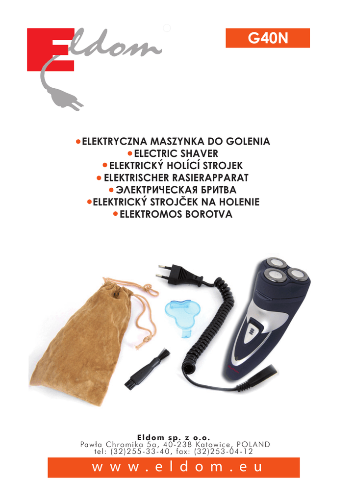 R G40N ELEKTRYCZNA MASZYNKA DO GOLENIA ELECTRIC SHAVER ELEKTRICKÝ HOLÍCÍ STROJEK ELEKTRISCHER RASIERAPPARAT ЭЛЕКТPИЧЕСКАЯ БРИТВА ELEKTRICKÝ STROJČEK NA HOLENIE ELEKTROMOS BOROTVA Eldom sp. z o.o. Pa w ł a C h r o m i k a 5 a , 4 0 - 2 3 8 Ka t o w i c e , P O L A N D tel: (32)255-33-40, fax: (32)253-04-12 w w w . e l d o m . e u INSTRUKCJA OBSŁUGI R ELEKTRYCZNA MASZYNKA DO GOLENIA G40N 1 OPIS OGÓLNY 1. Głowica z trzema ostrzami tnącymi 2. Włącznik 3. Wskaźnik ładowania 4. Gniazdo przyłaczenia przewodu zasilającego 5. Trymer 6 6. Przycisk otwierania trymera 7. Przycisk otwierania obudowy głowicy 5 7 DANE TECHNICZNE - moc 3W - ładowanie z sieci 230V ~ 50Hz - akumulator Ni-MH 600 mAh - czas ładowania 8h, 2 3 WSKAZANIA BEZPIECZEŃSTWA 4 Przed użyciem należy dokładnie przeczytać instrukcję, · urządzenie przeznaczone jest jedynie do użytku domowego, · urządzenie to nie jest przeznaczone do użytku przez osoby (w tym dzieci) z ograniczonymi zdolnościami fizycznymi, sensorycznymi lub umysłowymi, chyba, że będą one nadzorowane przez osobę odpowiedzialną za ich bezpieczeństwo. Należy zwracać uwagę aby dzieci nie bawiły się sprzętem · nie zanurzać urządzenia w wodzie i innych cieczach, · używać tylko z oryginalnie dołączonymi akcesoriami, · nie używać na wolnym powietrzu, · nie używać urządzenia w przypadku uszkodzenia kabla lub wtyczki, gdy urządzenie spadło lub zostało uszkodzone w inny sposób, · napraw sprzętu może dokonać jedynie autoryzowany punkt serwisowy. Wszelkie modernizacje lub stosowanie nieoryginalnych części zamiennych lub elementów urządzenia jest zabronione i zagraża bezpieczeństwu użytkowania. · Firma Eldom Sp. z o. o. nie ponosi odpowiedzialności za ewentualne szkody powstałe w wyniku niewłaściwego używania urządzenia OSTRZEŻENIE. Nie stosować tego sprzętu w pobliżu wanien, pryszniców, basenów i podobnych zbiorników z wodą. OCHRONA ŚRODOWISKA - urządzenie jest zbudowane z materiałów, które mogą być poddane ponownemu przetwarzaniu lub recyklingowi, - należy je przekazać do odpowiedniego punktu, który zajmuje się zbieraniem i recyklingiem urządzeń elektrycznych i elektronicznych. 2 UŻYTKOWANIE URZĄDZENIA - używanie urządzenia możliwe jest po naładowaniu akumulatora - w celu naładowania akumulatorów podłączyć kabel zasilający do gniazda (4) i podłączyć urządzenie do sieci - ładowanie sygnalizowane jest zieloną lampką kontrolną (3). Urządzenie wyposażone jest w wewnętrzne akumulatory, których czas ładowania wynosi około 8 godzin. Lampka kontrolna nie gaśnie po naładowaniu akumulatorów. Aby przedłużyć żywotność baterii ładowanie powinno odbywać się w jednym, nieprzerwanym cyklu po całkowitym rozładowaniu - po naładowaniu należy odłączyć urządzenie od sieci oraz wypiąć kabel zasilający z gniazda (4) - golarka rozpoczyna pracę po wciśnięciu włącznika (2) - urządzenie wyposażone jest w trymer (5) do strzyżenia brody CZYSZCZENIE I KONSERWACJA - przed czyszczeniem odłączyć urządzenie od sieci - urządzenia nie wolno zanurzać w wodzie - nie używać silnych lub niszczących powierzchnię środków czystości i produktów do czyszczenia - obudowę przecierać wilgotną szmatką - po każdym goleniu należy opróżnić komorę noży tnących. W tym celu zdjąć obudowę głowicy wciskająć przycisk (7) oraz zdjąć mocowanie ostrzy przekręcając delikatnie pokrętło (fot. 1)*. Do czyszczenia używać dołączonego pędzelka. fot. 1 WYMIANA SITEK I NOŻY W celu wymiany noży i sitek postępować zgodnie z demontażem opisanym w punkcie „CZYSZCZENIE I KONSERWACJA”. Kolejność demontażu ilustruje fot. 2. Noże i sitka są elementem eksploatacyjnym i powinny być regularnie wymieniane. Nie są objęte gwarancją. UWAGI DOTYCZĄCE UŻYTKOWANIA fot. 2 Nóż oraz sitko noży tnących podlegają normalnemu zużyciu i nie są objęte gwarancją Mogą je Państwo zamówić poprzez stronę www.eldom.eu lub korzystając z poniższego formularza, wysyłając go pocztą na adres producenta. Przy zamówieniu powyżej 3 szt. prosimy o potwierdzenie telefoniczne: tel. 032 253 04 13. IMIĘ: ________________________________________________________________________ NAZWISKO: __________________________________________________________________ TELEFON: ____________________________________________________________________ DOKŁADNY ADRES: ____________________________________________________________ _____________________________________________________________________________ _____________________________________________________________________________ Zamawiam _____ kompletów (komplet = 1 sitko + 1 nóż) do modelu G40N i proszę o przesłanie ich pocztą. Płatne przy odbiorze przesyłki. * fotografie produktów mogą nieznacznie odbiegać od ich faktycznego wyglądu 3 WARUNKI GWARANCJI 1. Producent zapewnia dobrą jakość i dobre działanie sprzętu, którego dotyczy niniejsza gwarancja w okresie 24 miesięcy od daty sprzedaży zapisanej w dowodzie zakupu. 2. Wady lub uszkodzenia sprzętu ujawnione w okresie gwarancji, będą usuwane bezpłatnie na terenie RP w terminie 14 dni od daty dostarczenia niesprawnego urządzenia do punktu serwisowego wraz z dowodem zakupu. 3. Reklamujący powinien dostarczyć uszkodzony sprzęt do miejsca zakupu lub wysłać go w oryginalnym opakowaniu wraz z dowodem zakupu Pocztą Polską do centralnego punktu serwisowego na adres: ELDOM Sp. z o.o., 40-238 Katowice, ul. Pawła Chromika 5A. Paczkę można wysłać Pocztą Polską jako zwykłą przesyłkę pobraniową (bez opcji “PRIORYTET”, “OSTROŻNIE” itp). Kwota pobrania powinna się równać kosztowi nadania przesyłki, a wartość paczki należy zadeklarować jako 0 PLN. Przesyłka powinna być zabezpieczona przed uszkodzeniem w czasie transportu. Nie przyjmujemy przesyłek kurierskich wysłanych na nasz koszt. 4. Pojęcie "naprawa" nie ob
