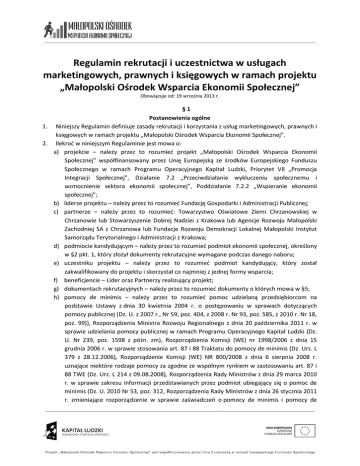 Regulamin rekrutacji i uczestnictwa w usługach marketingowych, prawnych i księgowych w ramach projektu „Małopolski Ośrodek Wsparcia Ekonomii Społecznej” Obowiązuje od: 19 września 2013 r. §1 Postanowienia ogólne 1. Niniejszy Regulamin definiuje zasady rekrutacji i korzystania z usług marketingowych, prawnych i księgowych w ramach projektu „Małopolski Ośrodek Wsparcia Ekonomii Społecznej”. 2. Ilekrod w niniejszym Regulaminie jest mowa o: a) projekcie – należy przez to rozumied projekt „Małopolski Ośrodek Wsparcia Ekonomii Społecznej” współfinansowany przez Unię Europejską ze środków Europejskiego Funduszu Społecznego w ramach Programu Operacyjnego Kapitał Ludzki, Priorytet VII „Promocja Integracji Społecznej”, Działanie 7.2 „Przeciwdziałanie wykluczeniu społecznemu i wzmocnienie sektora ekonomii społecznej”, Poddziałanie 7.2.2 „Wspieranie ekonomii społecznej”; b) liderze projektu – należy przez to rozumied Fundację Gospodarki i Administracji Publicznej; c) partnerze – należy przez to rozumied: Towarzystwo Oświatowe Ziemi Chrzanowskiej w Chrzanowie lub Stowarzyszenie Dobrej Nadziei z Krakowa lub Agencje Rozwoju Małopolski Zachodniej SA z Chrzanowa lub Fundacje Rozwoju Demokracji Lokalnej Małopolski Instytut Samorządu Terytorialnego i Administracji z Krakowa; d) podmiocie kandydującym – należy przez to rozumied podmiot ekonomii społecznej, określony w §2 pkt. 1, który złożył dokumenty rekrutacyjne wymagane podczas danego naboru; e) uczestniku projektu – należy przez to rozumied podmiot kandydujący, który został zakwalifikowany do projektu i skorzystał co najmniej z jednej formy wsparcia; f) beneficjencie – Lider oraz Partnerzy realizujący projekt; g) dokumentach rekrutacyjnych – należy przez to rozumied dokumenty o których mowa w §5; h) pomocy de minimis – należy przez to rozumied pomoc udzielaną przedsiębiorcom na podstawie Ustawy z dnia 30 kwietnia 2004 r. o postępowaniu w sprawach dotyczących pomocy publicznej (Dz. U. z 2007 r., Nr 59, poz. 404, z 2008 r. Nr 93, poz. 585, z 2010 r. Nr 18, poz. 99)), Rozporządzenia Ministra Rozwoju Regionalnego z dnia 20 października 2011 r. w sprawie udzielania pomocy publicznej w ramach Programu Operacyjnego Kapitał Ludzki (Dz. U. Nr 239, poz. 1598 z późn. zm), Rozporządzenia Komisji (WE) nr 1998/2006 z dnia 15 grudnia 2006 r. w sprawie stosowania art. 87 i 88 Traktatu do pomocy de minimis (Dz. Urz. L 379 z 28.12.2006), Rozporządzenie Komisji (WE) NR 800/2008 z dnia 6 sierpnia 2008 r. uznające niektóre rodzaje pomocy za zgodne ze wspólnym rynkiem w zastosowaniu art. 87 i 88 TWE (Dz. Urz. L 214 z 09.08.2008), Rozporządzenia Rady Ministrów z dnia 29 marca 2010 r. w sprawie zakresu informacji przedstawianych przez podmiot ubiegający się o pomoc de minimis (Dz. U. 2010 Nr 53, poz. 312, Rozporządzenia Rady Ministrów z dnia 26 stycznia 2011 r. zmieniające rozporządzenie w sprawie zaświadczeo o pomocy de minimis i pomocy de 3. 4. 5. 6. minimis w rolnictwie i rybołówstwie (Dz. U. Nr 34 poz. 174) oraz Rozporządzenia Rady Ministrów z dnia 7 sierpnia 2008 r. w sprawie sprawozdao o udzielonej pomocy publicznej, informacji o nieudzieleniu takiej pomocy oraz sprawozdao o zaległościach przedsiębiorców we wpłatach świadczeo należnych na rzecz sektora finansów publicznych (Dz. U. Nr 153, poz. 952); i) usłudze – należy przez to rozumied wsparcie udzielone Uczestnikowi Projektu zgodnie z jego potrzebami wybrane spośród katalogu usług prawych, księgowych, marketingowych. Dopuszcza się korzystanie łącznie z trzech typów usług. Udział w Projekcie jest bezpłatny. W przypadku każdego PES zakwalifikowanego do projektu wsparcie udzielane jest zgodnie z przepisami Rozporządzenia Komisji (WE) nr 800/2008 z dnia 6 sierpnia 2008 r. uznające niektóre rodzaje pomocy za zgodne ze wspólnym rynkiem w zastosowaniu art. 87 i 88 Traktatu (ogólne rozporządzenie w sprawie włączeo blokowych). Projekt jest realizowany od 01.08.2012 r. - 30.06.2015 r. Projekt jest realizowany na terenie całego województwa małopolskiego w podziale na 5 subregionów. Lider oraz Partnerzy realizują Projekt w subregionach: a. I tarnowski: miasto Tarnów, powiat tarnowski, powiat bocheoski, powiat brzeski, powiat dąbrowski - Stowarzyszenie Dobrej Nadziei; b. II sądecki: miasto Nowy Sącz, powiat nowosądecki, powiat gorlicki, powiat limanowski – Towarzystwo Oświatowe Ziemi Chrzanowskiej w Chrzanowie; c. III południowy: powiat nowotarski, powiat tatrzaoski, powiat suski – Fundacja Gospodarki i Administracji Publicznej; d. IV krakowski: miasto Kraków, powiat krakowski, powiat wielicki, powiat myślenicki, powiat proszowicki, powiat miechowski – Fundacja Rozwoju Demokracji Lokalnej Małopolski Instytut Samorządu Terytorialnego i Administracji; e. V zachodni: powiat chrzanowski, powiat oświęcimski, powiat olkuski, powiat wadowicki – Towarzystwo Oświatowe Ziemi Chrzanowskiej w Chrzanowie. §2 Uczestnicy Projektu 1. Uczestnikami Projektu są Małopolskie Podmioty Ekonomii Społecznej, będące osobą prawną, posiadające siedzibę na terenie Małopolski, w tym: a) spółdzielnie socjalne, inwalidów, niewidomych i pracy; b) organizacje pozarządowe prowadzące działalnośd gospodarczą; c) organizacje pozarządowe prowadzące odpłatną działalnośd statutową; d) organizacje pozarządowe prowadzące nieodpłatną działalnośd statutową ukierunkowane na profesjonalizację i ekonomizację działalności; e) podmiot wymieniony w art. 3 ust. 3 ustawy z dnia 24 kwietnia 2003 r. o pożytku publicznym i wolontariacie (Dz. U. z dnia 29 maja 2003 r. z późn.zm.), Centrum Integracji Społecznej (CIS), 2 Klub Integracji Społecznej (KIS), Zakład Aktywności Zawodowej (ZAZ), Warsztat Terapii Zajęciowej (WTZ). 2. W ramach w/w podmiotów do udziału w projekcie dopuszczone są podmioty spełniające minimum jedno z dwóch kryteriów tj.: (1) utworzone 