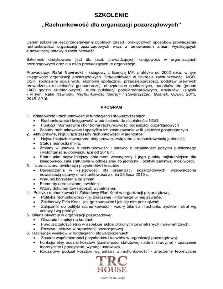 SZKOLENIE ,,Rachunkowość dla organizacji pozarządowych” Celem szkolenia jest przedstawienie ogólnych zasad i praktycznych sposobów prowadzenia rachunkowości organizacji pozarządowych wraz z omówieniem zmian wynikających z nowelizacji ustawy o rachunkowości. Szkolenie dedykowane jest dla osób prowadzących księgowość w organizacjach pozarządowych oraz dla osób prowadzących te organizacje. Prowadzący: Rafał Nawrocki - księgowy z licencją MF, praktyka od 2002 roku, w tym księgowość organizacji pozarządowych. Szkoleniowiec w zakresie rachunkowości NGO, OSP, spółdzielni socjalnych, ekonomii społecznej, przedsiębiorczości, podstaw prawnych prowadzenia działalności gospodarczej, ubezpieczeń społecznych, podatków etc (ponad 1400 godzin szkoleniowych). Autor publikacji popularnonaukowych, artykułów, książek - w tym: Rafał Nawrocki, Rachunkowość fundacji i stowarzyszeń, Gdańsk, ODDK, 2013, 2015, 2016. PROGRAM 1. Księgowość i rachunkowość w fundacjach i stowarzyszeniach: Rachunkowość i księgowość w odniesieniu do działalności NGO; Funkcja informacyjna i kontrolna rachunkowości organizacji pozarządowych Zasady rachunkowości i specyfika ich zastosowania w III sektorze gospodarczym. 2. Akty prawne, regulujące zasady rachunkowości w jednostce: Najważniejsze zewnętrzne akty prawne, związane z rachunkowością jednostki; Status jednostki mikro; Zmiany w ustawie o rachunkowości i ustawie o działalności pożytku publicznego i wolontariacie, obowiązujące od 2016 r.; Statut jako najważniejszy dokument wewnętrzny i jego punkty najistotniejsze dla księgowego, cele statutowe w odniesieniu do jednostki i polityki państwa, możliwości. 3. Uproszczona ewidencja przychodów i kosztów Uproszczenia w księgowości dla organizacji pozarządowych, wprowadzone nowelizacją ustawy o rachunkowości z dnia 23 lipca 2015 r.; Warunki korzystania ze zmian; Elementy uproszczonej ewidencji; Wzory dokumentów i sposób wypełniania. 4. Polityka rachunkowości i Zakładowy Plan Kont w organizacji pozarządowej: Polityka rachunkowości - jej znaczenie i informacje w niej zawarte; Zakładowy Plan Kont - jak go zbudować i jak się nim posługiwać; Załączniki do polityki rachunkowości - wzory bilansu i rachunku zysków i strat wg ustawy i wg praktyki. 5. Bilans otwarcia w organizacji pozarządowej: Otwarcie i zapisy na kontach; Fundusz założycielski w aspekcie aktów prawnych zewnętrznych i wewnętrznych; Pasywa i aktywa w organizacji pozarządowej. 6. Rachunek wyników w fundacjach i stowarzyszeniach: Zasada współmierności przychodów i kosztów w organizacji pozarządowej; Funkcjonalny podział kosztów (działalności statutowej i administracyjne) - znaczenie teoretyczne i praktyczne, wymogi ustawowe. Rodzajowy podział kosztów wg ustawy o rachunkowości - znaczenie teoretyczne www.trc-house.pl i praktyczne, wymogi ustawy. Informacje dostępne z rachunku zysków i strat/wyników; Ćwiczenia praktyczne w interpretacji rachunku przychodów i kosztów. 7. Przychody organizacji pozarządowej: Przychody z działalności statutowej nieodpłatnej: składki członkowskie, darowizny, dotacje i subwencje, zbiórki publiczne, pozostałe przychody statutowe; Przychody 1% w działalności organizacji pożytku publicznego; Przychody finansowe i pozostałe przychody. 8. Koszty działalności jednostki non profit, klasyfikacje kosztów i księgowanie: Koszty administracyjne i statutowe; Koszty niestanowiące kosztów uzyskania przychodów organizacji, wymogi podatkowe; Aktywa trwałe i amortyzacja w odniesieniu do kosztów administracyjnych i statutowych; Koszty działalności organizacji pożytku publicznego; Koszty związane z zatrudnieniem i wolontariatem; Koszty finansowe i pozostałe koszty. Rozliczenie kosztów wg wymogów różnych ustaw. 9. Działalność statutowa odpłatna pożytku publicznego: Warunki uznania działań za działalność statutową odpłatną; Przychody i koszty w działalności statutowej odpłatnej. 10. Działalność gospodarcza a działalność statutowa: Wyodrębnienie działalności gospodarczej; Warunki prowadzenia działalności gospodarczej w organizacji pozarządowej; Kontrola działalności gospodarczej; Możliwości zaproponowane w ustawie o rachunkowości. 11. Sprawozdanie finansowe organizacji pozarządowej: Obowiązek i metody inwentaryzacji; Bilans zamknięcia i rachunek zysków i strat - wzory, możliwości; Wzór informacji dodatkowej; Informacje zawarte w sprawozdaniu finansowym. 12. Obowiązki podatkowe w organizacji pozarządowej Deklaracje: druki, urzędy docelowe i terminy ich dostarczenia; Obowiązek uiszczenia podatków PIT, CIT i VAT w organizacjach pozarządowych; Podstawa zwolnień podatkowych Pytania i dyskusja. www.trc-house.pl Formularz Zgłoszeniowy Zgłoszenie uczestnictwa w szkoleniu prosimy o przesłanie na adres [email protected] RACHUNKOWOŚĆ DLA ORGANIZACJI POZARZĄDOWYCH Termin Miejsce Cena 12.02.2016 r. 8:30-14:30 Łuków, ul. Warszawska 24 99 zł brutto Imię i nazwisko Adres e-mail Telefon Stanowisko Instytucja Warunki uczestnictwa: 1. Organizatorem szkolenia jest TRC House z siedzibą w Łukowie a współorganizatorem Fundacja Wspólny Los 2. Cena szkolenia obejmuje: udział w szkoleniu, materiały szkoleniowe, wydanie certyfikatu udziału w szkoleniu, serwis kawowy 3. Warunkiem udziału w szkoleniu jest otrzymanie przez TRC House lub Fundację Wspólny Los wypełnionego formularza zgłoszeniowego mailem. 4. Opłatę za szkolenie należy dokonać przelewem po otrzymaniu potwierdzenia od organizatora. W tytule przelewu należy wpisać nazwę szkolenia oraz nazwisko uczestnika TRC House Maria Michalczuk ul. Stodolna 20/45, 21-400 Łuków Bank BGŻ BNP Paribas S.A. 302030 0045 1110 0000 0237 4610 5. O przyjęciu na szkolenie decyduje kolejność zgłoszeń. 6. W przypadku odwołania szkolenia przez TRC House, wszelkie kwoty wpłacone tytułem udziału w szkoleniu zostaną zwrócone. 7. TRC H
