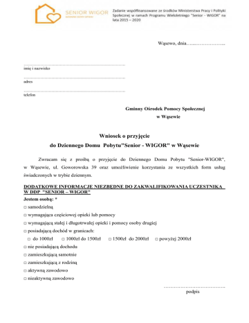 Wąsewo, dnia…....……………... ………………………………………………………………. imię i nazwisko ………………………………………………………………. adres ………………………………………………………………. telefon Gminny Ośrodek Pomocy Społecznej w Wąsewie Wniosek o przyjęcie do Dziennego Domu Pobytu"Senior - WIGOR" w Wąsewie Zwracam się z prośbą o przyjęcie do Dziennego Domu Pobytu "Senior-WIGOR", w Wąsewie, ul. Goworowska 39 oraz umożliwienie korzystania ze wszystkich form usług świadczonych w trybie dziennym. DODATKOWE INFORMACJE NIEZBĘDNE DO ZAKWALIFIKOWANIA UCZESTNIKA W DDP "SENIOR – WIGOR" \ Jestem osobą: * □ samodzielną □ wymagająca częściowej opieki lub pomocy □ wymagającą stałej i długotrwałej opieki i pomocy osoby drugiej □ posiadającą dochód w granicach: □ do 1000zł □ 1000zł do 1500zł □ 1500zł do 2000zł □ powyżej 2000zł □ nie posiadającą dochodu □ zamieszkującą samotnie □ zamieszkującą z rodziną □ aktywną zawodowo □ nieaktywną zawodowo ………………………………. podpis * właściwe zaznaczyć OŚWIADCZENIA 1. Wyrażam (zgodę na przetwarzanie zawartych w karcie zgłoszenia danych osobowych na potrzeby rekrutacji Dziennego Domu Pobytu Senior-WIGOR w Wąsewie i postępowania w sprawie przyznania pomocy w formie pobytu na zasadach określonych w ustawie z dnia 29.08.1997 r. o ochronie danych osobowych (t. j. Dz. U. z 2014, poz. 1182 ze zmianami) w zbiorze danych osobowych prowadzonych przez Dzienny Dom Pobytu Senior -WIGOR w Wąsewie \ Celem przetwarzania danych jest realizowanie przez tutejszy ośrodek wsparcia zadań określonych w ustawie o pomocy społecznej oraz na podstawie odrębnych przepisów. Oświadczam, że zostałem/am poinformowany/a o adresie (siedzibie) ośrodka jako administratora danych osobowych oraz o przysługujących mi/nam uprawnieniach z art. 24 ust. 1 i ust. 32 ustawy o ochronie danych osobowych, a w szczególności o prawie do wglądu do swoich danych i prawie ich poprawienia. 2. Oświadczam, że przedłożone przeze mnie w niniejszej karcie zgłoszeniowej informacje są zgodne ze stanem faktycznym. ……………........................... data ........................................................... czytelny podpis wnioskodawcy