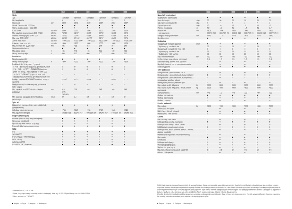 ATOS Silnik Typ Liczba cylindrów Pojemność Wtrysk Common-Rail (2000 bar) Wtórna obróbka spalin z DOC i EGR L. obr. znam. Moc przy l.obr. znamionowych (ECE R 120)1 Wartość homologacyjna (97/68 EG)2 Moc max. (ECE R 120)1 Zakres stałej mocy L.obr przy max. mom. obr. Max. moment obr. (ECE R 120)1 Wentylator wiskotyczny Max. zapas paliwa Okresy wymiany oleju 350 340 330 240 230 220 Farmotion 4 3849 ● ● 2200 76/103 76/103 80/109 1700-2200 1600 435 ● 145 600 Farmotion 4 3849 ● ● 2200 72/97 72/97 75/102 1700-2200 1600 405 ● 145 600 Farmotion 4 3849 ● ● 2200 62/84 62/84 65 / 88 1700-2200 1600 354 ● 145 600 Farmotion 3 2887 ● ● 2200 67/92 67/92 71/97 1800-2200 1600 371 ● 130 600 Farmotion 3 2887 ● ● 2200 62/84 62/84 65/88 1700-2200 1600 354 ● 130 600 Farmotion 3 2887 ● ● 2200 56/76 55/76 56/76 1700-2200 1500 341 ● 130 600 ● 1200 ● 1200 ● 1200 ● 1200 ● 1200 ● 1200 □ □ □ □ □ □ □ □ □ □ □ □ □ – – – – – □/□3 □/□ □/□ □/□ □/□ □/□ ○ ○ ○ ○ ○ ○ 418 (344 z TRISHIFT) 3,1 326 326 348 348 348 3,1 3,1 3,1 3,1 3,1 ● ● ● ● ● ● 1740 540/65 R 38 1740 600/65 R 34 1740 600/65 R 34 1640 540/65 R 34 1640 540/65 R 34 1640 540/65 R 30 Bezpieczeństwo jazdy Hamulec (wielotarczowy w kąpieli olejowej) Hamowana przednia oś Hydrauliczny układ hamulc. przyczepy Pneumat. układ hamulcowy przyczepy ● ○ ○ ● ● ○ ○ ● ● ○ ○ ● ● ○ ○ ● ● ○ ○ ● ● ○ ○ ● WOM 540 540/540 ECO 540/540 ECO i 1000/1000 ECO WOM zależny Automatyka WOM Czop WOM 1⅜", 6 rowków ● ○ ○ ○ ○ ● ● ○ ○ ○ ○ ● ● ○ ○ ○ ○ ● ● ○ ○ ○ ○ ● ● ○ ○ ○ ○ ● ● ○ ○ ○ ○ ● cm3 obr/min kW/KM kW/KM kW/KM obr/min obr/min Nm l h Przekładnia Napęd wszystkich kół Okresy wymiany oleju h Przekładnia 4-/ 5-biegowa z 2 grupami 8 P / 8 T bez redukcji biegu max. prędkość 40 km/h 216 / 20 P / 16 / 20 T z TWINSHIFT (dwustopn. przeł. pod obciąż.) max. prędkość 40 km/h ECO 30 P / 30 T z TRISHIFT (trzystopn. przeł. pod obciąż.) i REVERSHIFT max. prędkość 40 km/h ECO Przełącz. nawrotne REVERSHIFT / mechan. przełącz. nawrotne Biegi pełzające (2 dodatkowe grupy, podwojenie liczby biegów) Min. prędkość przy 2200 obr/min z biegiem m/h pełzającym Min. prędkość przy 2200 obr/min bez biegu pełzającego Tylna oś Blokada tyln. mechan. różnic. włącz. elektrohydr. (sprzęgło kłowe) Odległośc między kołnierzami Max. ogumienie tylnej osi km/h mm 1 Odpowiada ISO TR 14396 2 Dane dotyczące mocy miarodajne dla homologacji. Moc wg 97/68 EG jest identyczna do 2000/25/EG. 3 Nie z przekładnią TRISHIFT ●Seryjnie○Opcja□Dostępne–Niedostępne ATOS Napęd kół przedniej osi Uruchamianie elektroniczne Maks. kąt skrętu Kąt wyprz. sworznia zwrotn. Kąt wychylenia osi Promień zawracania Rozstaw kół przy ogumieniu Odległość między kołnierzami Błotniki uchylne Hydraulika Obieg otwarty hydrauliki 55 l/min Wydatek przy znamion. l. obr. Obieg otwarty hydrauliki 60 l/min ECO Wydatek przy znamion. l. obr. Wydatek przy 1600 obr/min Max. ciśnienie robocze Liczba mechan. zesp. sterow. (min./max.) Elektryczne zesp. sterow. (max. 25 l/min) Regulacja dawki do mech. zaworów sterowania Swobodny powrót Tylny podnośnik Dźwignie dolne i górna z hakami kat. 3 Dźwignie dolne i górna z końcówk. kulowymi kat. 2 Dźwignie dolne i górna z końcówk. kulowymi kat. 2 (przestawiane końcówki kulowe) Prawe jarzmo podnośn. przestaw. hydr. Max. udźwig w pkt. dołączania Max. udźwig w pkt. dołączania z dodatk. siłown. podnoszenia Skok podnośnika Obsługa mechaniczna Obsługa elektroniczna Obsługa z zewnątrz Przedni podnośnik Max. udźwig Amortyzacja wstrząsów Haki dźwigni dolnych kategorii Przedni WOM 1000 obr/min Kabina FOPS-szklany luk w dachu Fotel operatora amortyz. mechanicz. Fotel operatora amortyz. mech. szeroki Fotel kierowcy, amort. pneum. szeroki Fotel operatora, amort. pneumat. szeroki z automat. dpasow. wysokości Przestawiana i wysuwana kolumna kierownicy Ogrzewanie Klimatyzacja Fotel wprowadzającego Otwierana przednia szyba Wycieraczka tylnej szyby Max. licza reflektorów roboczych przód / tył Gniazdo 25-Amperów 350 340 330 240 230 220 ● 50 7 10 4,2 1806 360/70 R 28 1770 ● ● 50 7 10 4,2 1806 360/70 R 28 1770 ● ● 50 7 10 4,2 1806 360/70 R 28 1770 ● ● 50 7 10 4,2 1665 360/70 R 24 1610 ● ● 50 7 10 4,2 1665 360/70 R 24 1610 ● ● 50 7 10 3,7 1622 360/70 R 24 1610 ● ● 55 ○ 55 60 190 1-3 ○ ○ ● ● 55 ○ 55 60 190 1-3 ○ ○ ● ● 55 ○ 55 60 190 1-3 ○ ○ ● ● 55 ○ 55 60 190 1-3 ○ ○ ● ● 55 ○ 55 60 190 1-3 ○ ○ ● ● 55 ○ 55 60 190 1-3 ○ ○ ● ○ ● ○ ○ ● ○ ○ ● ○ ○ ● – ○ ● – ○ ● – ○ 3600 5500 ○ 3600 4900 ○ 3600 4900 ○ 3600 4600 ○ 3600 4600 ○ 3600 4600 mm 772 ● ○ ○ 772 ● ○ ○ 772 ● ○ ○ 720 ● ○ ○ 720 ● ○ ○ 720 ● ○ ○ kg 1900 ○ ● ○ 1900 ○ ● ○ 1900 ○ ● ○ 1900 ○ ● ○ 1900 ○ ● ○ 1900 ○ ● ○ ○ ● ○ ○ ○ ○ ● ○ ○ ○ ○ ● ○ ○ ○ ○ ● ○ ○ ○ ○ ● ○ ○ ○ ○ ● ○ ○ ○ ○ ● ○ ○ ○ ○ 4/4 ○ ○ ● ○ ○ ○ ○ 4/4 ○ ○ ● ○ ○ ○ ○ 4/4 ○ ○ ● ○ ○ ○ ○ 4/4 ○ ○ ● ○ ○ ○ ○ 4/4 ○ ○ ● ○ ○ ○ ○ 4/4 ○ stop stop stop m mm mm l/min bar kg kg CLAAS ciągle stara się dostosować swoje produkty do wymagań praktyki. Dlatego zastrzega sobie prawo dokonywania zmian. Dane techniczne i ilustracje należy traktować jako przybliżone i mogące obejmować elementy nienależące do wyposażenia seryjnego. Prospekt ten został wydrukowany do dystrybucji na całym świecie. Odnośnie wyposażenia technicznego i cennika prosimy kontaktować się ze swoim partnerem handlowym CLAAS Na zdjęciach zostały częściowo zdjęte osłony i elementy zabezpi