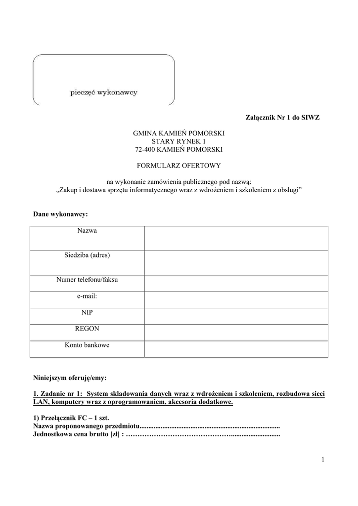 1 Załącznik Nr 1 do SIWZ GMINA KAMIEŃ POMORSKI STARY