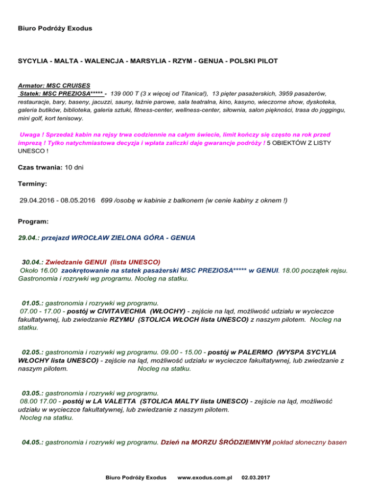 Biuro Podróży Exodus SYCYLIA - MALTA - WALENCJA - MARSYLIA - RZYM - GENUA - POLSKI PILOT Armator: MSC CRUISES Statek: MSC PREZIOSA***** - 139 000 T (3 x więcej od Titanica!), 13 pięter pasażerskich, 3959 pasażerów, restauracje, bary, baseny, jacuzzi, sauny, łaźnie parowe, sala teatralna, kino, kasyno, wieczorne show, dyskoteka, galeria butików, biblioteka, galeria sztuki, fitness-center, wellness-center, siłownia, salon piękności, trasa do joggingu, mini golf, kort tenisowy. POLSKI PILOT ! Uwaga ! Sprzedaż kabin na rejsy trwa codziennie na całym świecie, limit kończy się często na rok przed imprezą ! Tylko natychmiastowa decyzja i wpłata zaliczki daje gwarancje podróży ! 5 OBIEKTÓW Z LISTY UNESCO ! Czas trwania: 10 dni Terminy: 29.04.2016 - 08.05.2016 699 /osobę w kabinie z balkonem (w cenie kabiny z oknem !) Program: 29.04.: przejazd WROCŁAW ZIELONA GÓRA - GENUA 30.04.: Zwiedzanie GENUI (lista UNESCO) Około 16.00 zaokrętowanie na statek pasażerski MSC PREZIOSA***** w GENUI. 18.00 początek rejsu. Gastronomia i rozrywki wg programu. Nocleg na statku. 01.05.: gastronomia i rozrywki wg programu. 07.00 - 17.00 - postój w CIVITAVECHIA (WŁOCHY) - zejście na ląd, możliwość udziału w wycieczce fakultatywnej, lub zwiedzanie RZYMU (STOLICA WŁOCH lista UNESCO) z naszym pilotem. Nocleg na statku. 02.05.: gastronomia i rozrywki wg programu. 09.00 - 15.00 - postój w PALERMO (WYSPA SYCYLIA WŁOCHY lista UNESCO) - zejście na ląd, możliwość udziału w wycieczce fakultatywnej, lub zwiedzanie z naszym pilotem. Nocleg na statku. 03.05.: gastronomia i rozrywki wg programu. 08.00 17.00 - postój w LA VALETTA (STOLICA MALTY lista UNESCO) - zejście na ląd, możliwość udziału w wycieczce fakultatywnej, lub zwiedzanie z naszym pilotem. Nocleg na statku. 04.05.: gastronomia i rozrywki wg programu. Dzień na MORZU ŚRÓDZIEMNYM pokład słoneczny basen Biuro Podróży Exodus www.exodus.com.pl 02.03.2017 Nocleg na statku. 05.05.: gastronomia i rozrywki wg programu. 09.00 16.00 - postój w WALENCJI (HISZPANIA lista UNESCO) - zejście na ląd, możliwość udziału w wycieczce fakultatywnej, lub zwiedzanie z naszym pilotem.Nocleg na statku. 06.05.: gastronomia i rozrywki wg programu. 13.00 20.00 - postój w MARSYLII (FRANCJA) - zejście na ląd, możliwość udziału w wycieczce fakultatywnej, lub zwiedzanie z naszym pilotem.Nocleg na statku. 07.05.: gastronomia i rozrywki wg programu. 09.30 wyokrętowanie w GENUI. Przejazd do ZIELONEJ GÓRA i WROCŁAWIA. 08.05.: zakończenie imprezy w ZIELONEJ GÓRZE i WROCŁAWIU. W cenie: przejazd autokarem Wrosław - Zielona Góra - Genua i z powrotem noclegi: 7 nocy w kabinie 2-osob.z łaz/WC, bez okna. wyżywienie: 7 śniadań + 6 obiadów + 7 kolacji (plus wiele dodatkowych posiłków na statku) cocktail kapitański (obowiązuje strój wieczorowy) pilot BP Exodus z Zielonej Góry ubezpieczenie NW, KL, bagaż podatek VAT Dodatkowe opłaty: napiwki obligatoryjne na statku - około 8,5 /dzień. opłaty portowe - 120 wycieczki fakultatywne armatora lub polskiego pilota Uwaga: Podana cena dotyczy osoby w kabinie 2-osobowej z oknem i jest najniższą dostępną na dany rejs. Ceny różnicują się w zależności od kategorii kabiny, jak również pokładu, na którym znajduje się dana kabina. Ceny ulegają zmianie w zależności od dostępności kabin, bo najszybciej wykupywane są kabiny najtańsze! Statek oferuje całą gamę wycieczek fakultatywnych na każdy dzień postoju w portach. Pilot organizuje również, na życzenie uczestników, tańsze wyjazdy zbiorowe autokarami lub taksówkami z podobnym programem jak wycieczki fakultatywne. Wymagany jest paszport ważny w terminie min. do pół roku od dnia zakończenia rejsu. Biuro Podróży Exodus www.exodus.com.pl 02.03.2017