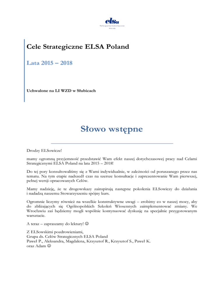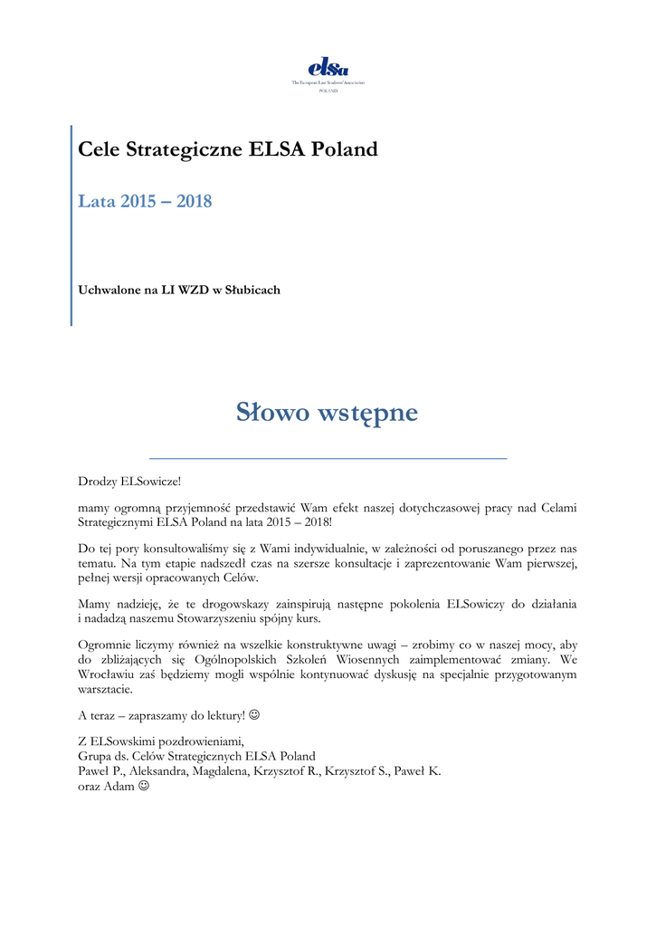 Cele Strategiczne ELSA Poland Lata 2015 – 2018 Uchwalone na LI WZD w Słubicach Słowo wstępne Drodzy ELSowicze! mamy ogromną przyjemność przedstawić Wam efekt naszej dotychczasowej pracy nad Celami Strategicznymi ELSA Poland na lata 2015 – 2018! Do tej pory konsultowaliśmy się z Wami indywidualnie, w zależności od poruszanego przez nas tematu. Na tym etapie nadszedł czas na szersze konsultacje i zaprezentowanie Wam pierwszej, pełnej wersji opracowanych Celów. Mamy nadzieję, że te drogowskazy zainspirują następne pokolenia ELSowiczy do działania i nadadzą naszemu Stowarzyszeniu spójny kurs. Ogromnie liczymy również na wszelkie konstruktywne uwagi – zrobimy co w naszej mocy, aby do zbliżających się Ogólnopolskich Szkoleń Wiosennych zaimplementować zmiany. We Wrocławiu zaś będziemy mogli wspólnie kontynuować dyskusję na specjalnie przygotowanym warsztacie. A teraz – zapraszamy do lektury! Z ELSowskimi pozdrowieniami, Grupa ds. Celów Strategicznych ELSA Poland Paweł P., Aleksandra, Magdalena, Krzysztof R., Krzysztof S., Paweł K. oraz Adam Jaka jest idea Celów Strategicznych ELSA Poland? Idea opracowania Celów Strategicznych była jednym z głównych założeń, które w programie wyborczym kandydaci do Zarządu Krajowego ELSA Poland zaprezentowali niemal rok temu w Serwach. Od tego czasu prace nad nimi trwały nieustannie, a rozpoczęły się od powołania wyżej podpisanej Grupy. Jednym z pierwszych zagadnień, którymi się zajęliśmy, była decyzja o charakterze Celów – mają być drogowskazem, czy też pozostawać zgodnymi z analizą SMART? Po wielu konsultacjach i dyskusjach, opierając się na efektywności obowiązujących Strategic Goals z poziomu międzynarodowego, jednogłośnie zdecydowaliśmy się na pierwszą formę. Analizując poniższe efekty naszej pracy, miejcie na uwadze jedno – Cele Strategiczne mają wskazać kierunek działania naszego Stowarzyszenia na najbliższe trzy lata. Stanowią swoisty program, na którym swoje plany opierać ma cała Sieć. Dzięki temu uzyskamy, po tylu latach, spójność działań na przestrzeni dłuższej niż jeden rok. Jednocześnie zaznaczamy, iż obok poniższego dokumentu od dnia dzisiejszego rozpoczynamy prace nad jego aneksem. Będzie to zbiór dobrych praktyk, które ELSowicze wykorzystać mogą w trakcie realizowania Celów – nie tylko na poziomie lokalnym i krajowym, lecz również międzynarodowym. Aspekt międzynarodowy Komentarz: Od dłuższego czasu borykamy się z zanikaniem lub niedostrzeganiem możliwości płynących z rozwoju i implementacji aspektu międzynarodowego do naszego stowarzyszenia. Aspekt ten można rozumieć dwojako. Po pierwsze, możemy mówić o aspekcie międzynarodowym w działalności całej Grupy Narodowej poprzez organizację projektów międzynarodowych lub rozwijanie współpracy w ramach Study Visit. Aspekt międzynarodowy znajduje jednak największe odzwierciedlenie w umożliwianiu Członkom naszego Stowarzyszenia rozwoju, poprzez udział w wydarzeniach o randze międzynarodowej. Jest to jedna z najbardziej rozpoznawalnych cech ELSA, a jednak w naszych regulacjach brakuje elementów umożliwiających dostosowanie i wykorzystanie tej szansy dla dobra ciężko pracujących CzłonCzłonków. Dlatego właśnie tak ważne jest by ELSA Poland w swoich działaniach skupiło wysiłki na rozwoju aspektu międzynarodowego we wszelkich aspektach swojej działalności. Jednocześnie przy rozważaniu możliwych rozwiązań, rozwój i przede wszystkim możliwość korzystania z aspektu międzynarodowego ELSA przez CzłonCzłonków Stowarzyszenia powinny być dobrami najwyższej rangi. 1. ELSA Poland rozwinie system kształtowania świadomości swoich Członków o międzynarodowych możliwościach oferowanych przez Członkostwo w Stowarzyszeniu. Wprowadzenie do podstawowych szkoleń informacji z zakresu aspektu międzynarodowego; przesyłanie informacji o możliwych opcjach angażowania się w projekty międzynarodowe poprzez zwyczajowe kanały informacyjne Grup Lokalnych; zapraszanie trenerów z innych Grup Narodowych, Zarządu Międzynarodowego. 2. ELSA Poland wprowadzi w swoich działaniach rozwiązania mogące umożliwić Członkom Stowarzyszenia udział w aspekcie międzynarodowym. Utworzenie systemu wsparcia finansowego mogącego gwarantować pomoc dla Członków Stowarzyszenia chcących brać udział w wydarzeniach na poziomie międzynarodowym. 3. ELSA Poland skupi się na umacnianiu pozycji międzynarodowej poprzez organizację rozpoznawalnych projektów międzynarodowych. Jednocześnie więcej uwagi zwróci się na organizację projektów typu Study Visit i Institutional Visit. Zachęcanie Grup Lokalnych do rozwoju swojej działalności poprzez organizację międzynarodowych projektów; zachęcanie Grup Lokalnych do wspólnego działania nad organizacją projektów międzynarodowych; stały nadzór nad postępami prac komitetu organizacyjnego, zwłaszcza w aspekcie marketingowym; rozwijanie długofalowych porozumień z miastami partnerskimi. 4. ELSA Poland powróci do korzeni pomysłu Międzynarodowego Programu Wymiany Praktyk Studenckich i ograniczy możliwość udziału w tym programie jedynie do Członków Stowarzyszenia. Zwiększanie świadomości Członków Stowarzyszenia na temat możliwości udziału w programie; utworzenie możliwości finansowej pomocy dla Członków Stowarzyszenia zainteresowanych rozwojem poprzez poznawanie obcych kultur prawnych; rozwój działalności STEP jako działki przygotowującej CCzłonków Stowarzyszenia do odbycia praktyki międzynarodowej. Struktura wewnętrzna ELSA Poland Komentarz: ELSA Poland powinno poświęcić większą dozę uwagi na usprawnienie funkcjonowania swojej struktury wewnętrznej. Skuteczna komunikacja i efektywne zarządzanie wiedzą wewnątrz Stowarzyszenia są czynnikami niezbędnymi do rozwoju. Należy również dołożyć wszelkich starań, aby pozyskiwane w ramach działalności Stowarz