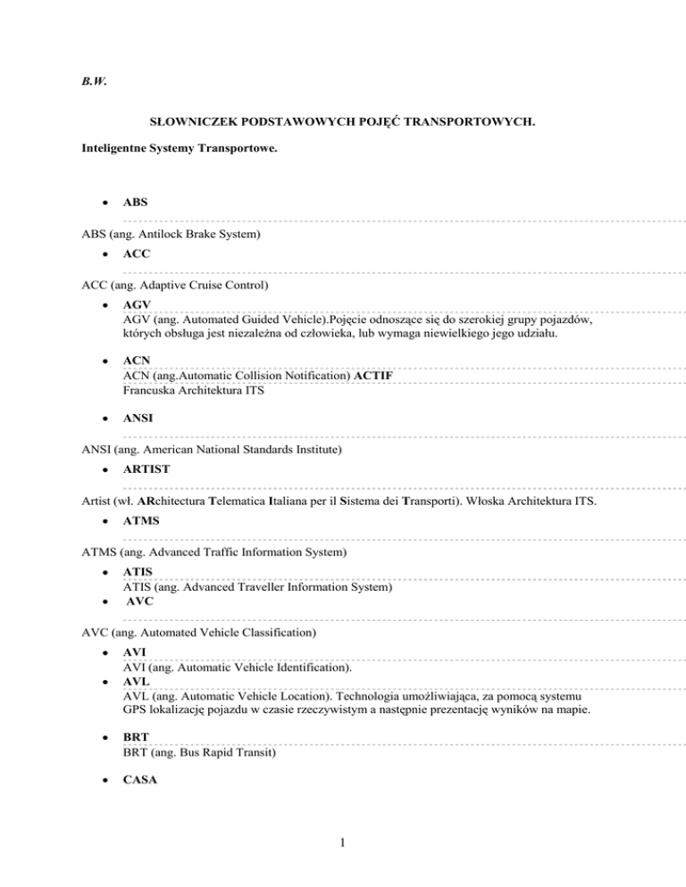 B.W. SŁOWNICZEK PODSTAWOWYCH POJĘĆ TRANSPORTOWYCH. Inteligentne Systemy Transportowe. ABS ABS (ang. Antilock Brake System) ACC ACC (ang. Adaptive Cruise Control) AGV AGV (ang. Automated Guided Vehicle).Pojęcie odnoszące się do szerokiej grupy pojazdów, których obsługa jest niezależna od człowieka, lub wymaga niewielkiego jego udziału. ACN ACN (ang.Automatic Collision Notification) ACTIF Francuska Architektura ITS ANSI ANSI (ang. American National Standards Institute) ARTIST Artist (wł. ARchitectura Telematica Italiana per il Sistema dei Transporti). Włoska Architektura ITS. ATMS ATMS (ang. Advanced Traffic Information System) ATIS ATIS (ang. Advanced Traveller Information System) AVC AVC (ang. Automated Vehicle Classification) AVI AVI (ang. Automatic Vehicle Identification). AVL AVL (ang. Automatic Vehicle Location). Technologia umożliwiająca, za pomocą systemu GPS lokalizację pojazdu w czasie rzeczywistym a następnie prezentację wyników na mapie. BRT BRT (ang. Bus Rapid Transit) CASA 1 CASA (ang. Crash Avoidance System) CCTV CCTV (ang. Closed Circuit Television) COOPERS COOPERS (ang. CO-OPerative SystEms for Intelligent Road Safety). Projekt Europejski, którego prace skupiają się na rozwoju innowacyjnych technologii telematycznych pozwalających na bezprzewodową wymianę danych między pojazdami oraz pojazdem a infrastrukturą (V2I). Zobacz SAFESPOT i CVIS. CPR Centrum Powiadamiania Ratunkowego. CVIS CVIS (ang. Commercial Vehicle Information System) CVO CVO (ang. Commercial Vehicle Operations) DAB DAB (Digital Audio Broadcast) DMS DMS (ang. Dynamic Message Sign) DSRC DSRC (ang. Dedicated Short Range Communications) E112 E112 (ang. Enhanced 112). E911 E911 (ang. Enhanced 911) eCall eCall (ang. Pan-European Emergency Call System). System automatycznego powiadamiania o wypadkach drogowych. Jego działanie polega na automatycznym lub manualnym powiadomieniu służb ratunkowych o zdarzeniu. FRAME FRAME (ang. FRamework Architecture Made for Europe) GPS GPS (ang. Global Positioning System) GALILEO Europejski system nawigacji satelitarnej 2 MDS MDS (ang. Minimum Data Set) MNO MNO (ang. Mobile Network Operator) MVkm MVkm (ang. Million Vehicle Kilometres) PSAP PSAP (ang. Public Safety Answering Point), inaczej Centrum Powiadamiania Ratunkowego (CPR) RDS RDS (ang. Radio Data System) RDS-TMC RDS-TMC (ang. Radio Data System – Traffic Message Channel) RFID RFID (ang. Radio Frequency Identification) RTMS RTMS (ang. Regional Traffic Management System) RTMS RTMS(ang. Remote Traffic Microwave Sensor) TPEG TPEG (ang. Transport Protocol Experts Group) TIMS TIMS (ang. Transportation Information Management System) TMC TMC (ang. Traffic Message Channel) TMC TMC (ang. Traffic Management Centre) TIA TIA (ang.Telecommunications Industry Association), TEMPO Trans European Intelligent Transport Systems Projects UMTS UMTS (ang. Universal Mobile Telecommunication Service) VRC VRC (ang. Vehicle to Roadside Communication) VMS VMS (ang. Variable Message Sign) 3 VIN VIN (ang. Vehicle Identification Number) VERTIS ITS Japan V2I V2I (Vehicle to Infrastructure) WLAN WLAN (ang. Wireless Lan). Sieć bezprzewodowa. WIMAX WIMAX (ang. Worldwide Interoperability for Microwave Access). WiMax jest technologią bezprzewodową, opartą na standardach IEEE 802.16 i ETSI HiperMAN WI-FI WI-FI (ang. Wireless Fidelity) WAVE WAVE (ang. Wireless Access in Vehicular Environments) Standard bezprzewodowej wymiany informacji pomiędzy pojazdami. Znany także jako 802.11p. XML XML (ang. Extensible Markup Language) 4