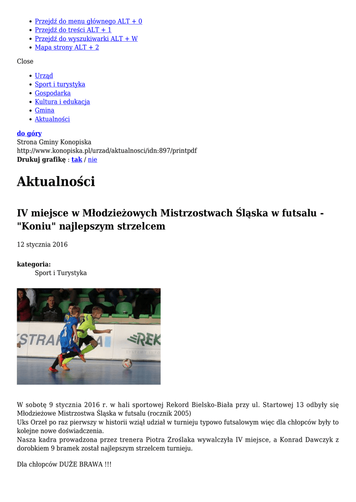 Przejdź do menu głównego ALT + 0 Przejdź do treści ALT + 1 Przejdź do wyszukiwarki ALT + W Mapa strony ALT + 2 Close Urząd Sport i turystyka Gospodarka Kultura i edukacja Gmina Aktualności do góry Strona Gminy Konopiska http://www.konopiska.pl/urzad/aktualnosci/idn:897/printpdf Drukuj grafikę : tak / nie Aktualności IV miejsce w Młodzieżowych Mistrzostwach Śląska w futsalu "Koniu" najlepszym strzelcem 12 stycznia 2016 kategoria: Sport i Turystyka W sobotę 9 stycznia 2016 r. w hali sportowej Rekord Bielsko-Biała przy ul. Startowej 13 odbyły się Młodzieżowe Mistrzostwa Śląska w futsalu (rocznik 2005) Uks Orzeł po raz pierwszy w historii wziął udział w turnieju typowo futsalowym więc dla chłopców były to kolejne nowe doświadczenia. Nasza kadra prowadzona przez trenera Piotra Zroślaka wywalczyła IV miejsce, a Konrad Dawczyk z dorobkiem 9 bramek został najlepszym strzelcem turnieju. Dla chłopców DUŻE BRAWA !!! Komplet wyników naszego zespołu w poszczególnych meczach: Grupa A: UKS Orzeł Konopiska, TS United Żywiec, UKS Milenium Gliwice, Rekord Bielsko-Biała Grupa B: Marex Chorzów, Lukam Skoczów, Gwiazda Ruda Śląska, MOSiR Jastrzębie-Zdrój Każde ze spotkań trwało 2x6 minut efektywnego czasu gry Grupa A: Orzeł - United 3:1 (2:1) - Dawczyk Konrad x 3 Milenium - Rekord 2:2 (0:0) Orzeł -Milenium 6:1 (2:0) - Dawczyk Konrad x 4,Barnat Jkaub x 1,Wachowicz Kamil x1 United - Rekord 1:4 (1:2) United - Milenium 3:0 (1:0) Orzeł - Rekord 2:0 (0:0) - Dawczyk Konrad x 1,Iłczyk Filip x 1 Grupa B: Marex - Lukam 3:0 (1:0) Gwiazda – MOSiR 1:0 (1:0) Marex - Gwiazda 2:2 (0:0) Lukam - MOSiR 0:4 (0:2) Lukam - Gwiazda 1:3 (0:1) Marex - MOSiR 4:3 (1:1) 1A-2B: Orzeł Konopiska - Gwiazda Ruda Śląska 0:3 (0:2) 1B-2A: Marex Chorzów - Rekord Bielsko-Biała 2:1 (1:0) o 7. miejsce: Millenium Gliwice - Lukam Skoczów 1:1 (1:0) rzuty kane 3 - 4 o 5. miejsce: United Żywiec - MOSiR Jastrzębie-Zdrój 0:2 (0:2) o 3. miejsce: Orzeł Konopiska - Rekord Bielsko-Biała 3:5 (2:2) - Dawczyk Konrad x 1,Barnat Jakub x 2 17:00 finał: Gwiazda Ruda Śl. - Marex Chorzów 8:3 (3:2) Klasyfikacja końcowa: I miejsce: Gwiazda Ruda Śląska II miejsce: Marex Chorzów III miejsce: Rekord Bielsko-Biała IV miejsce: Orzeł Konopiska V miejsce: MOSiR Jastrzębie-Zdrój VI miejsce: United Żywiec VII miejsce: Lukam Skoczów VIII miejsce: Millenium Gliwice Wyróżnienia indywidualne: Najlepszy bramkarz: Szymon Bąk (Gwiazda Ruda Śląska) Najlepszy zawodnik: Jarosław Zelcer (Marex Chorzów) Najlepszy strzelec: Konrad Dawczyk (Orzeł Konopiska) - 9 goli powrót do listy aktualności następna porzednia
