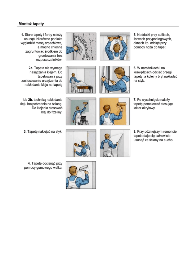 MontaŜ tapety 1. Stare tapety i farby naleŜy usunąć. Nierówne podłoŜa wygładzić masą szpachlową, a mocno chłonne zagruntować środkiem do gruntowania bez rozpuszczalników. 5. Naddatki przy sufitach, listwach przypodłogowych, oknach itp. odciąć przy pomocy noŜa do tapet. 2a. Tapeta nie wymaga nasączania klejem. Do tapetowania przy zastosowaniu urządzenia do nakładania kleju na tapetę 6. W naroŜnikach i na krawędziach odciąć brzegi tapety, a kolejny bryt nakładać na styk. lub 2b. techniką nakładania kleju bezpośrednio na ścianę. Do klejenia stosować klej do fizeliny. 3. Tapetę naklejać na styk. 4. Tapetę docisnąć przy pomocy gumowego walka. 7. Po wyschnięciu naleŜy tapetę pomalować stosując lakier akrylowy. 8. Przy późniejszym remoncie tapeta daje się całkowicie usunąć ze ściany na sucho.