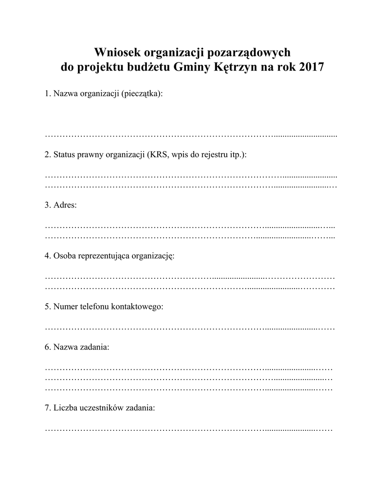 Wniosek organizacji pozarządowych do projektu budżetu Gminy Kętrzyn na rok 2017 1. Nazwa organizacji (pieczątka): ……………………………………………………………………............................. 2. Status prawny organizacji (KRS, wpis do rejestru itp.): ………………………………………………………………………......................... …………………………………………………………………….........................… 3. Adres: ………………………………………………………………….........................…... ……………………………………………………………….........................……... 4. Osoba reprezentująca organizację: …………………………………………………........................…………………… ……………………………………………………………........................………… 5. Numer telefonu kontaktowego: …………………………………………………………………........................…… 6. Nazwa zadania: ………………………………………………………………….......................…… …………………………………………………………………….......................… ………………………………………………………………….......................…… 7. Liczba uczestników zadania: ………………………………………………………………….......................…… 8. Całkowity koszt zadania: ……………………………………………………………...........................………... 9. Kwota dotacji: ……….………………………………………………………...........................…….. 10. Dział budżetu Gminy Kętrzyn z którego będzie realizowane zadanie 1/. * Ochrona zdrowia - prowadzenie stacji socjalnej; - pierwsza pomoc przedmedyczna – edukacja dzieci i młodzieży; - popularyzacja ochrony zdrowia. * Edukacyjna opieka wychowawcza - wypoczynek letni i zimowy dzieci i młodzieży. * Gospodarka komunalna i ochrona środowiska - opieka nad zwierzętami. * Kultura i ochrona dziedzictwa narodowego - organizacja dni pamięci, koncertów, jarmarków, festiwali, festynów, konkursów, wystaw; - wspomnienia, sympozja, wieczornice. * Kultura fizyczna i sport - badminton, bilard, boks, hokej i unihokej, kolarstwo, koszykówka, lekkoatletyka, piłka nożna, piłka ręczna, pływanie, podnoszenie ciężarów, siatkówka, szachy, taekwondo i samoobrona, taniec sportowy, tenis stołowy i ziemny, trójbój siłowy, zapasy, żeglarstwo. * Przeciwdziałanie alkoholizmowi i uzależnieniom - prowadzenie środowiskowych świetlic opiekuńczo – wychowawczych; - warsztaty i treningi terapeutyczne dla osób uzależnionych, współuzależnionych oraz młodzieży podejmowanych w zakresie działań związanych z przeciwdziałaniem alkoholizmowi; - warsztaty i treningi terapeutyczne dla osób uzależnionych, współuzależnionych oraz młodzieży podejmowanych w zakresie działań związanych z przeciwdziałaniem narkomanii; - organizacja wypoczynku letniego dla dzieci i młodzieży z rodzin patologicznych połączonego z profilaktyką; - zagospodarowanie czasu wolnego dzieci i młodzieży – zajęcia pozalekcyjne. * Pomoc społeczna – udzielanie porad prawnych dla najuboższych mieszkańców Gminy Kętrzyn znajdujących się w trudnej sytuacji życiowej, które samodzielnie nie są w stanie rozwiązać zaistniałych problemów. * Bezpieczeństwo publiczne i ochrona przeciwpożarowa * Inne…………………………………………………………………………………………… * Właściwe podkreślić 11. Informacje dodatkowe ……….…………………………………………………………….. (Wniosek nie jest ofertą , jedynie informacją o planach danej organizacji) .