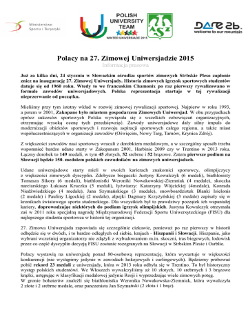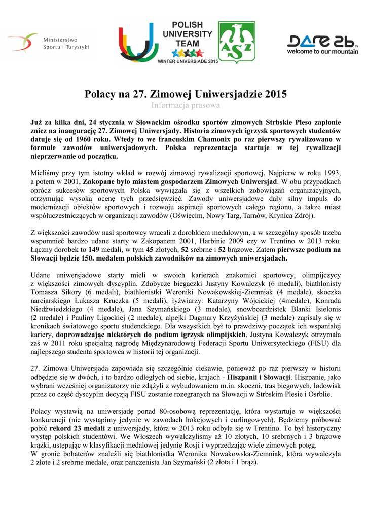Polacy na 27. Zimowej Uniwersjadzie 2015 Informacja prasowa Już za kilka dni, 24 stycznia w Słowackim ośrodku sportów zimowych Strbskie Pleso zapłonie znicz na inaugurację 27. Zimowej Uniwersjady. Historia zimowych igrzysk sportowych studentów datuje się od 1960 roku. Wtedy to we francuskim Chamonix po raz pierwszy rywalizowano w formule zawodów uniwersjadowych. Polska reprezentacja startuje w tej rywalizacji nieprzerwanie od początku. Mieliśmy przy tym istotny wkład w rozwój zimowej rywalizacji sportowej. Najpierw w roku 1993, a potem w 2001, Zakopane było miastem gospodarzem Zimowych Uniwersjad. W obu przypadkach oprócz sukcesów sportowych Polska wywiązała się z wszelkich zobowiązań organizacyjnych, otrzymując wysoką ocenę tych przedsięwzięć. Zawody uniwersjadowe dały silny impuls do modernizacji obiektów sportowych i rozwoju aspiracji sportowych całego regionu, a także miast współuczestniczących w organizacji zawodów (Oświęcim, Nowy Targ, Tarnów, Krynica Zdrój). Z większości zawodów nasi sportowcy wracali z dorobkiem medalowym, a w szczególny sposób trzeba wspomnieć bardzo udane starty w Zakopanem 2001, Harbinie 2009 czy w Trentino w 2013 roku. Łączny dorobek to 149 medali, w tym 45 złotych, 52 srebrne i 52 brązowe. Zatem pierwsze podium na Słowacji będzie 150. medalem polskich zawodników na zimowych uniwersjadach. Udane uniwersjadowe starty mieli w swoich karierach znakomici sportowcy, olimpijczycy z większości zimowych dyscyplin. Zdobycze biegaczki Justyny Kowalczyk (6 medali), biathlonisty Tomasza Sikory (6 medali), biathlonistki Weroniki Nowakowskiej-Ziemniak (4 medale), skoczka narciarskiego Łukasza Kruczka (5 medali), łyżwiarzy: Katarzyny Wójcickiej (4medale), Konrada Niedźwiedzkiego (4 medale), Jana Szymańskiego (3 medale), snowboardzistek Blanki Isielonis (2 medale) i Pauliny Ligockiej (2 medale), alpejki Dagmary Krzyżyńskiej (3 medale) zapisały się w kronikach światowego sportu studenckiego. Dla wszystkich był to prawdziwy początek ich wspaniałej kariery, doprowadzając niektórych do podium igrzysk olimpijskich. Justyna Kowalczyk otrzymała zaś w 2011 roku specjalną nagrodę Międzynarodowej Federacji Sportu Uniwersyteckiego (FISU) dla najlepszego studenta sportowca w historii tej organizacji. 27. Zimowa Uniwersjada zapowiada się szczególnie ciekawie, ponieważ po raz pierwszy w historii odbędzie się w dwóch, i to bardzo odległych od siebie, krajach - Hiszpanii i Słowacji. Hiszpanie, jako wybrani wcześniej organizatorzy nie zdążyli z wybudowaniem m.in. skoczni, tras biegowych, lodowisk przez co część dyscyplin decyzją FISU zostanie rozegranych na Słowacji w Strbskim Plesie i Osrblie. Polacy wystawią na uniwersjadę ponad 80-osobową reprezentację, która wystartuje w większości konkurencji (nie wystąpimy jedynie w zawodach hokejowych i curlingowych). Będziemy próbować pobić rekord 23 medali z uniwersjady, która w 2013 roku odbyła się w Trentino. To był historyczny występ polskich studentówi. We Włoszech wywalczyliśmy aż 10 złotych, 10 srebrnych i 3 brązowe krążki, ustępując w klasyfikacji medalowej jedynie Rosji i wyprzedzając wiele zimowych potęg. W gronie bohaterów znaleźli się biathlonistka Weronika Nowakowska-Ziemniak, która wywalczyła 2 złote i 2 srebrne medale, oraz panczenista Jan Szymański (2 złota i 1 brąz). Obydwoje nie wystartują tym razem, ale zgodzili się zostać ambasadorami akademickiej reprezentacji Polski i będą ją wspierać dobrym słowem i radą. Ambasadorami polskiej reprezentacji zostali także Tomasz Sikora i Luiza Złotkowska. Nasi sportowcy będą nosić odzież marki Dare2B – głównego sponsora akademickiej reprezentacji Polski. Sprzęt Dare2b wyróżnia się dopracowanym krojem, materiałami o wysokich parametrach i odważnym, nowoczesnym wzornictwem. Dare2b tworzy odzież z myślą głównie o miłośnikach sportów zimowych, snowboardzistach, narciarzach, sportowcach ekstremalnych, ale także dla tych, którzy aktywnie spędzają wolny czas oraz cenią sobie wygodny i nowoczesny strój. Udział akademickiej reprezentacji Polski w Zimowej Uniwersjadzie 2015 jest dofinansowany ze środków Funduszu Rozwoju Kultury Fizycznej. Akademicka reprezentacja Polski 2015 w skrócie Biathlon: w składzie m.in. olimpijczyk Łukasz Słonina (AZS AWF Wrocław) i uczestniczka ME, Patrycja Hojnisz (AZS AWF Katowice). Narciarstwo klasyczne: w składzie ekipy trenera Janusza Krężeloka znaleźli się m.in. olimpijczyk z Soczi, Maciej Staręga (kilka dni temu siódmy podczas zawodów Tour de Ski w sprincie) oraz uczestnicy poprzedniej uniwersjady, Jan Antolec i Marcela Marcisz-Niemczycka. Skoki: w składzie ekipy są m.in. Jakub Kot, medalista uniwersjady z Erzurum 2011, a także po raz pierwszy w polskiej reprezentacji zawodniczka Magdalena Pałasz. Kombinacja norweska: kadrę tworzą najlepsi polscy kombinatorzy Adam Cieślar, Szczepan Kupczak, Paweł Słowiok i Mateusz Wantulok, którzy na zawodach uniwersjadowych w Trentino 2013 zdobyli trzy medale. Narciarstwo alpejskie: w składzie mamy medalistki poprzedniej uniwersjady: Marynę GąsienicęDaniel oraz olimpijkę z Soczi, Karolinę Chrapek, a także jej brata Adama. Bardzo liczymy na specjalistów od narciarstwa freestylowego, Mateusza Habrata, który będzie bronił złotego medalu i Szczepana Karpiela, który zdobył srebro. W łyżwiarstwie figurowym Polskę reprezentował będzie solista Kamil Dymowski, mistrz Polski z 2013 roku. W short tracku wystartujemy w pełnej obsadzie najlepszych łyżwiarzy studentów, wśród nich uczestniczka Pucharu Świata, Marta Wójcik. Najliczniejsza będzie ekipa snowboardu. Nasi reprezentanci wystartują we wszystkich przewidzianych programem konkurencjach. W składzie mamy m.in. medalistów poprzednich uniwersjad: Zuzannę Smykałę i Marcina Bociana, a także czołowych snowboardzistów Polski: Aleksandrę Król, Weronikę Bielę, Karolinę Szto