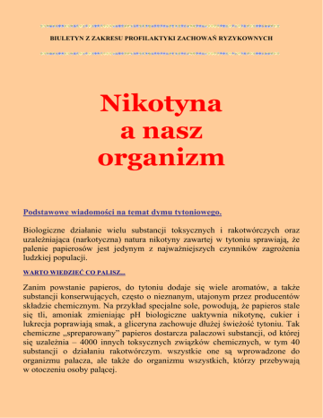 BIULETYN Z ZAKRESU PROFILAKTYKI ZACHOWAŃ RYZYKOWNYCH Nikotyna a nasz organizm Podstawowe wiadomości na temat dymu tytoniowego. Biologiczne działanie wielu substancji toksycznych i rakotwórczych oraz uzależniająca (narkotyczna) natura nikotyny zawartej w tytoniu sprawiają, że palenie papierosów jest jedynym z najważniejszych czynników zagrożenia ludzkiej populacji. WARTO WIEDZIEĆ CO PALISZ... Zanim powstanie papieros, do tytoniu dodaje się wiele aromatów, a także substancji konserwujących, często o nieznanym, utajonym przez producentów składzie chemicznym. Na przykład specjalne sole, powodują, że papieros stale się tli, amoniak zmieniając pH biologiczne uaktywnia nikotynę, cukier i lukrecja poprawiają smak, a gliceryna zachowuje dłużej świeżość tytoniu. Tak chemiczne „spreparowany” papieros dostarcza palaczowi substancji, od której się uzależnia – 4000 innych toksycznych związków chemicznych, w tym 40 substancji o działaniu rakotwórczym. wszystkie one są wprowadzone do organizmu palacza, ale także do organizmu wszystkich, którzy przebywają w otoczeniu osoby palącej. FAKTY DOTYCZĄCE PALENIA TYTONIU. Prawie wszyscy, którzy palą, przyznają się, że próbowali rzucić palenie i ponieśli porażkę! Co najmniej połowa z nich utrzymuje ponadto, że zamierza to uczynić w ciągu najbliższego roku. Problem polega na tym, że im dłużej palą, tym trudniej im z tego zrezygnować – na tym właśnie polega mechanizm uzależnienia. Papierosy są często pierwszą używką stosowaną przez nastolatków, którzy później zaczynają używać alkoholu lub narkotyków. Badania wykazują, że osobom, które nigdy nie paliły, rzadko zdarza się używać narkotyków. Prawie każdy, kto zaczyna używać alkoholu, wcześniej palił papierosy. Potwierdzają to badania międzynarodowe. Fizyczne szkody wynikłe z palenia papierosów pojawiają się dość wcześnie – nawet przed upływem roku. Palacze więcej kaszlą i trudniej im oddychać, ich płuca są uszkodzone i mają mniejszą pojemność, mają słabsze serce, częściej chorują. Co więcej, im wcześniej młody człowiek zaczyna palić, tym wcześniej w wieku dorosłym narażony będzie na chorobę nowotworową lub chorobę serca. Papierosy są przyczyną różnych schorzeń m.in.: chorób serca, nowotworów płuc, udarów mózgu, nowotworów gardła, chronicznych chorób płuc (zapalenie oskrzeli, rozedmy płuc), nowotworów jamy ustnej, nowotworów trzustki, nowotworów pęcherza moczowego. Kobiety palące w ciąży, zwiększają ryzyko przedwczesnego porodu, poronienia i urodzenia martwego płodu. DRUGA STRONA MEDALU RZUCENIA PALENIA. – KORZYŚCI WYNIKAJĄCE Z w ciągu 20 minut ciśnienie tętnicze krwi powraca do normy, czynność serca normalizuje się w ciągu 8 godzin poziom tlenku węgla we krwi zmniejsza się, poziom tlenu we krwi podwyższa się w ciągu 24 godzin zmniejsza się ryzyko zawału serca w ciągu 48 godzin rozpoczyna się regeneracja zakończeń nerwowych, powraca do normy funkcjonowanie zmysłu zapachu i smaku od 2 tygodni do 3 stan układu krążenia ulega poprawie, zwiększa się miesięcy wydolność fizyczna organizmu, czynność płuc poprawia się o 30% od 1 do miesięcy 9 kaszel, uczucie niedrożności nosa, duszności i zmęczenie ulegają zmniejszeniu, rozpoczyna się regeneracja rzęsek, które pomagają oczyścić oskrzela i chronią przed infekcjami, wzrasta poziom energii całego organizmu po roku o połowę zmniejsza się ryzyko zachorowania na chorobę niedokrwienną serca po 5 latach o połowę zmniejsza się ryzyko zachorowania na raka płuc, na raka jamy ustnej, krtani i przełyku po 10 latach ryzyko zachorowania na raka płuc jest podobne, jak u osoby nigdy nie palącej, komórki przednowotworowe, które powstały w wyniku palenia tytoniu zostają zastąpione przez komórki o prawidłowej budowie, ryzyko zachorowania na raka nadal się zmniejsza po 15 latach ryzyko zachorowania na chorobę niedokrwienną serca jest podobne, jak u osoby nigdy nie palącej KAŻDY PAPIEROS NISZCZY TWOJE ZDROWIE, ZAGROŻENIE DOTYCZY NAS WSZYSTKICH. Papieros jest jedynym produktem, którego używanie zgodnie z jego przeznaczeniem powoduje przedwczesną śmierć. Tytoń jest substancją mocno uzależniającą, a papierosy to nie tylko trochę liści tytoniu zawiniętych w papierek, ale przede wszystkim wysoko wyspecjalizowany produkt prowadzący do uzależnienia palacza. Palenie wywołuje więcej kończących się przedwczesną śmiercią chorób niż AIDS. Amerykanie wyliczyli, że co 8 sekund jedna osoba umiera na choroby spowodowane paleniem papierosów i równie szybko kolejna ofiara zostaje wciągnięta w nałóg. Do roku 2020 wzrośnie do 10 milionów rocznie liczba zgonów, którym można by zapobiec. Z POWODU UŻYWANIA TYTONIU: rocznie umiera na świecie około 4 023 000 osób, w Europie – jest około 1200 000 zgonów, co godzinie w Europie z powodu palenia tytoniu umiera 140 osób, w Polsce co godzinę z powodu palenia tytoniu umiera 9 osób, rocznie wynosi to około 82 000 niepotrzebnych zgonów. DLACZEGO RZUCENIE PALENIA JEST TAKIE TRUDNE? 1. Nawet osobom, które mają silną motywację, trudno jest zerwać z paleniem, ponieważ zawarta w tytoniu nikotyna mocno uzależnia. 2. Palenie jest czynnością nawykową. Oprócz tego, że palacze są uzależnieni od nikotyny, często mają swój utarty, wielokrotnie powtarzany nawyk postępowania. 3. Palenie jest nieodłącznym elementem życia codziennego. Potwierdza to fakt, iż przemysł tytoniowy wydaje rocznie prawie 6 000 000 000 (sześć miliardów)dolarów na kampanię reklamową papierosów. 4. Wybory tytoniowe są sprzedawane legalnie i niemal wszędzie dostępne. Większość z nas jest stale narażona na kontakt z jakimś palaczem. Od tych wpływów nie sposób się odizolować. TEST UZALEŻNIENIA OD NIKOTYNY wg Fagerstroma Dla osób palących papierosy pytanie 1. Jak szybko po przebudzeniu zapalasz pi
