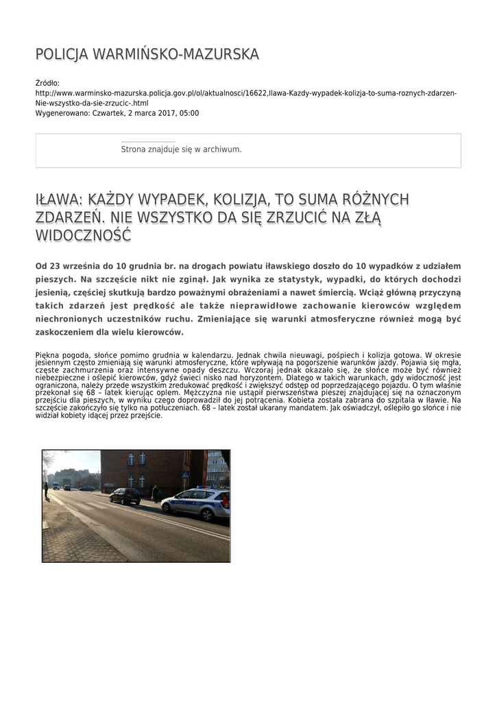 POLICJA WARMIŃSKO-MAZURSKA Źródło: http://www.warminsko-mazurska.policja.gov.pl/ol/aktualnosci/16622,Ilawa-Kazdy-wypadek-kolizja-to-suma-roznych-zdarzenNie-wszystko-da-sie-zrzucic-.html Wygenerowano: Czwartek, 2 marca 2017, 05:00 Strona znajduje się w archiwum. IŁAWA: KAŻDY WYPADEK, KOLIZJA, TO SUMA RÓŻNYCH ZDARZEŃ. NIE WSZYSTKO DA SIĘ ZRZUCIĆ NA ZŁĄ WIDOCZNOŚĆ Od 23 września do 10 grudnia br. na drogach powiatu iławskiego doszło do 10 wypadków z udziałem pieszych. Na szczęście nikt nie zginął. Jak wynika ze statystyk, wypadki, do których dochodzi jesienią, częściej skutkują bardzo poważnymi obrażeniami a nawet śmiercią. Wciąż główną przyczyną takich zdarzeń jest prędkość ale także nieprawidłowe zachowanie kierowców względem niechronionych uczestników ruchu. Zmieniające się warunki atmosferyczne również mogą być zaskoczeniem dla wielu kierowców. Piękna pogoda, słońce pomimo grudnia w kalendarzu. Jednak chwila nieuwagi, pośpiech i kolizja gotowa. W okresie jesiennym często zmieniają się warunki atmosferyczne, które wpływają na pogorszenie warunków jazdy. Pojawia się mgła, częste zachmurzenia oraz intensywne opady deszczu. Wczoraj jednak okazało się, że słońce może być również niebezpieczne i oślepić kierowców, gdyż świeci nisko nad horyzontem. Dlatego w takich warunkach, gdy widoczność jest ograniczona, należy przede wszystkim zredukować prędkość i zwiększyć odstęp od poprzedzającego pojazdu. O tym właśnie przekonał się 68 – latek kierując oplem. Mężczyzna nie ustąpił pierwszeństwa pieszej znajdującej się na oznaczonym przejściu dla pieszych, w wyniku czego doprowadził do jej potrącenia. Kobieta została zabrana do szpitala w Iławie. Na szczęście zakończyło się tylko na potłuczeniach. 68 – latek został ukarany mandatem. Jak oświadczył, oślepiło go słońce i nie widział kobiety idącej przez przejście. Do kolejnego niebezpiecznie wyglądającego zdarzenia z udziałem pieszego doszło na innej ulicy w Iławie. Kierujący również oplem 41 – latek nie zachował szczególnej ostrożności podczas wykonywania manewru cofania, w wyniku czego najechał na pieszą poruszającą się po chodniku, przechodzącą z jednej strony wjazdu na drugą. Kobieta została przetransportowana do szpitala w Iławie. Na szczęście również i to zdarzenie zakończyło się tylko na ogólnych potłuczeniach. Obaj kierujący byli trzeźwi. Pamiętajmy ! Każdy wypadek, kolizja to suma różnych zdarzeń i wielu z nich można uniknąć. Dlatego kierujmy się rozsądkiem. Pośpiech, przebieganie przez jezdnię, wchodzenie bez zastanowienia na przejście dla pieszych, przechodzenie przy czerwonym świetle lub w miejscach niedozwolonych – są to zachowania, które mogą doprowadzić i bardzo często doprowadzają do potracenia pieszego. (jk/rj) Ocena: 0/5 (0) Tweetnij kolizja, iława, potrącenie pieszego